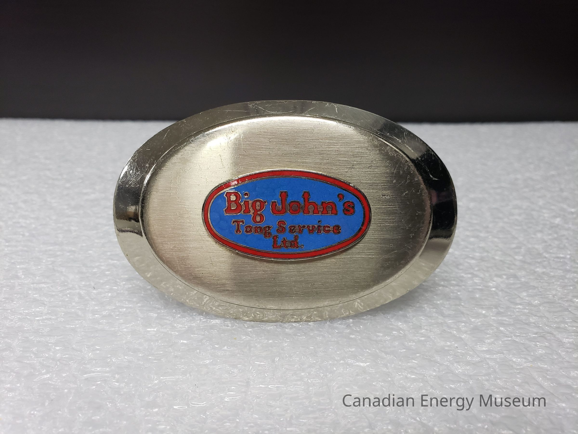 Old Description (Kelsey Dalrymple, 3 June 2020): Big John's Tong Service Ltd. Steel oval belt buckle with blue enamel on face, red text.Collection