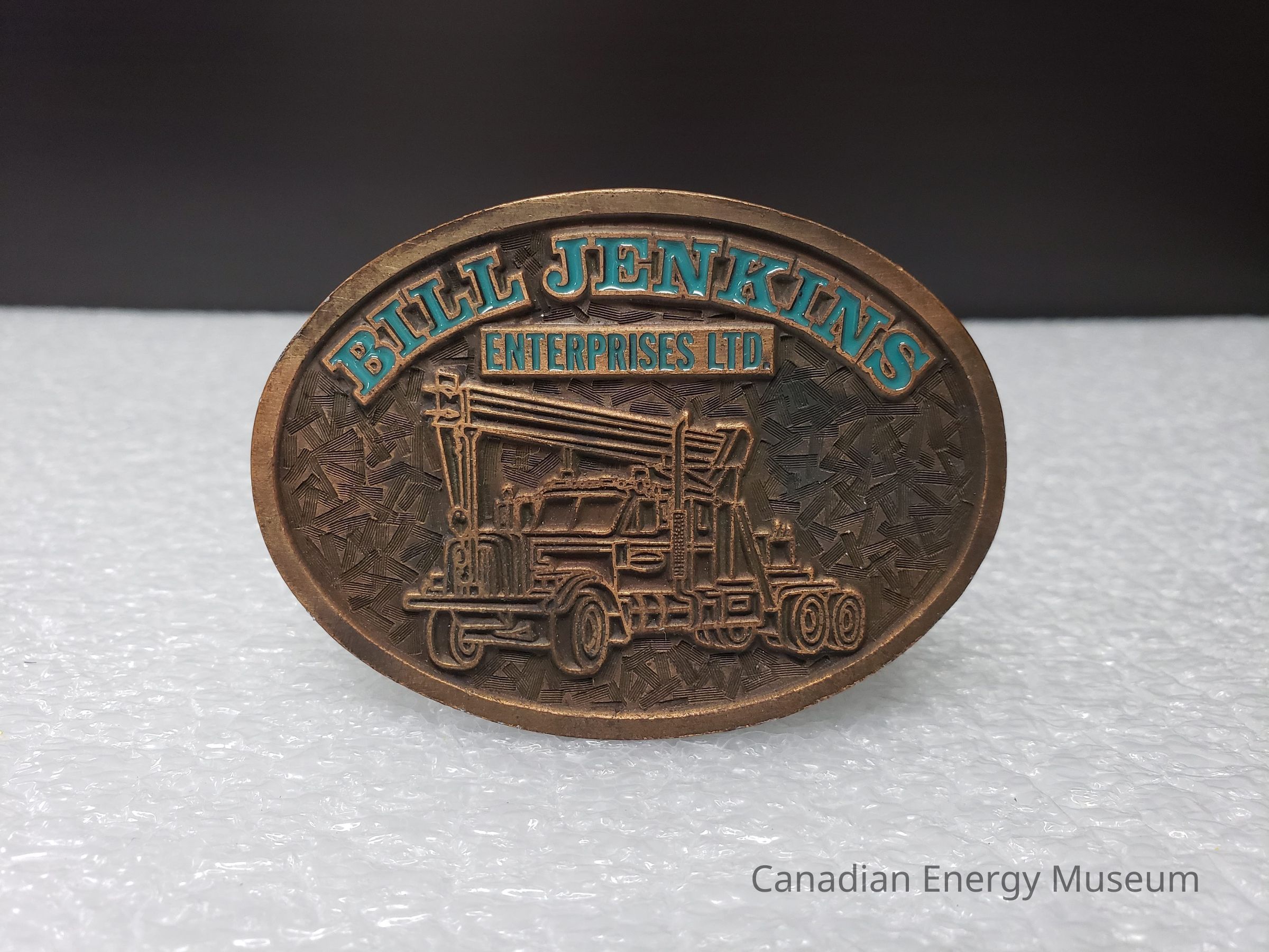 Old Description (Kelsey Dalrymple, 3 June 2020): Bill Jenkins Enterprises Ltd. Oval brass belt buckle with blue enamel text, truck in center.Collection