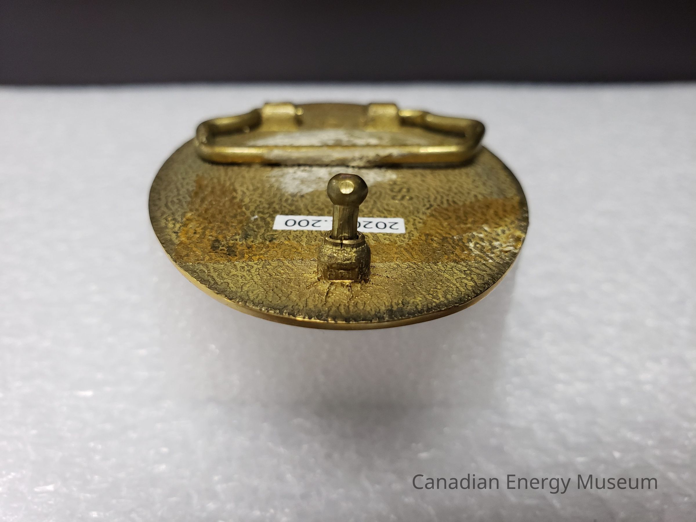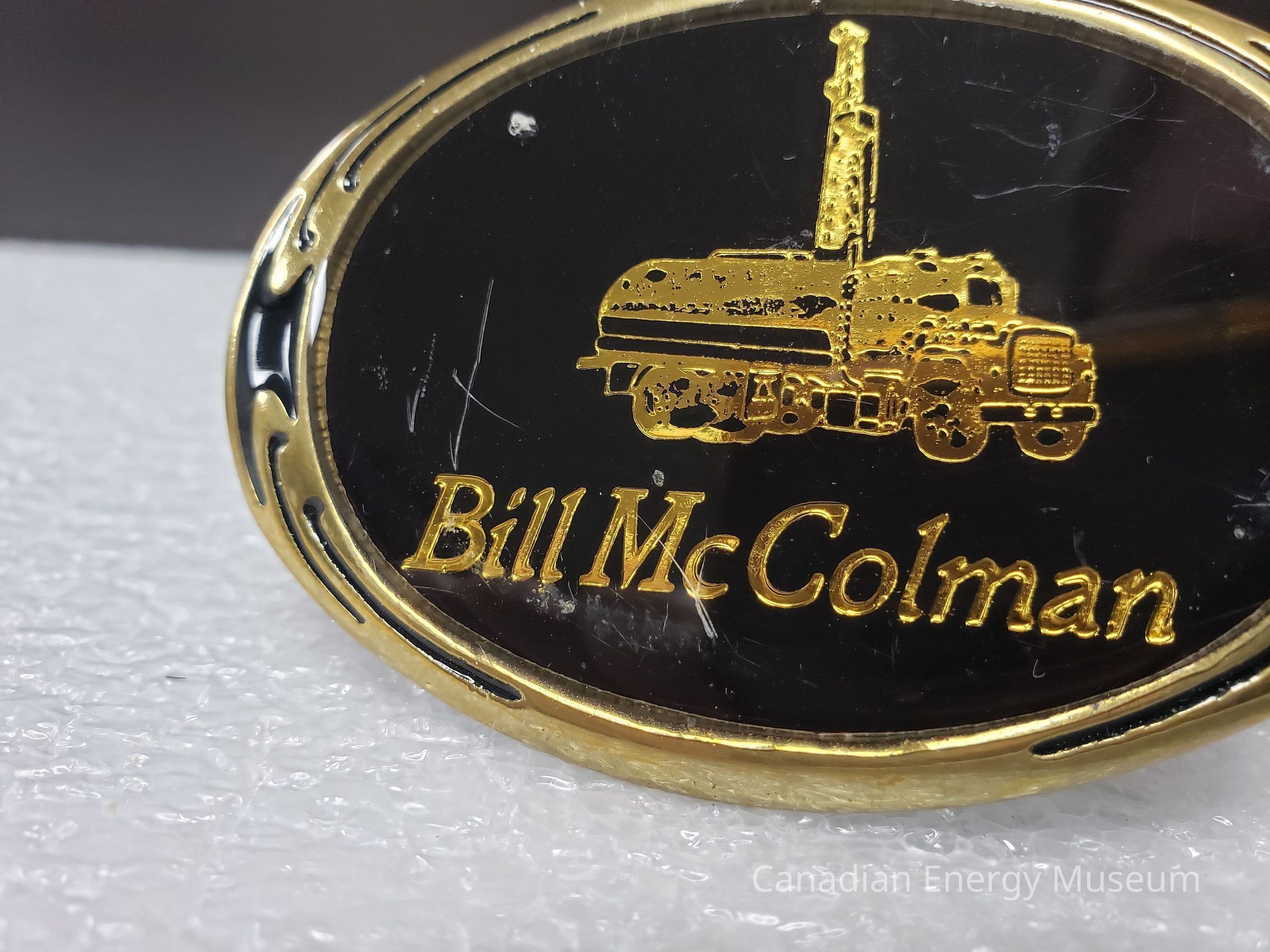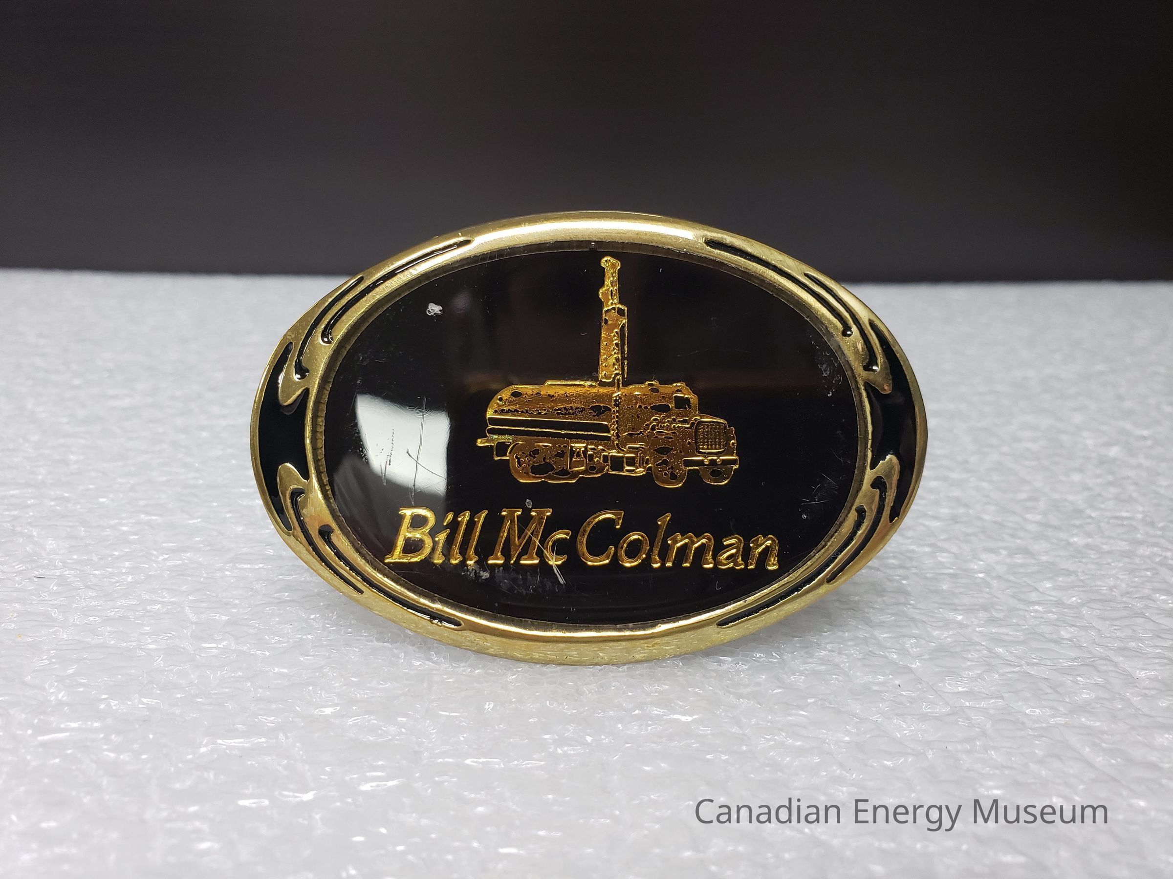 Old Description (Kelsey Dalrymple, 3 June 2020): Bill McColman. Brass oval belt buckle with black enamel face, gold tanker truck in center (Donated by Gordon McQuaig).Collection