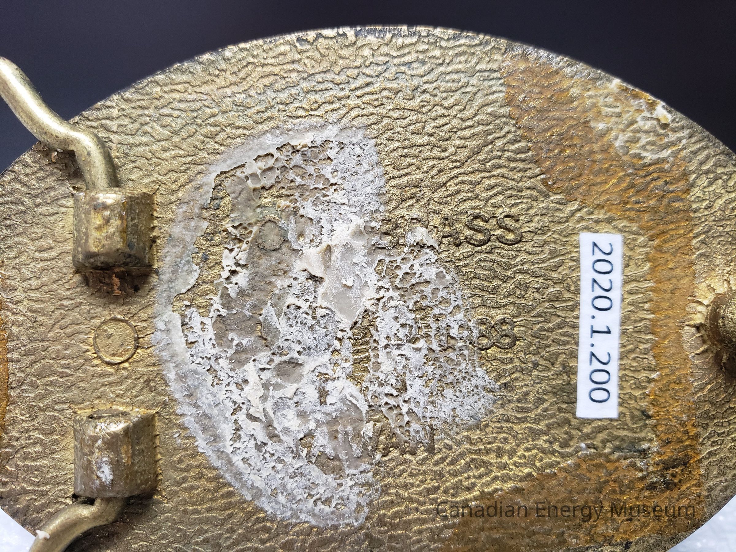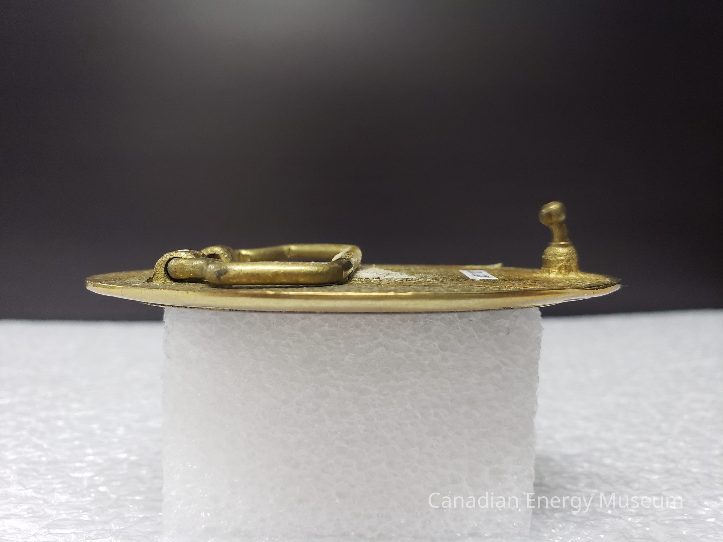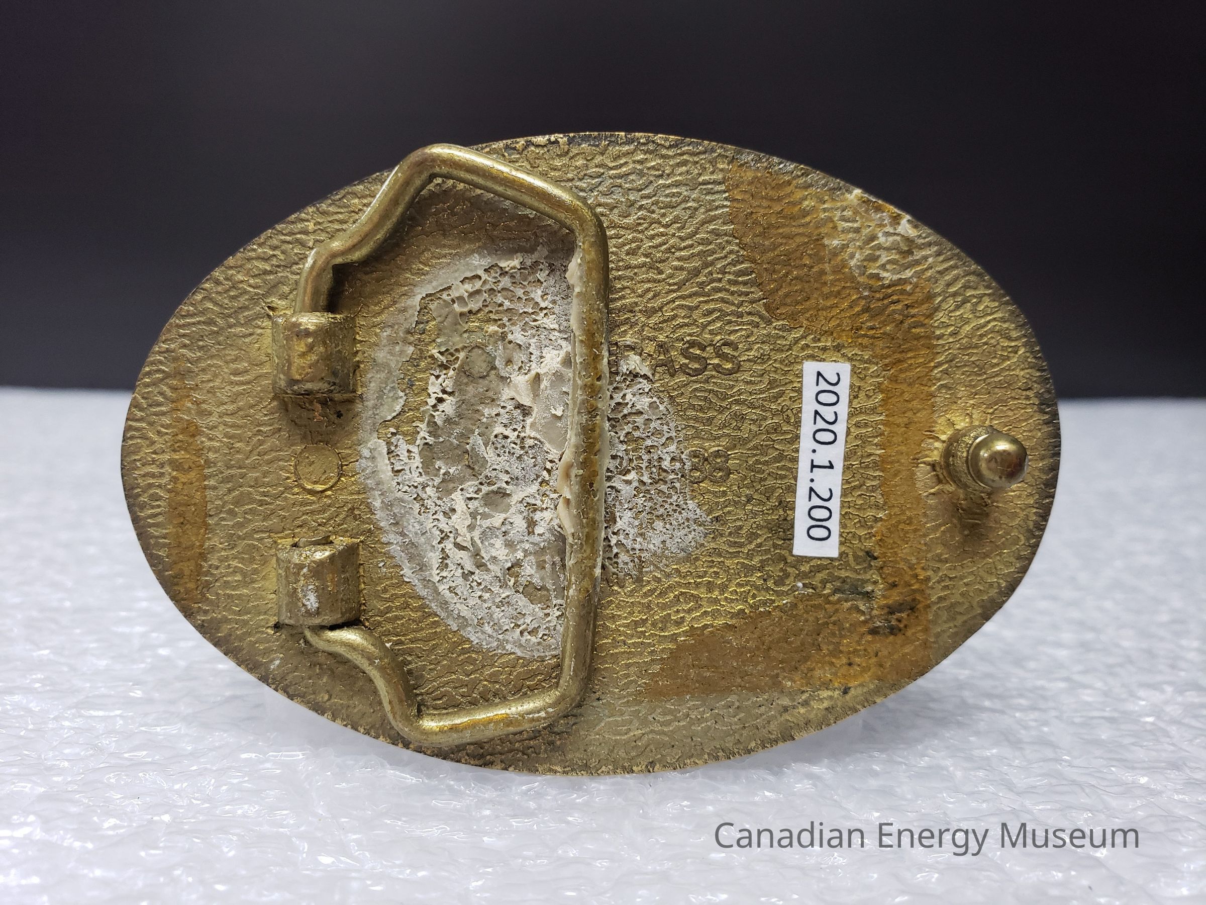 Old Description (Kelsey Dalrymple, 3 June 2020): Bill McColman. Brass oval belt buckle with black enamel face, gold tanker truck in center (Donated by Gordon McQuaig).Collection