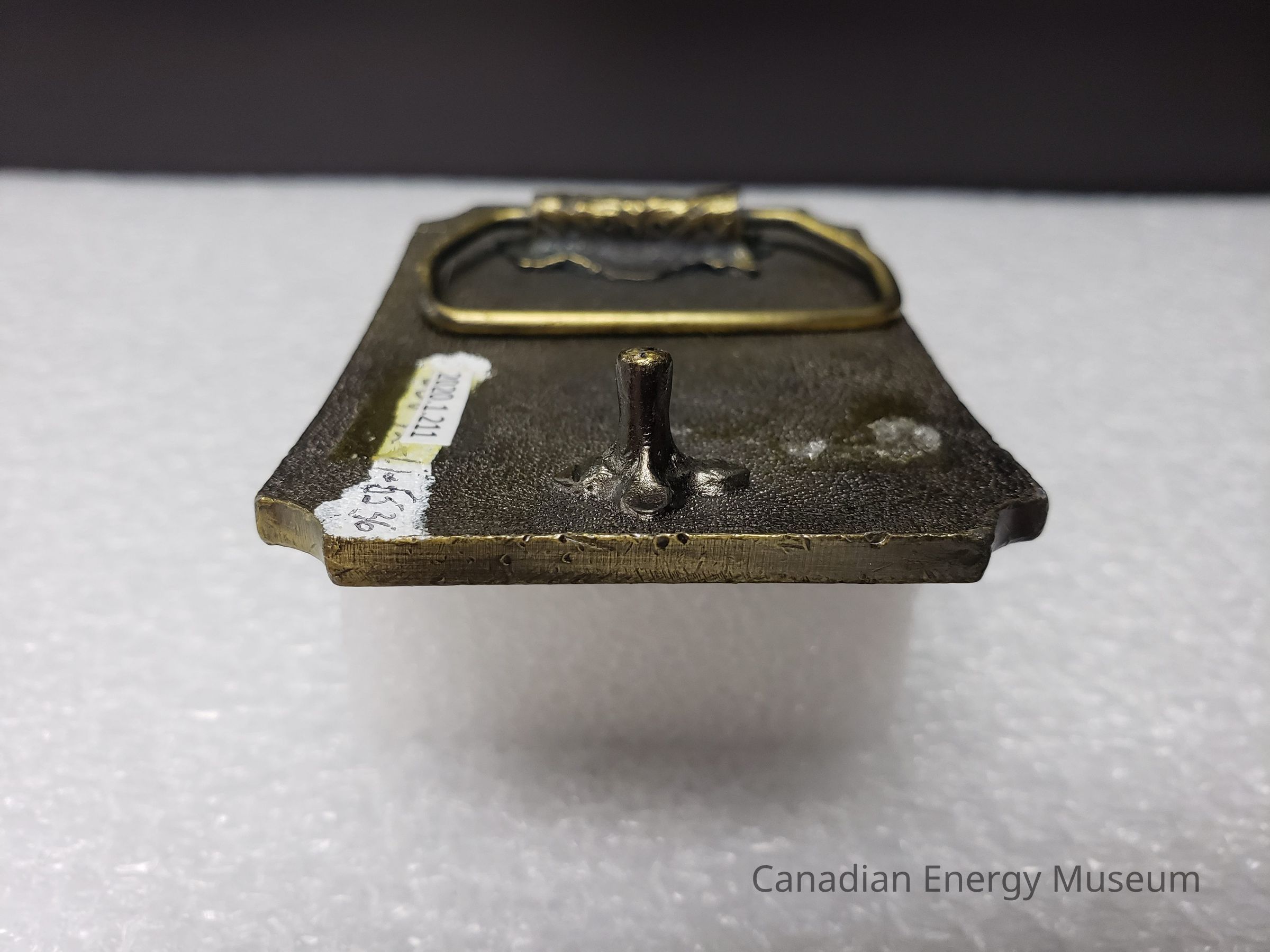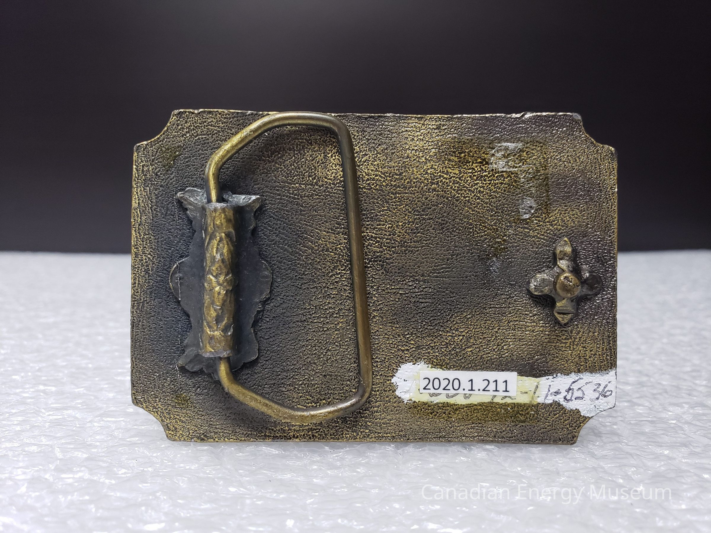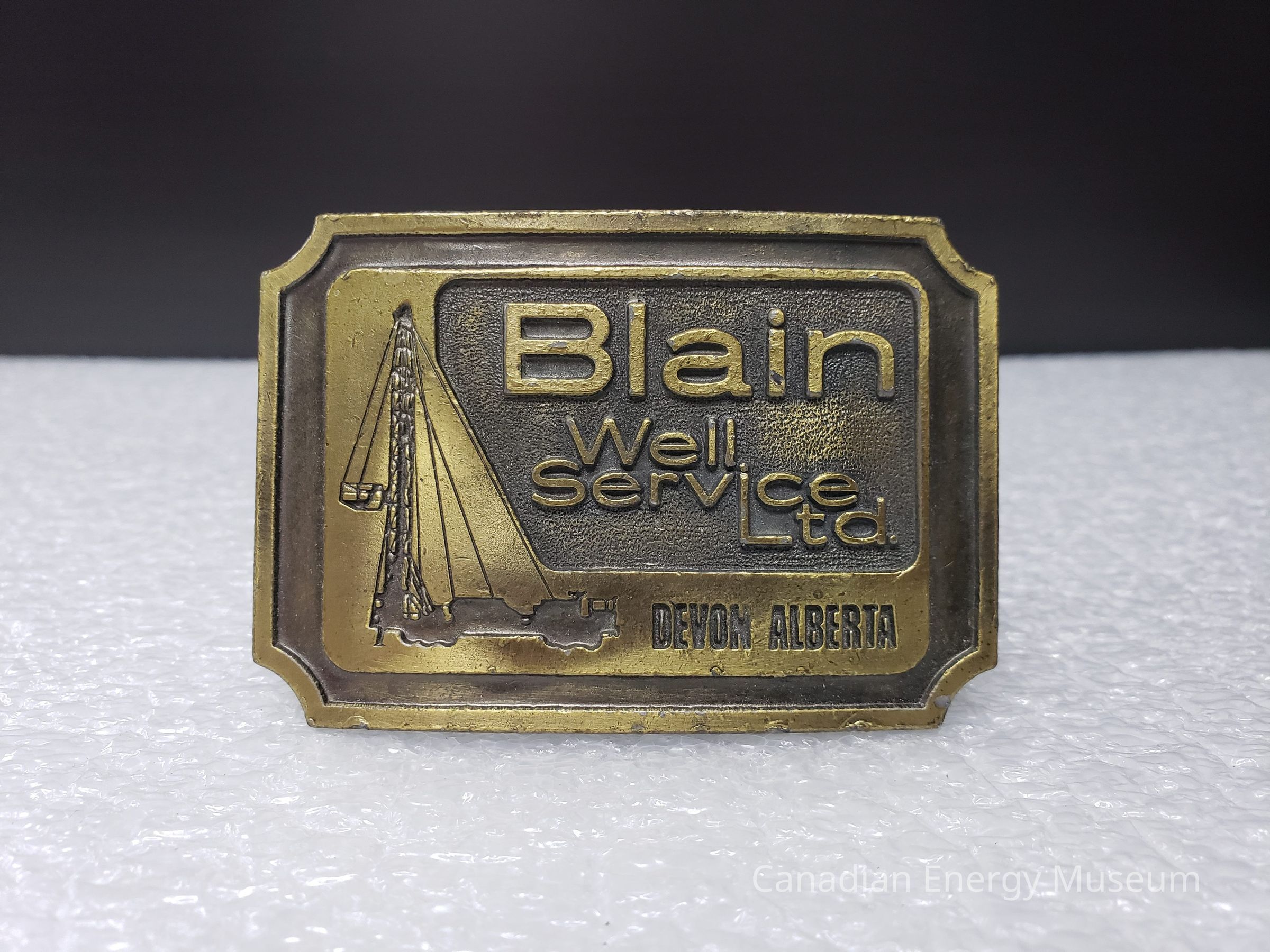 Old description (Kelsey Dalrymple, 6/3/2020): Blain Well Service Ltd. Devon, Alberta. Brass rectangular belt buckle. Service rig on left.Collection