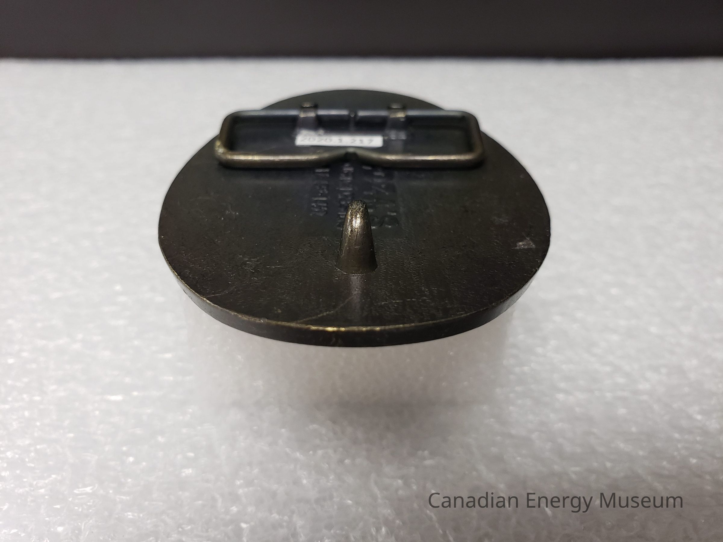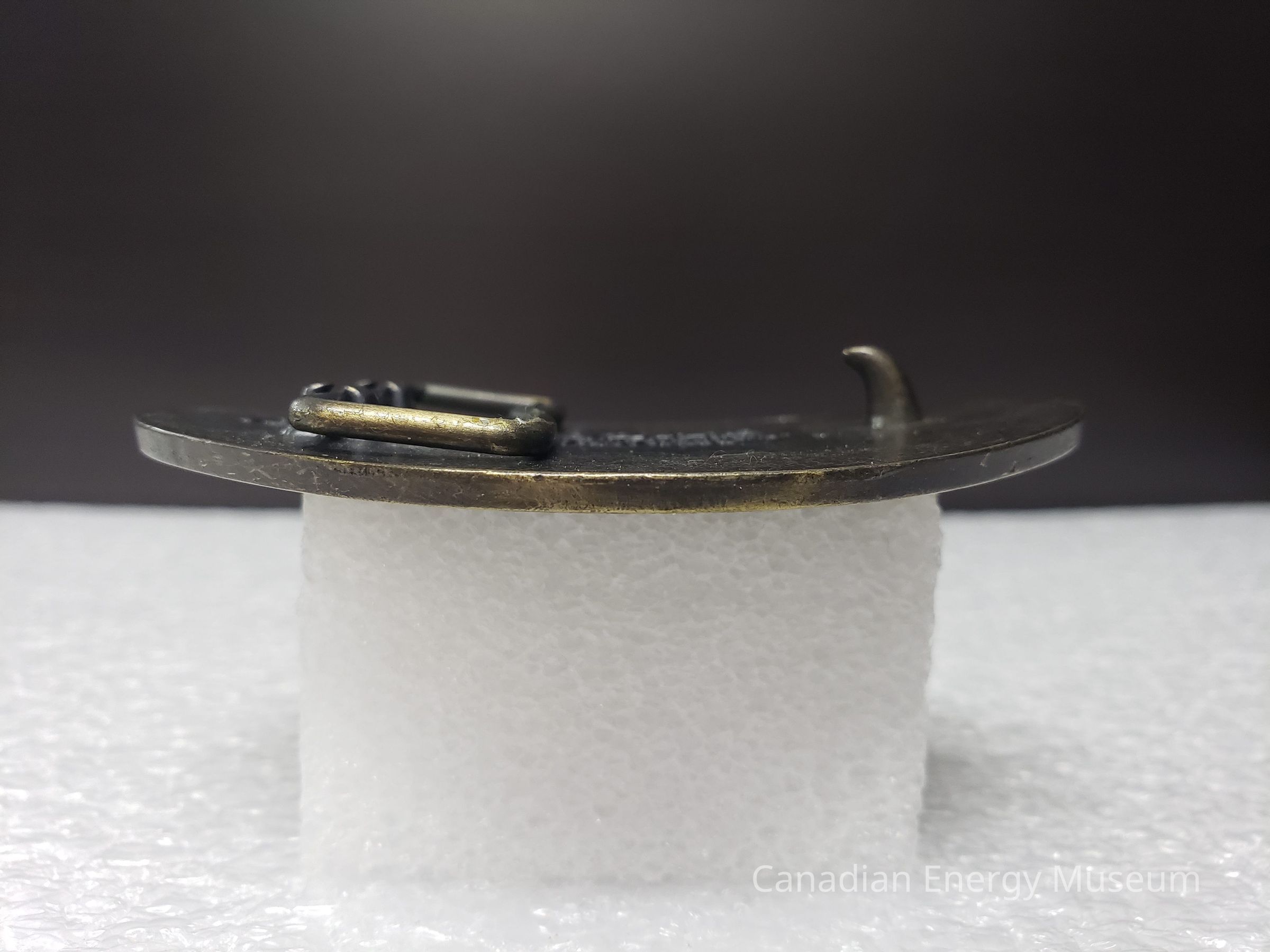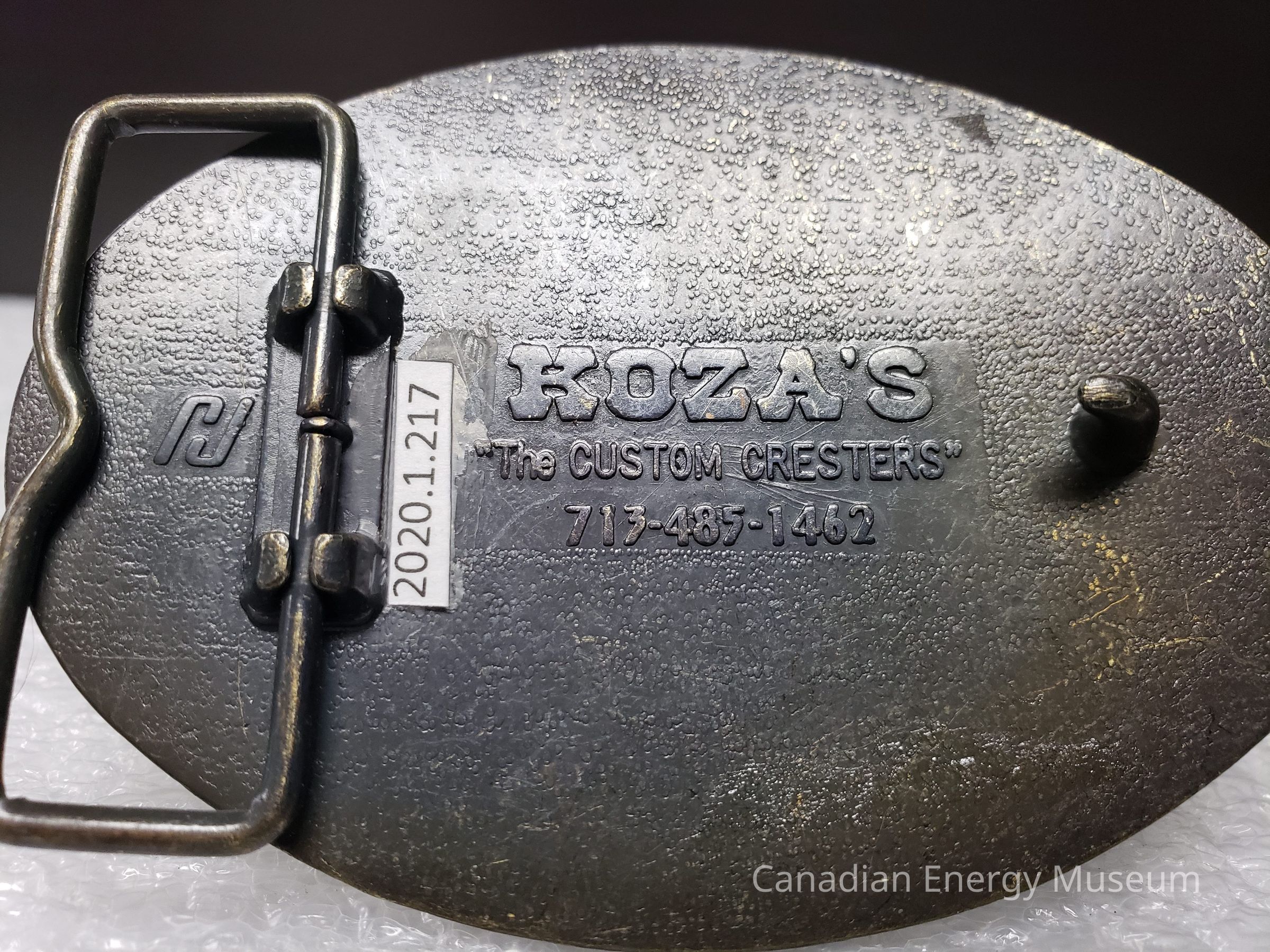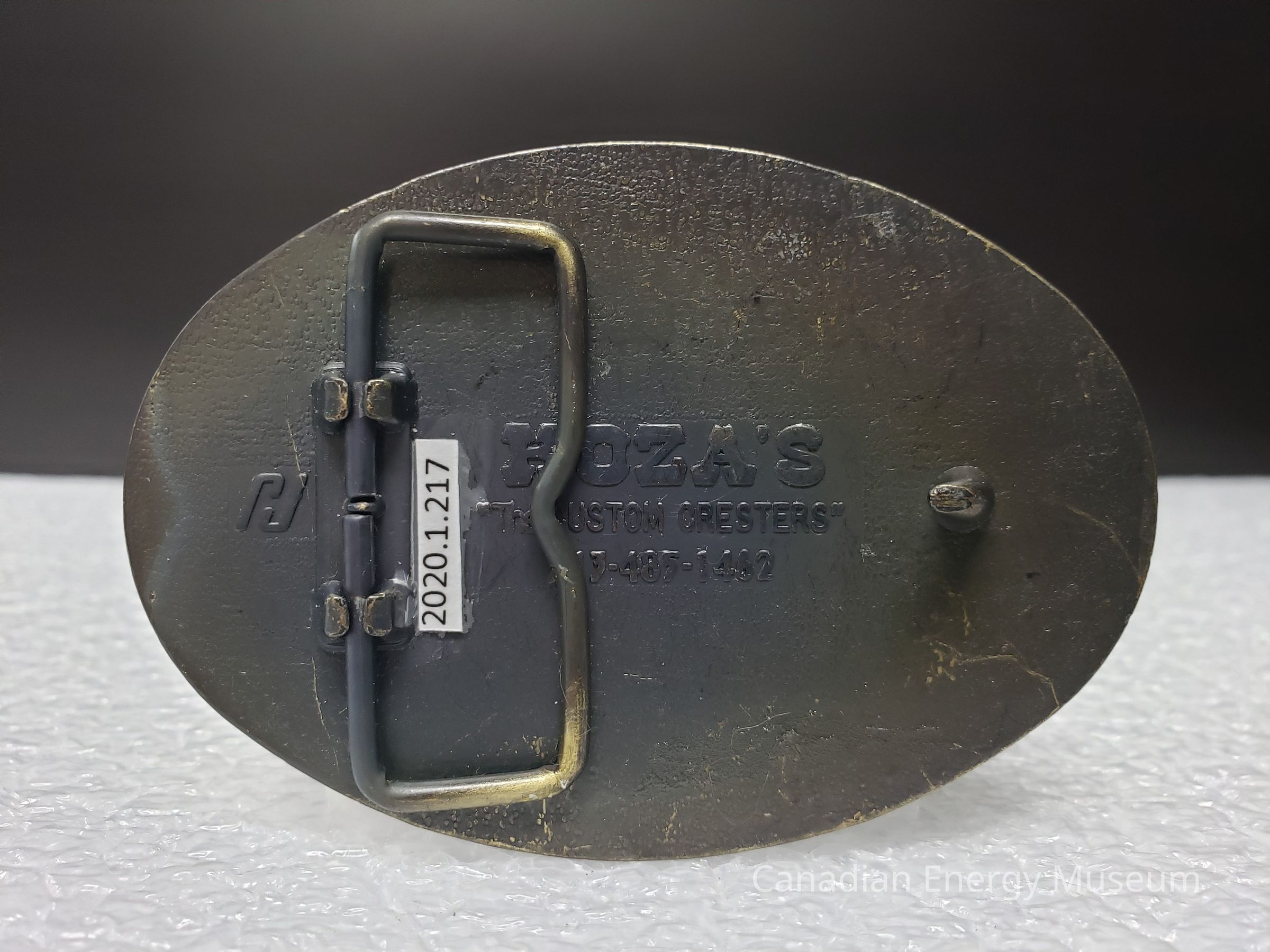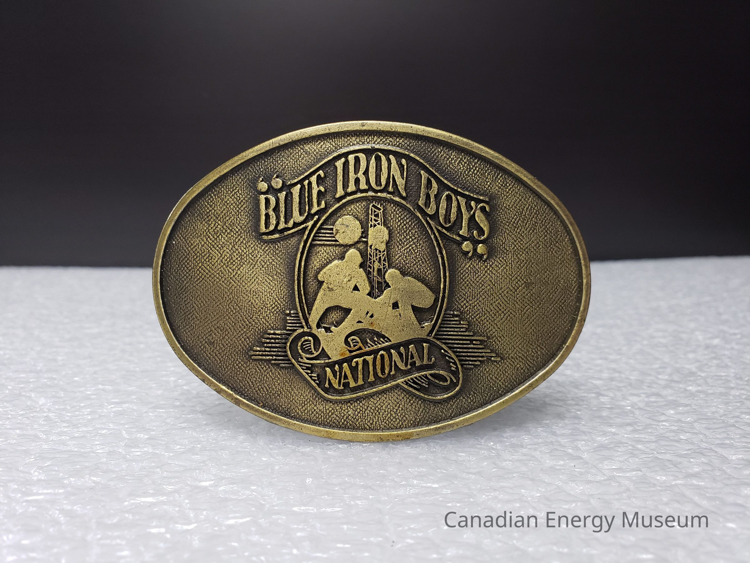 Front Design: Main surface has speckled cross-hatch texture. The center of the buckle Feature Text across the top of the main logo arched to match the curve of the center logo saying "BLUE IRON BOYS" with a conforming line across the top of the text. In the top left corner of the text and the bottom right corner, their are quotations mark. The true center has silhouette of two oil workers in motion on the same protrusion level as the text. In a lower layer behind the worker is an oil tower tall enough to have a box ledge showing height. to the left of the tower is a sun with five line going through it. Below the worker is a scrolled ribbon running diagonal to the oval with the text "NATIONAL" on the inside of the ribbon. To the side of the ribbon are a series of lines.