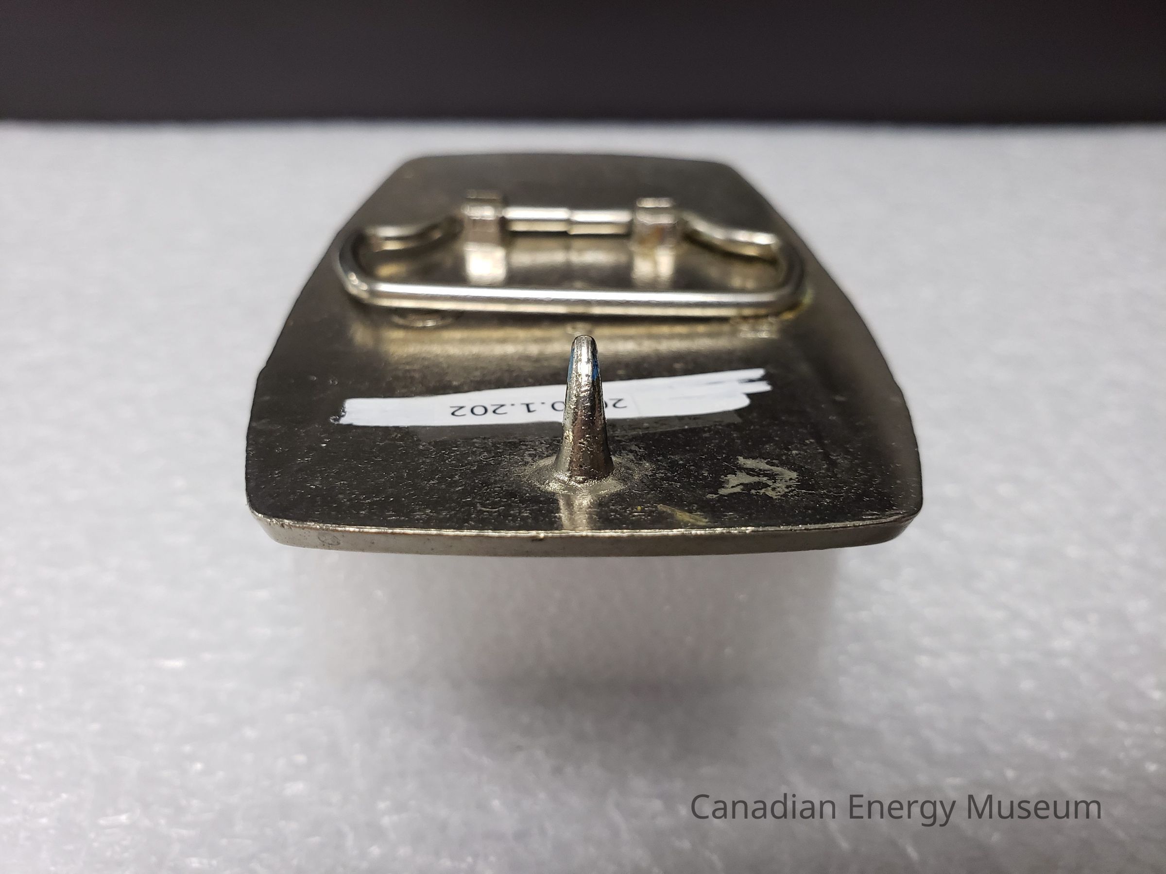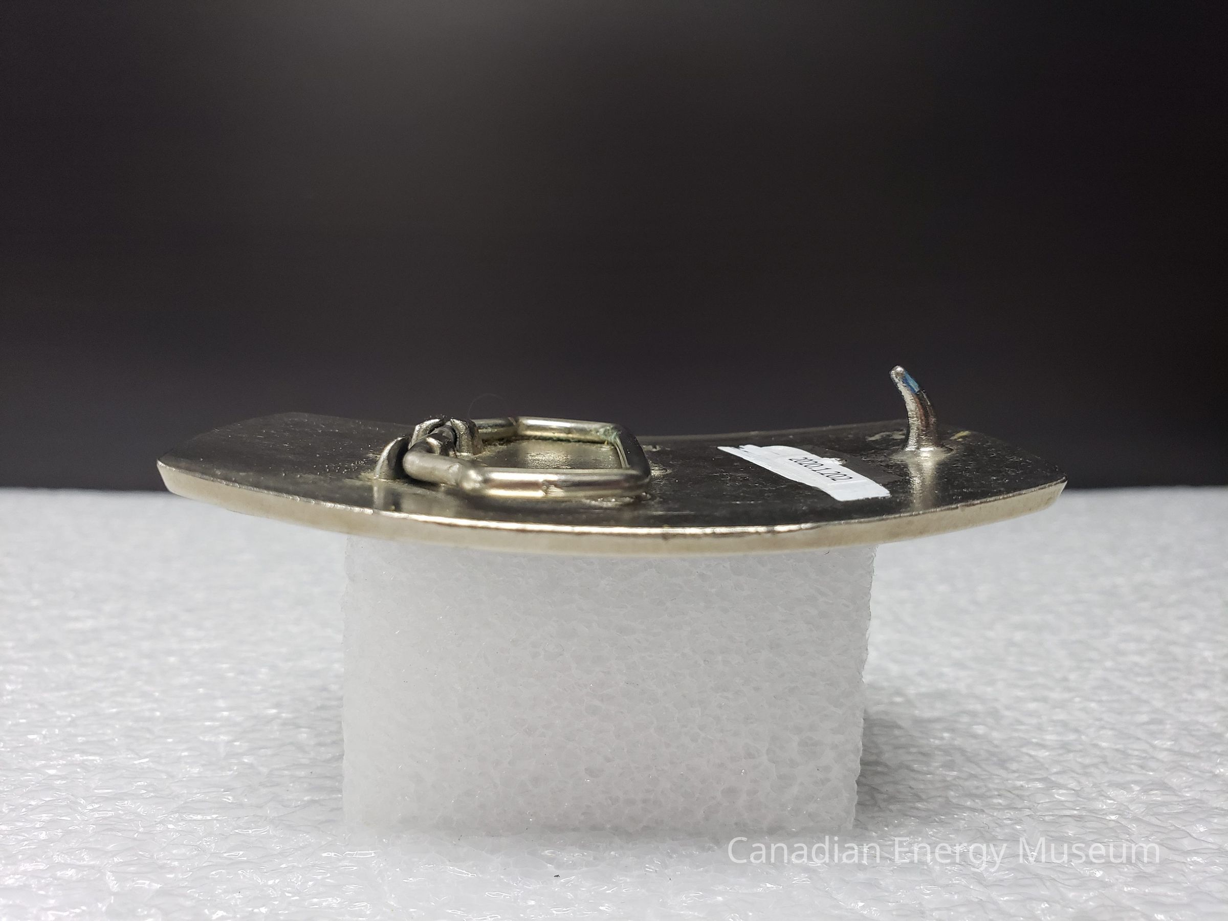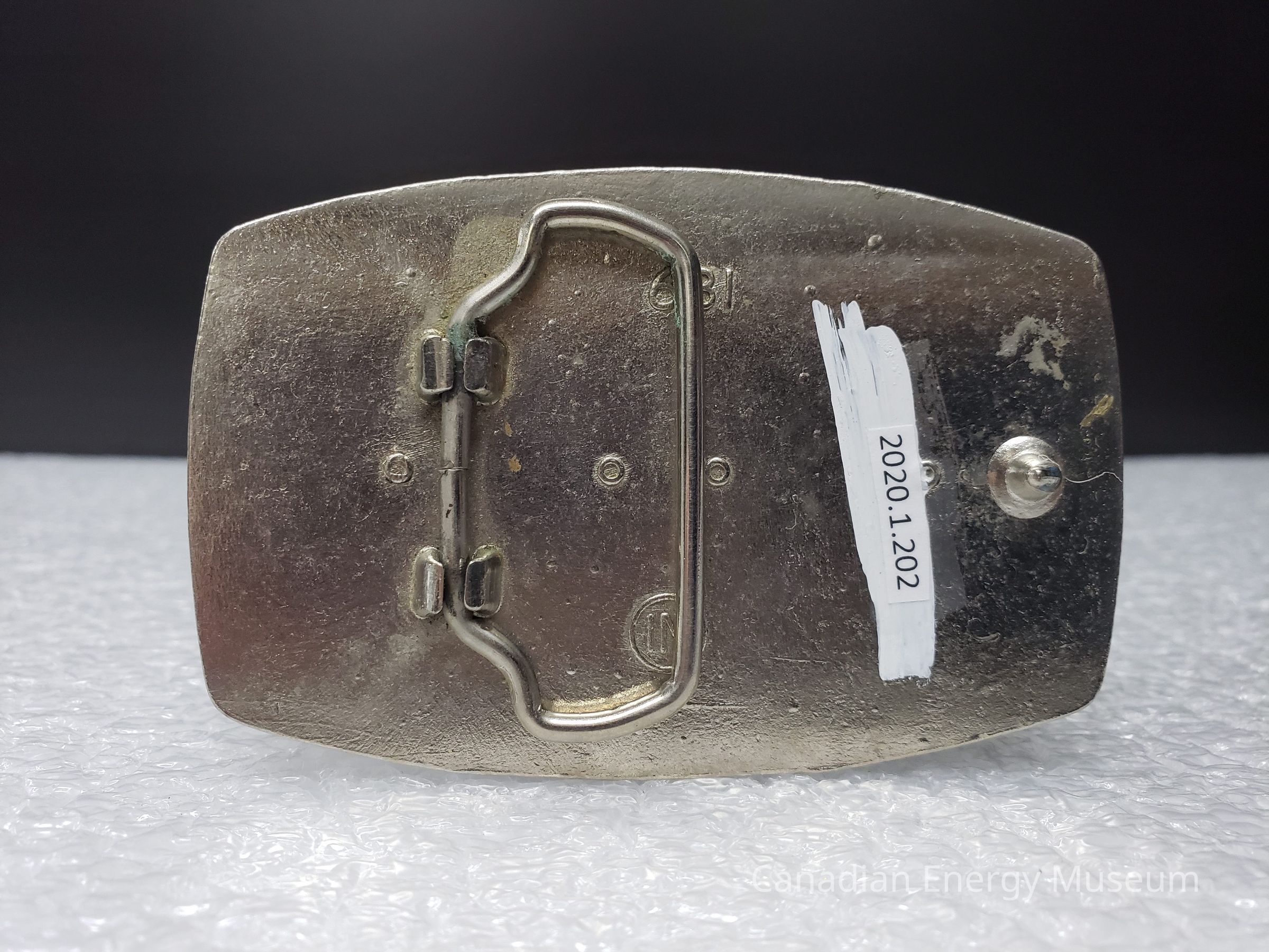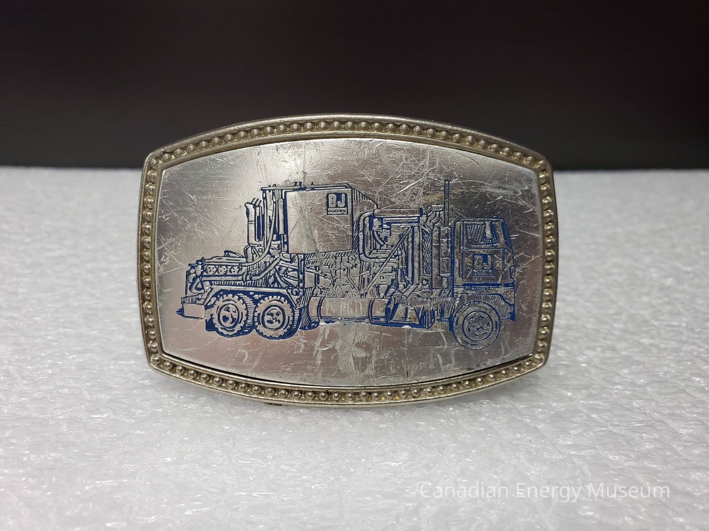 Old Description (Kelsey Dalrymple, 3 June 2020): BJ Hughes. Steel belt buckle with blue illustration of truck. 681 on back.Collection