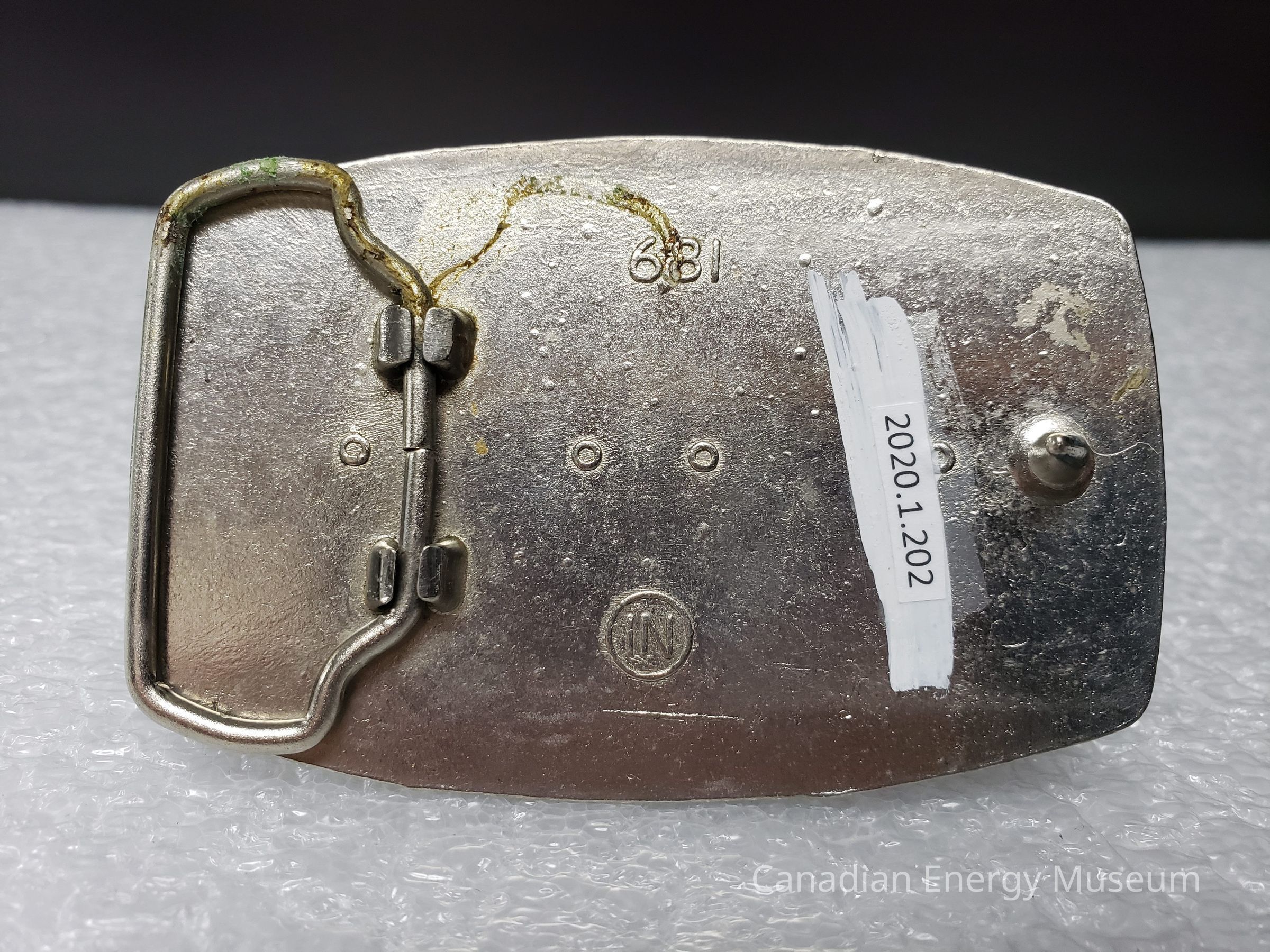 Back Elements: The back has a mostly smooth (imperfect finish) texture, with a curved and tapered hook, and a irregular hexagon hinge with indented base sides and connected to the buckle at two points. Between the hinge and hook are two raised elements: the numbers "681" (at top)and the letters "IN" inside a circle (at bottom). Also present in the centre of the back are two four small rings, possibly from the molding process.
