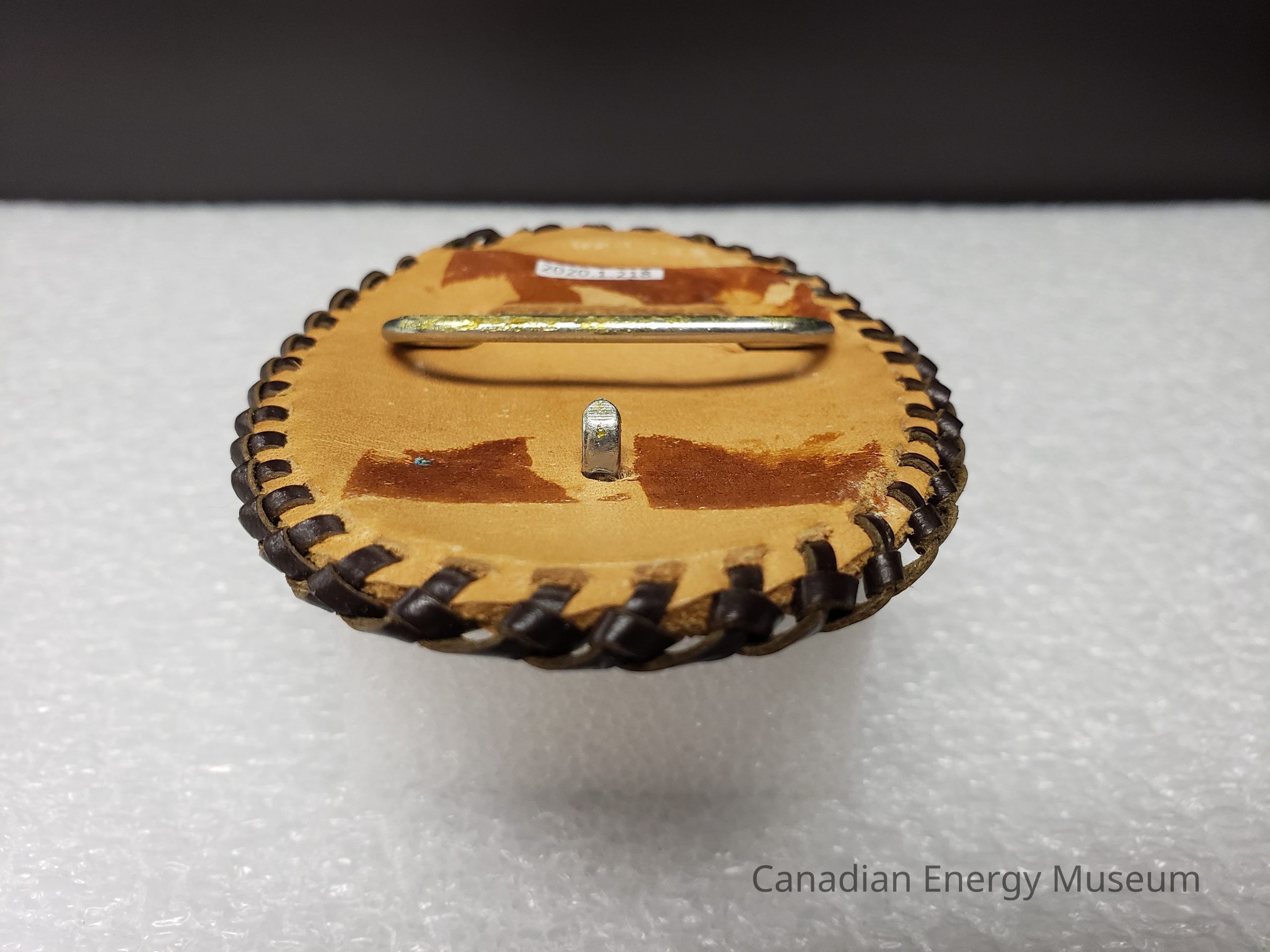 Features: An oval belt buckle made from metal with a custom leather covering. The buckle is concave in shape.