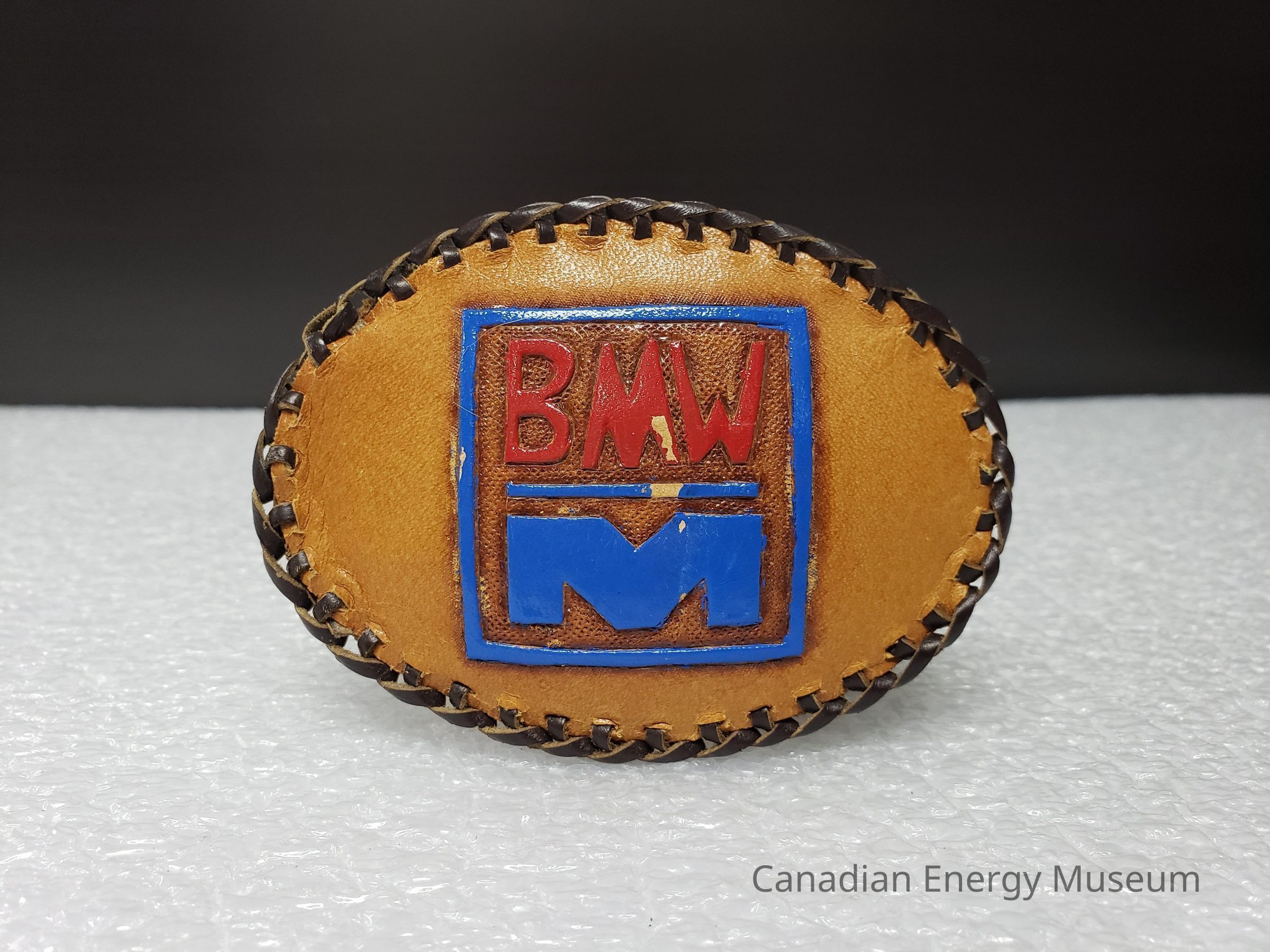 Old Description: (Kelsey Dalrymple, 3 June 2020) BMW Monarch. Leather oval belt buckle with red and blue text.Collection