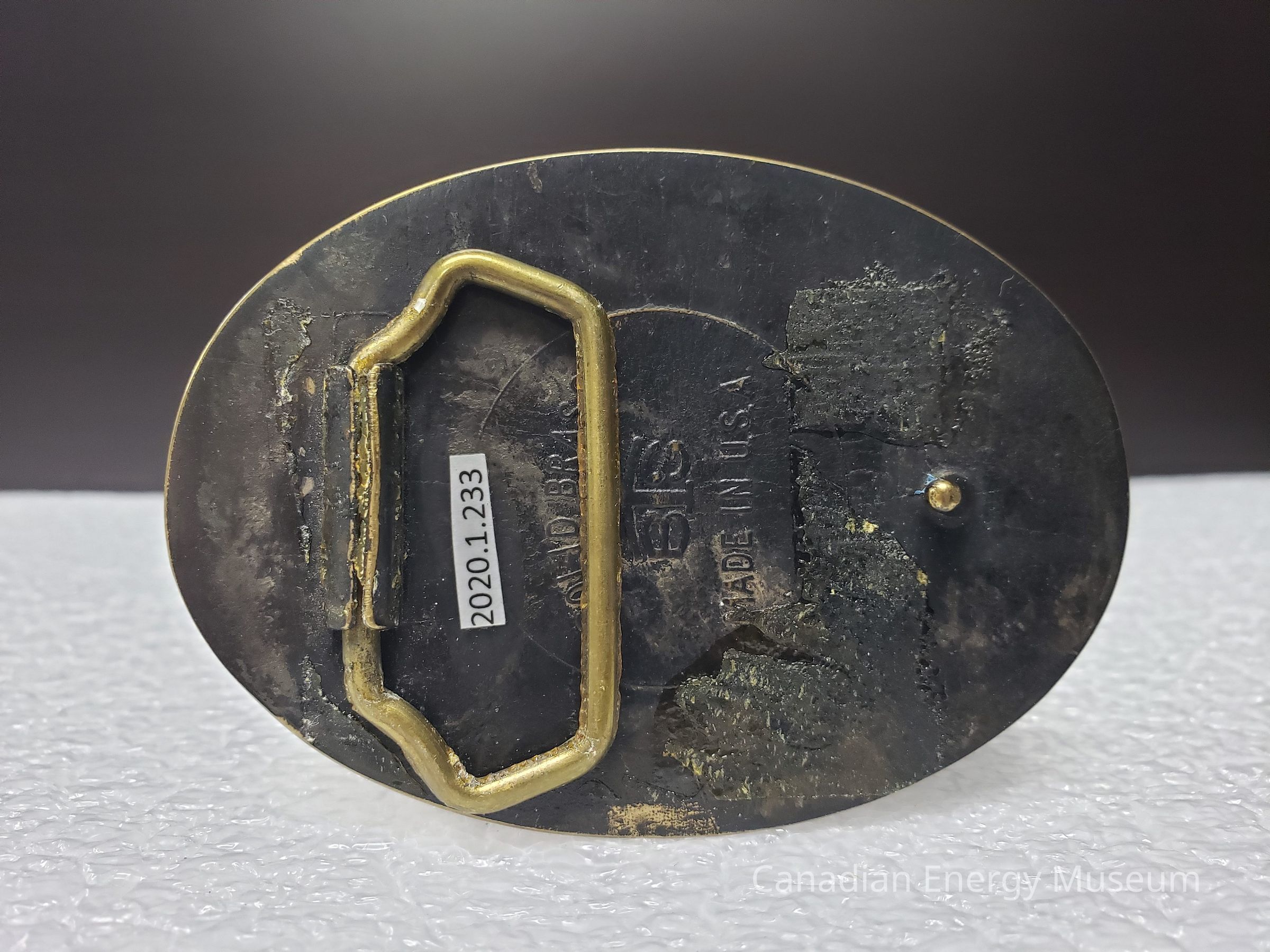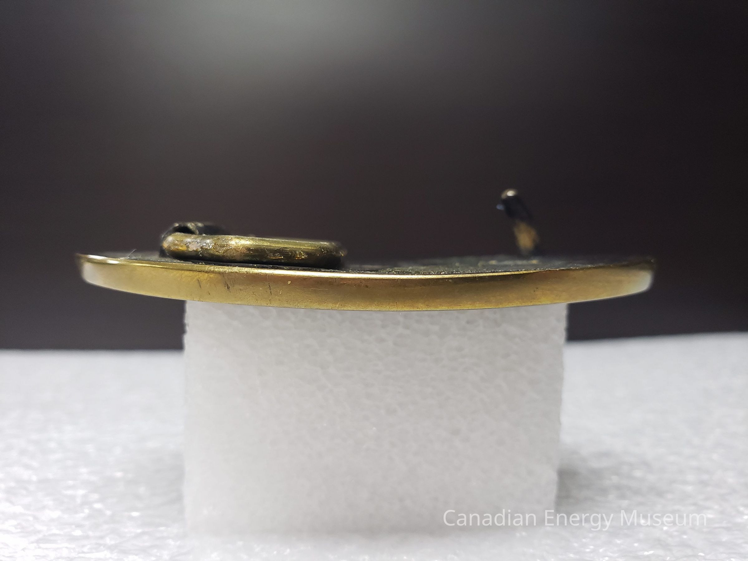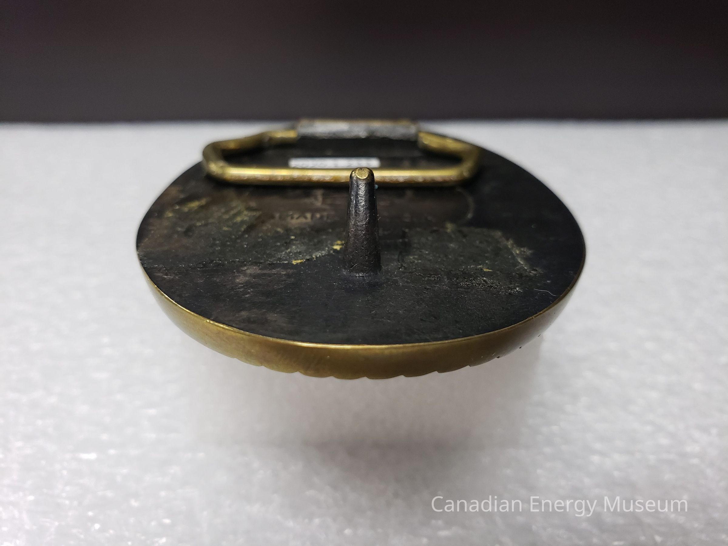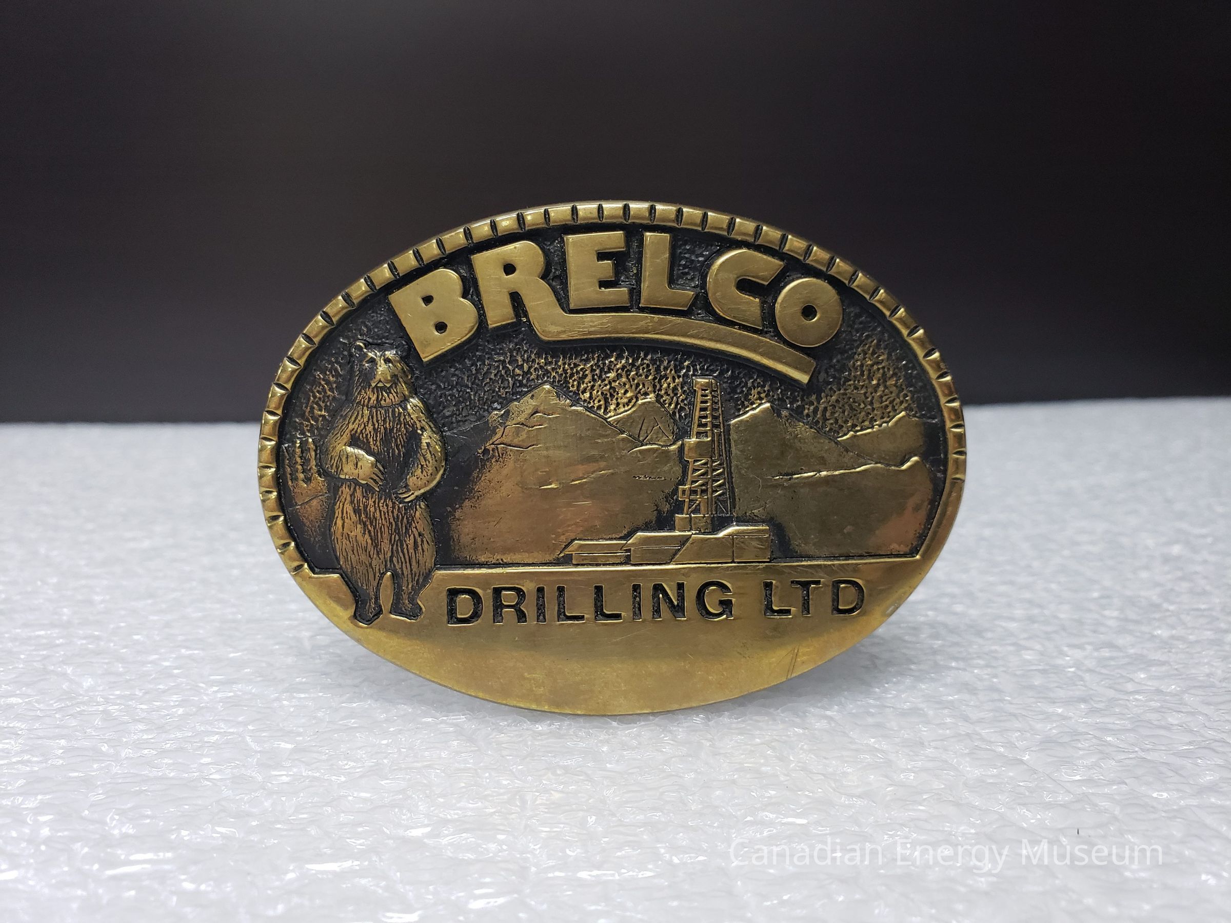 Old Description (Kelsey Dalrymple, 3 June 2020): Brelco Drilling Ltd. Oval brass belt buckle with bear on left. Rig in front of mountains in centre.Collection