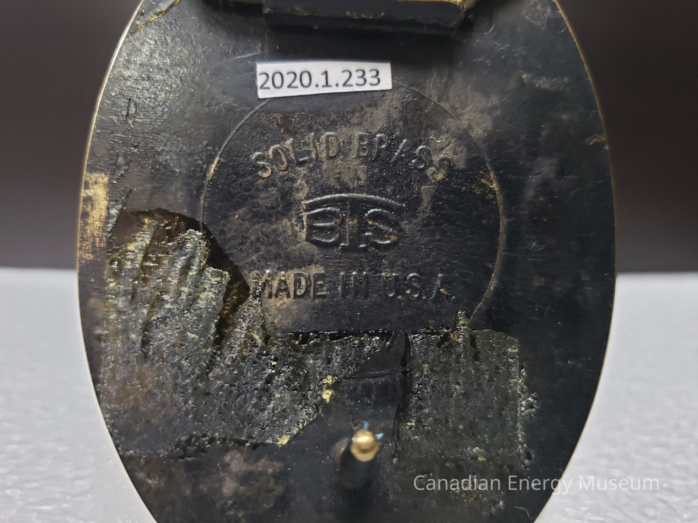 Back Elements: The back has a weathered textured with a slightly raised circle in the centre. The hook is rounded and curved, and the hinge is an elongated trapezoid connected to the buckle in one spot. In-between the hook and the hinge is the circle, in the middle of the circle is text reading "SOLID BRASS BTS MADE IN U.S.A".