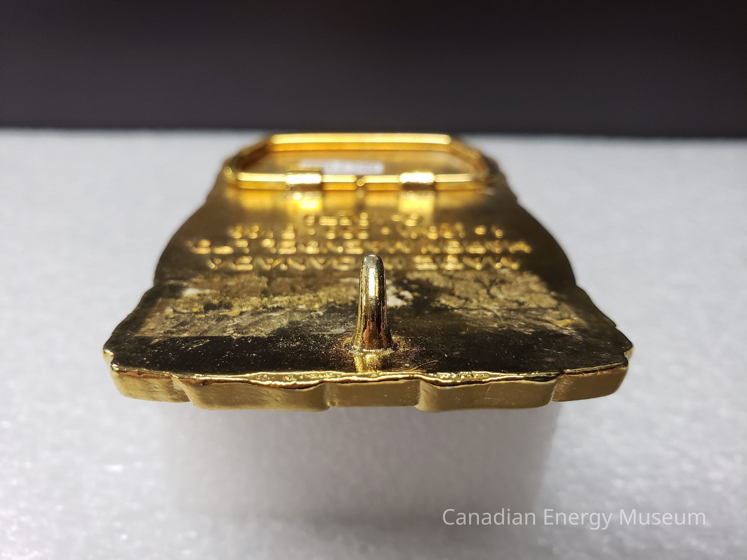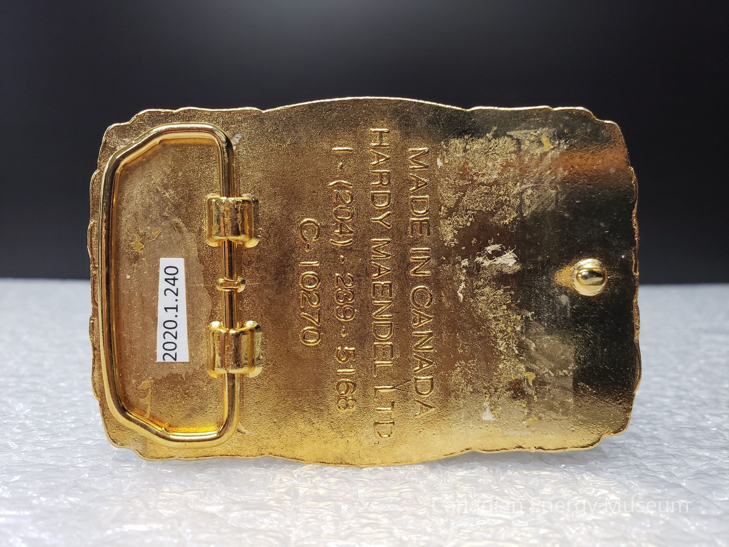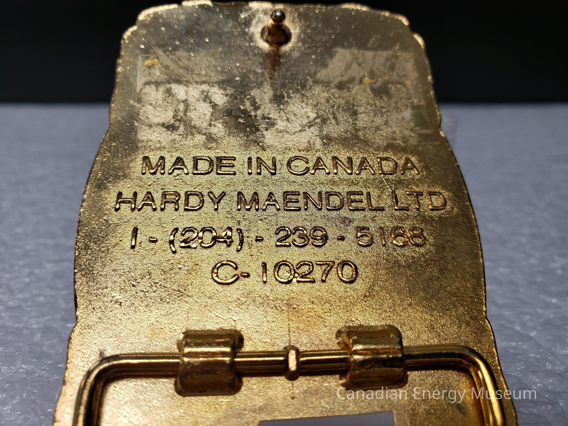 Back Elements: The back is bright yellow gold, with a smooth texture. Included are a curved, tapered hook (right) and an irregular hexagonal-shaped hinge attached at two points. Between these elements are two vertical rounded strips (one long, one short) with the raised text "MADE IN CANADA HARDY MAENDEL LTD. 1-(204)-239-5168 C-10270"