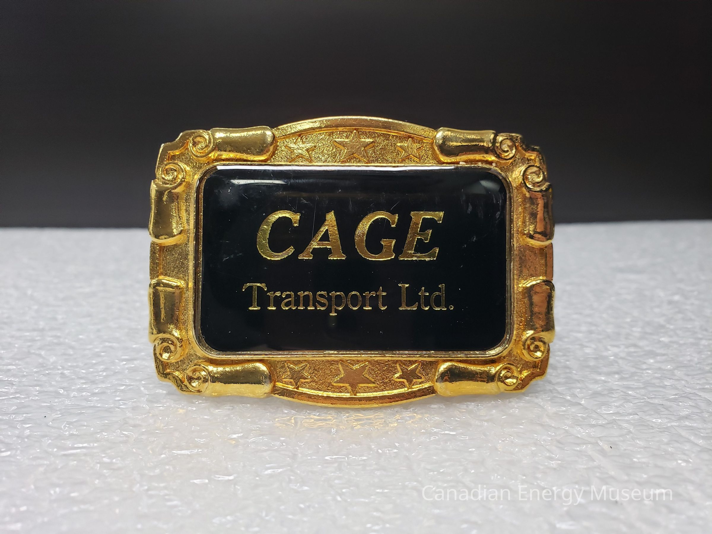 Old Description (Kelsey Dalrymple, 3 June 2020):Cage Transport Ltd. Rectangular brass belt buckle with black enamel face. C-10270. Company is from Taber, Alberta.Collection