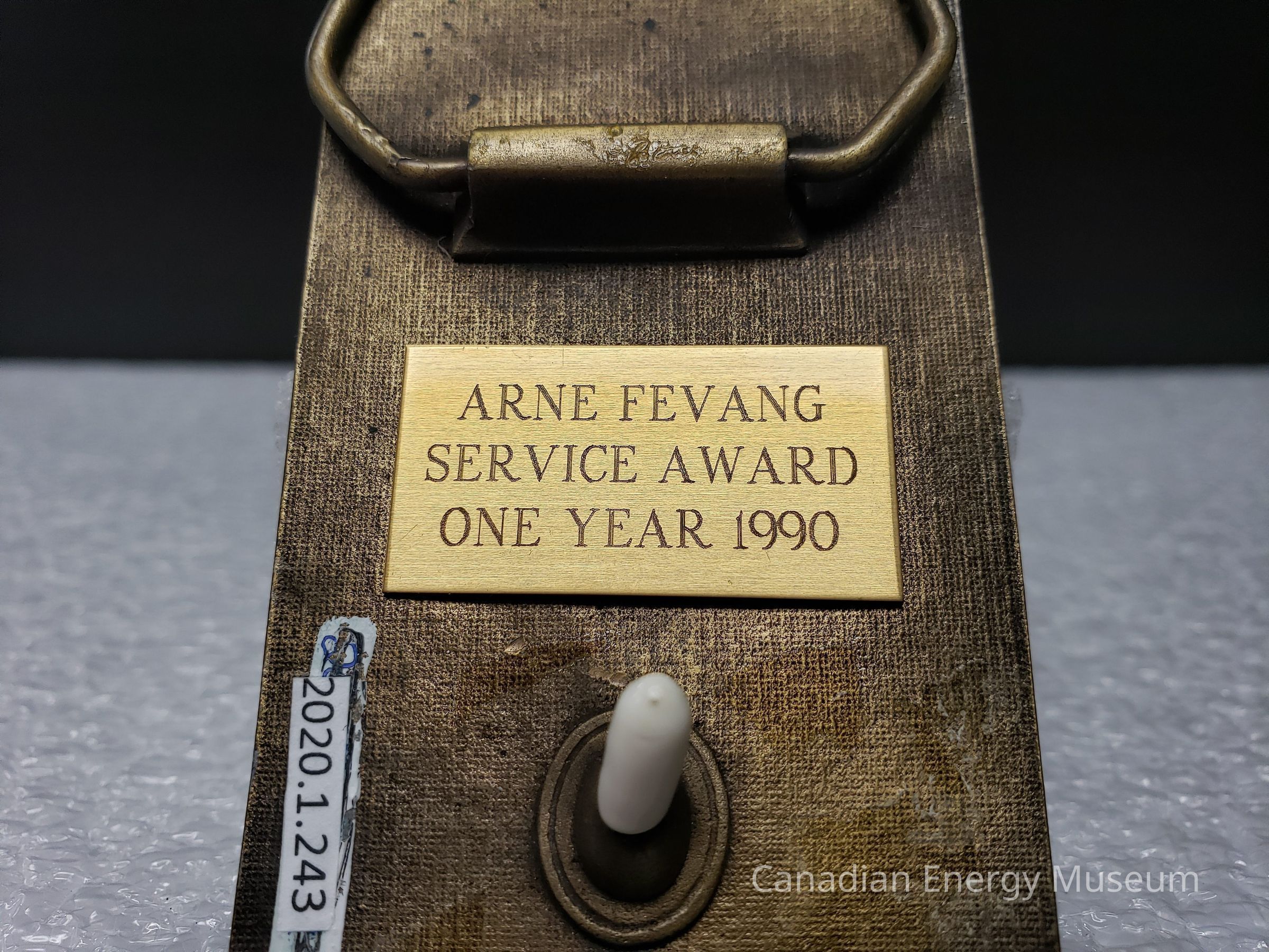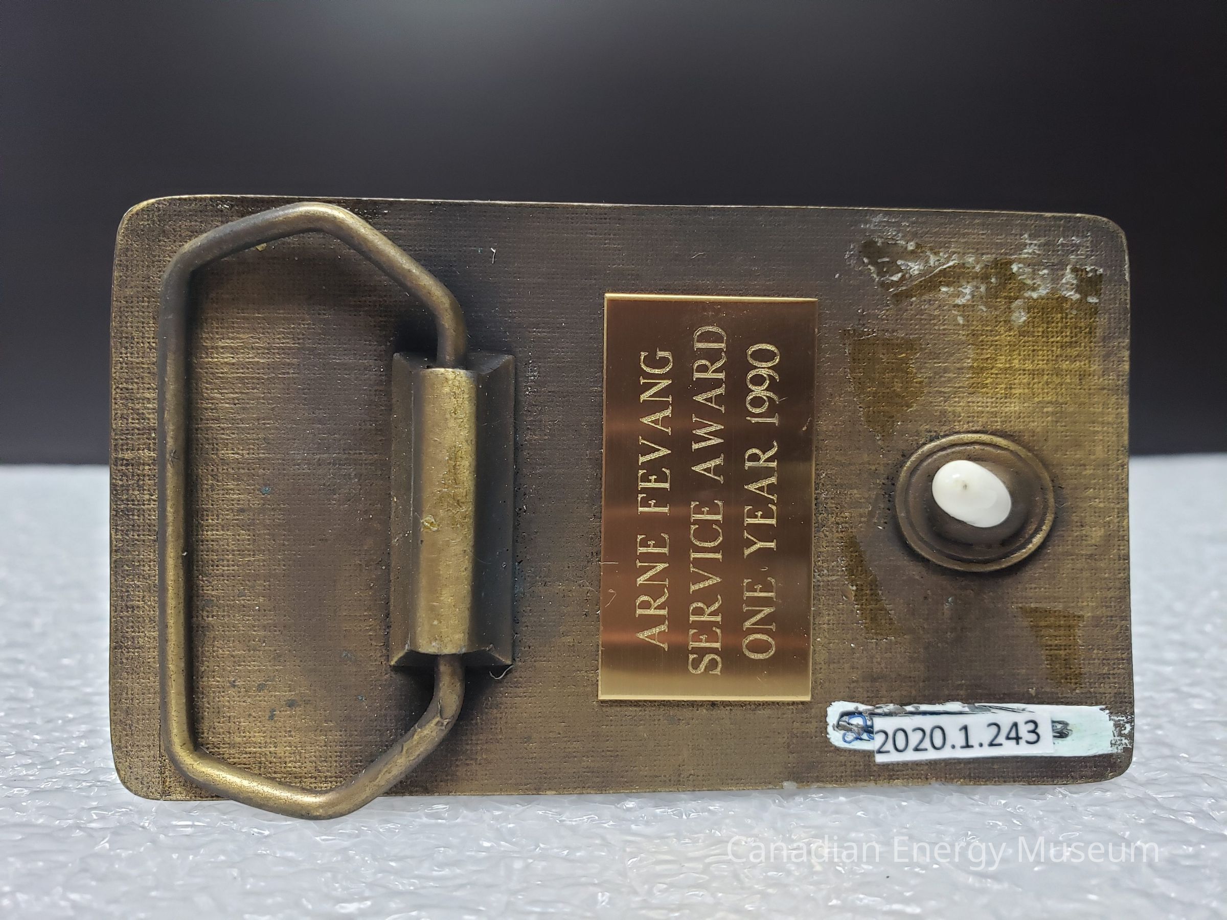 Canadian Crude Separators Ltd. Rectangular brass belt buckle. Name on back is Arne Fevang Service Award One Year 1990.Collection