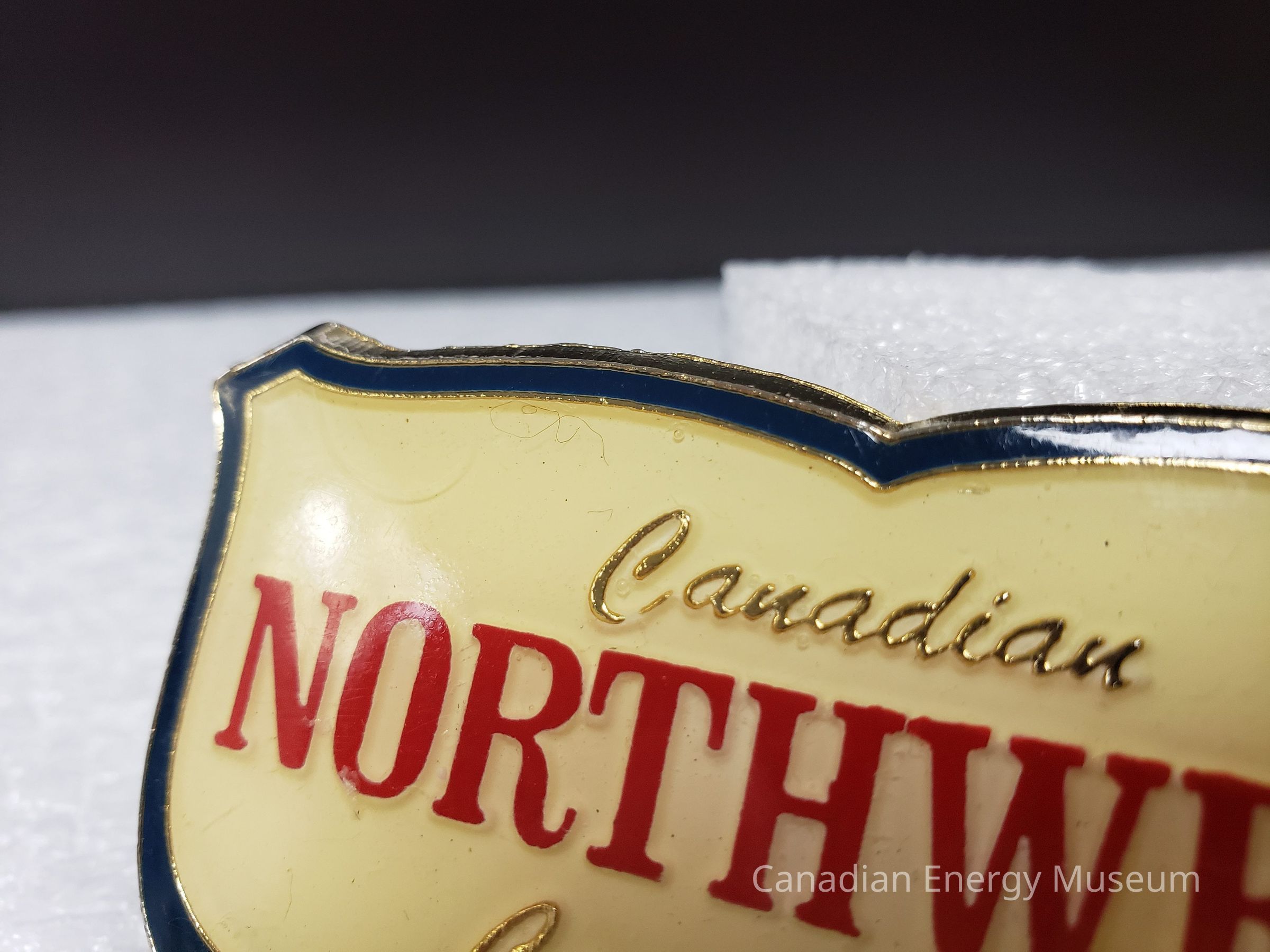 Front Design: The buckle has a broad rim painted bright gold with an inner boarder painted royal blue under the clear resin. (2mm wide at the top 4mm wide on the bottom) around the cabochon-covered central content. The bottom corners are rounded with the top corners pulled and pointed outwards. In the central area is a white beige fill with gold and red printing "Canadian Northwest Carriers Inc. The cabochon is clear, likely made of resin.