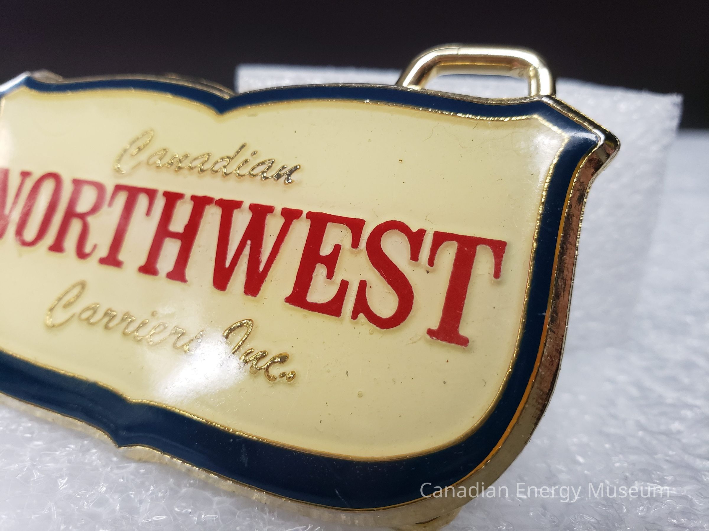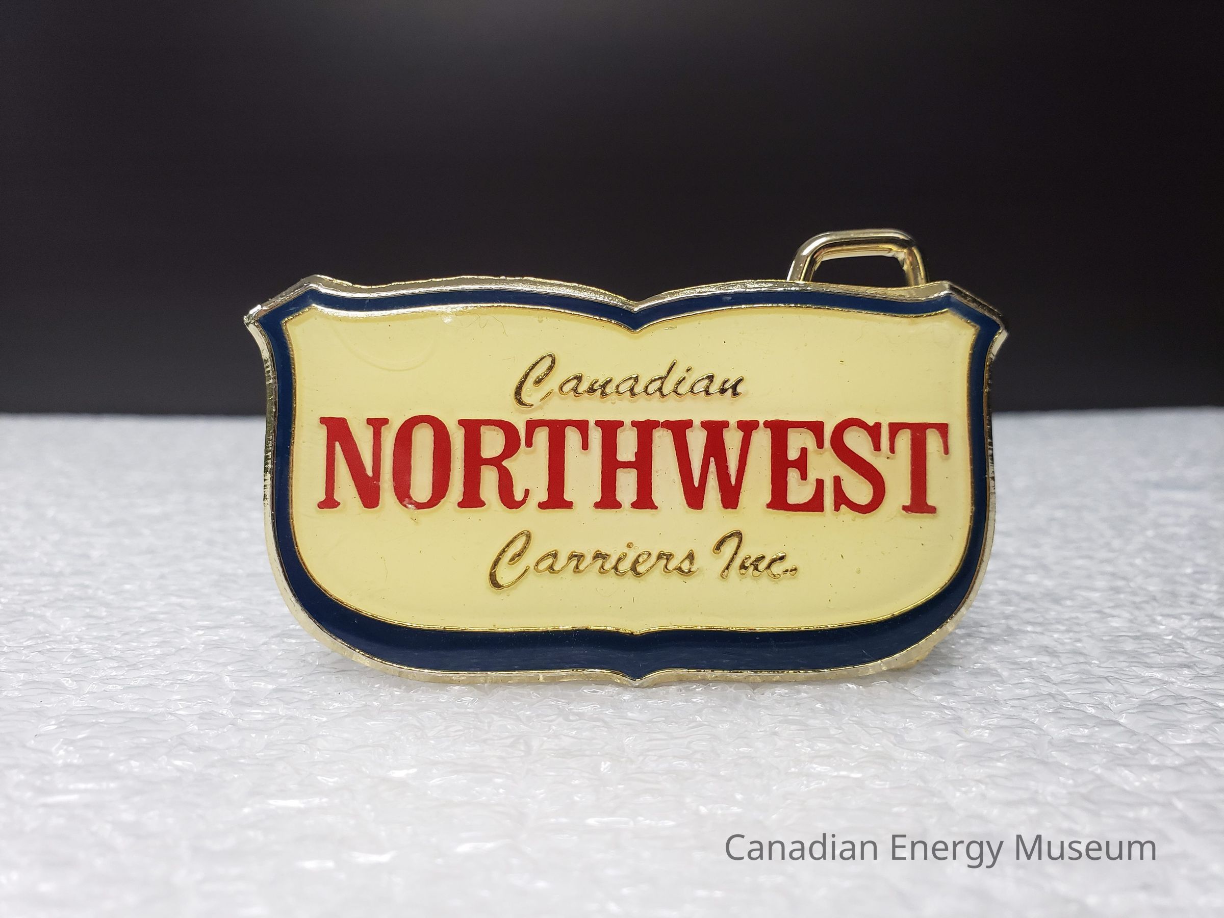 Old Description (Kelsey Dalrymple, 3 June 2020):Canadian Northwest Carriers Inc. Brass belt buckle with white and blue enamel face. Red and gold text.Collection