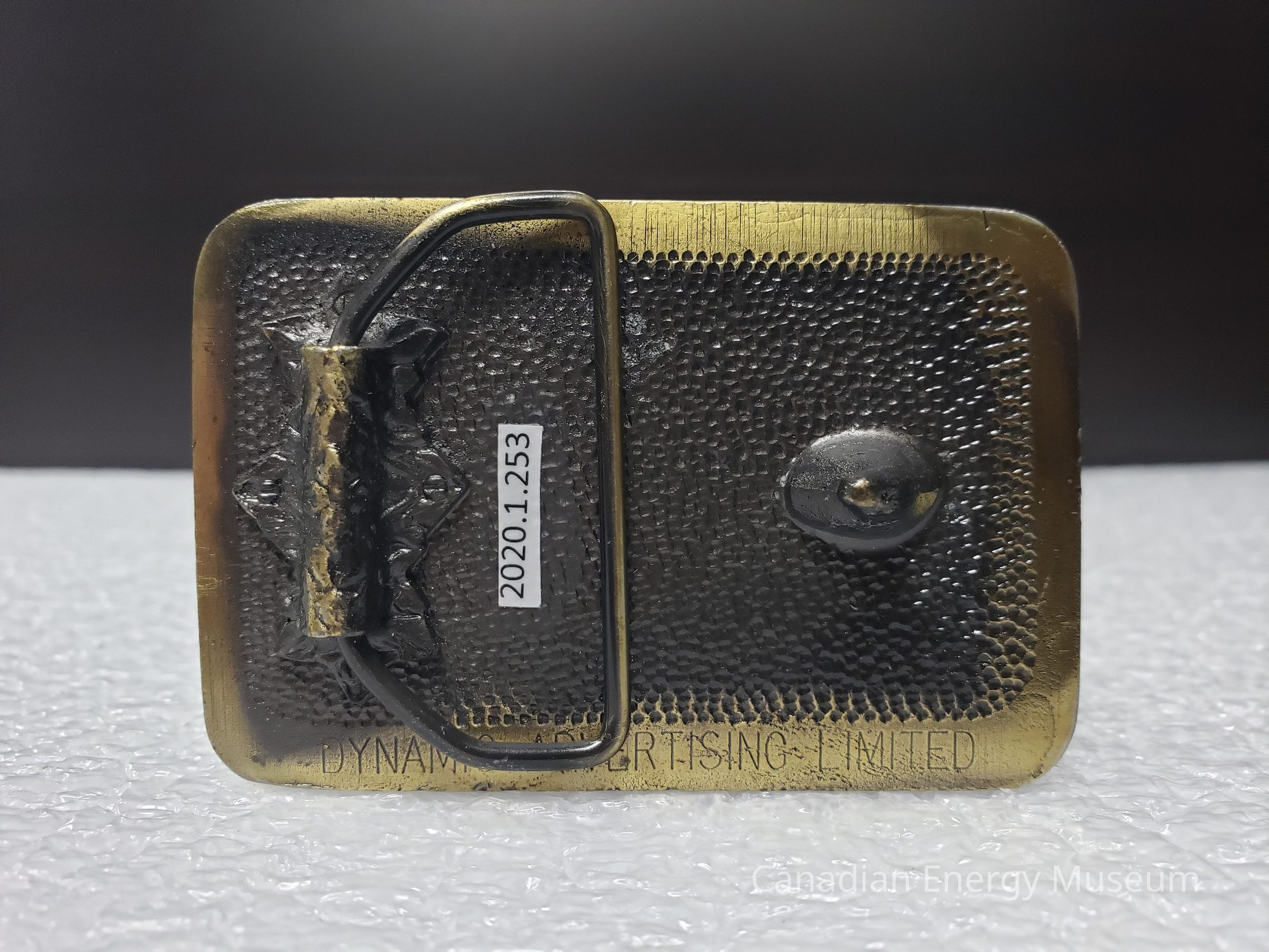 Back Elements: The back has an smooth border slightly brighter coloured than the centre of the buckle. along the bottom of the border is engraved text "DYNAMIC ADVERTISING LIMITED". Within the border the buckle has small little dots creating a rough texture design. The hook is slightly curved and there is a hexagon hook attached at one point with the attachment point being a leafy design.