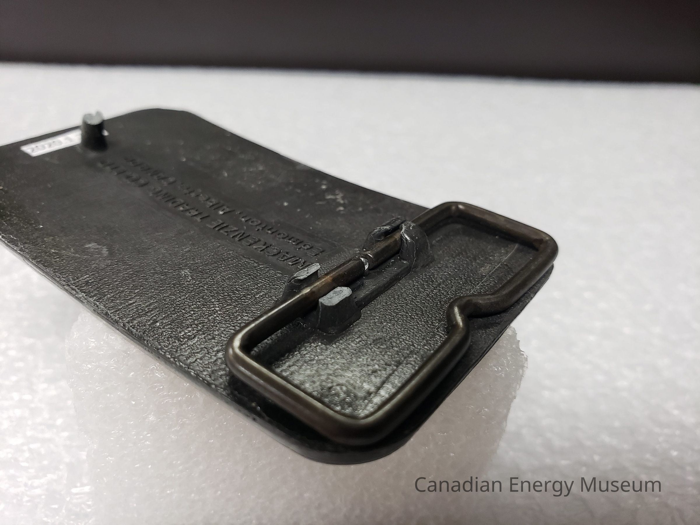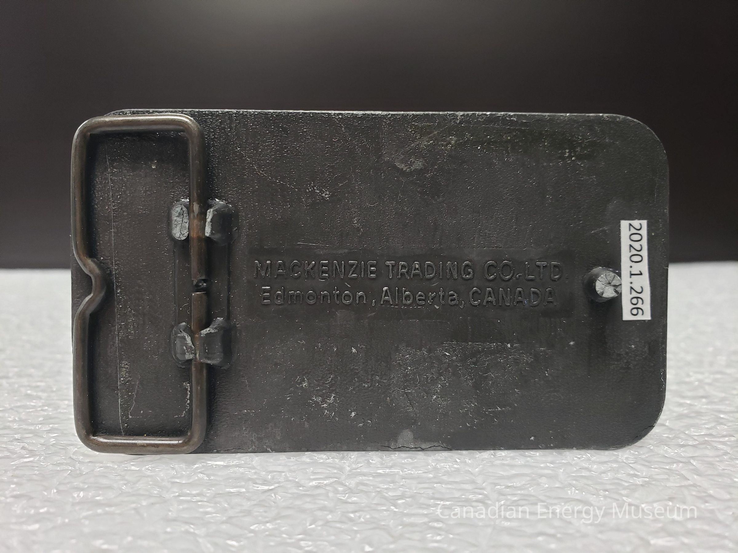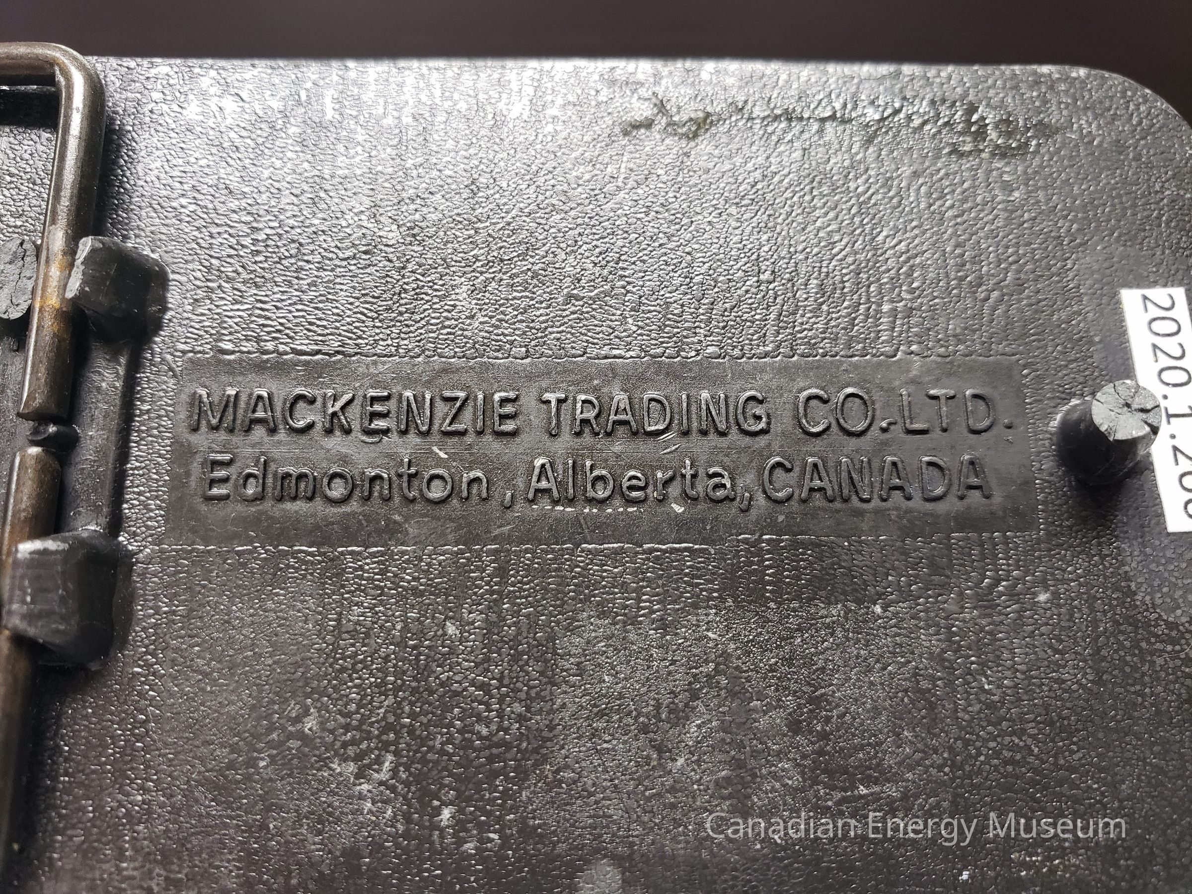 Back Elements: The back of the buckle has a smooth rectangle in the middle with the makers mark "MACKENZIE TRADING CO. LTD." and " Edmonton, Alberta, CANADA". Has a broken hook and a rectangle shaped hinge attached at two points, however, the top attachment is broken.