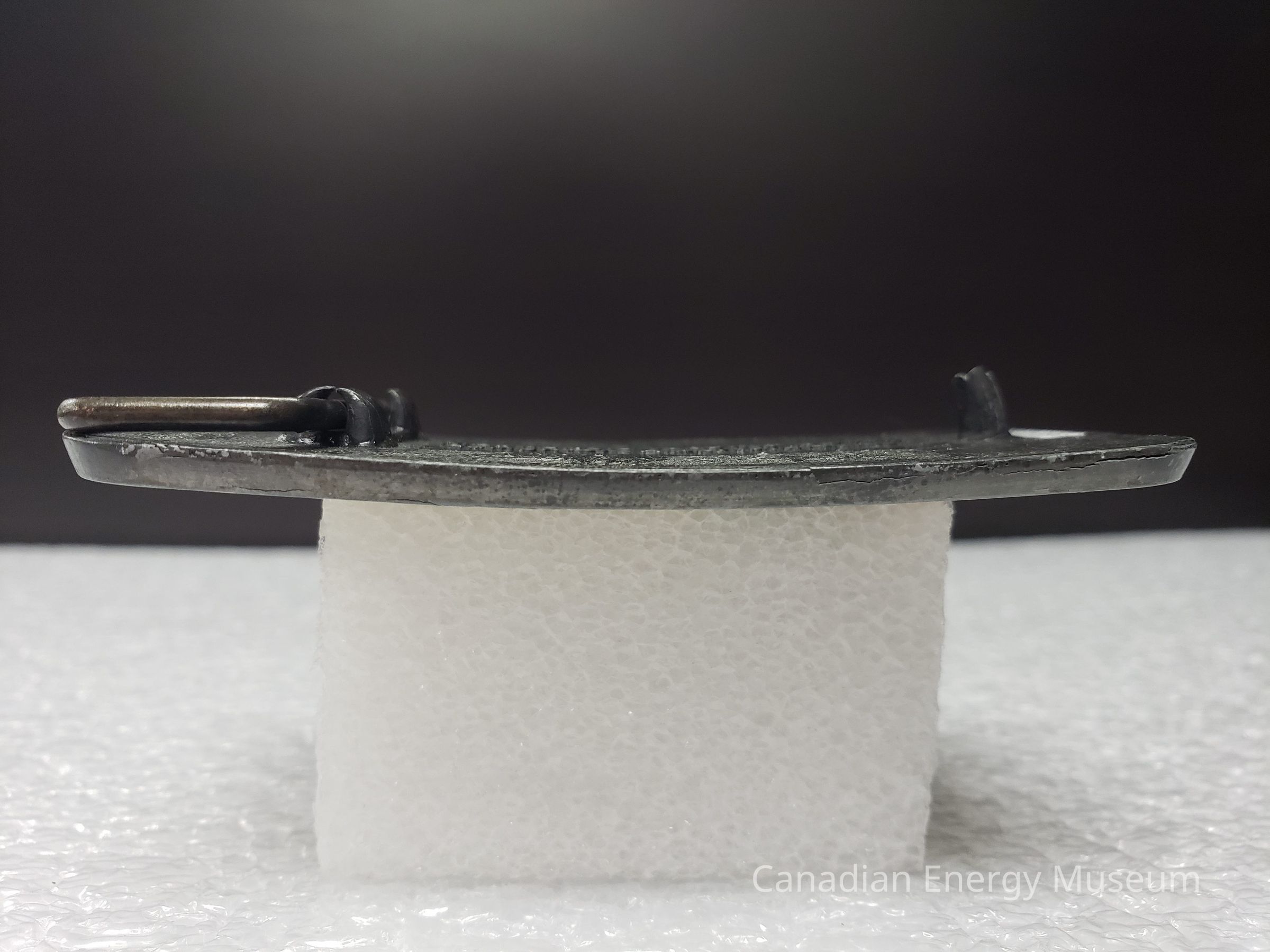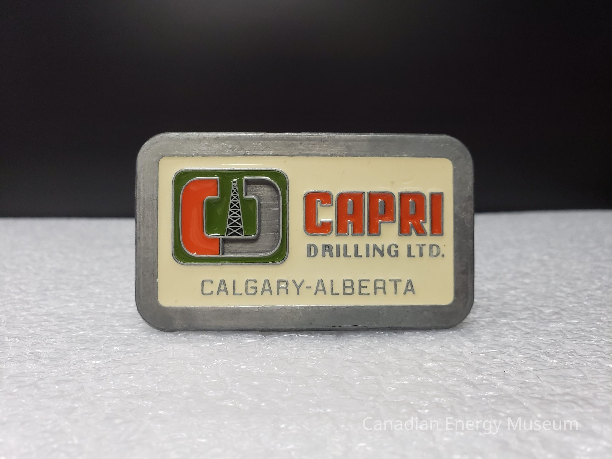 Old Description (Kelsey Dalrymple, 3 June 2020): Capri Drilling Ltd. Calgary. Brass belt buckle with grey and white enamel face. Orange and grey text. Rig inside CD on left.Collection