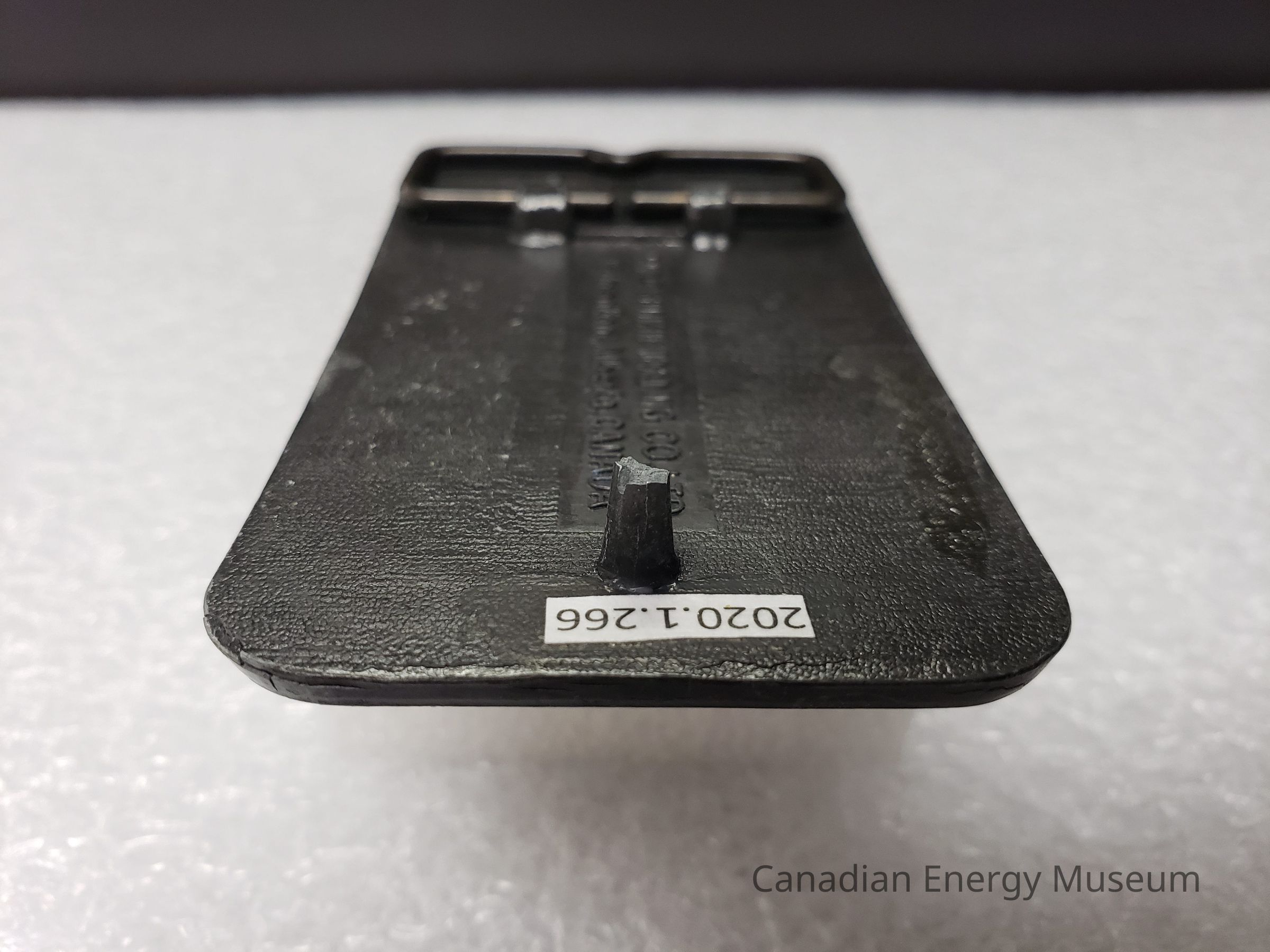 Back: The hook has been broken off leaving a jagged edge. The hinge attachment is broken on one side and still intact at the other attachment. Adhesive residue across top and bottom of the belt buckle. Bottom right corner has a small crack, and in the centre at the bottom of the belt buckle there is another small crack.Mechanism