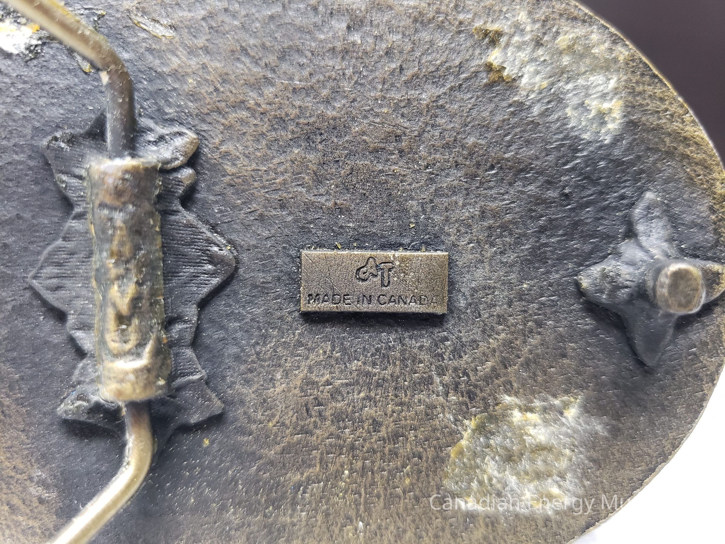 Back Element: has a flat rough texture with a floral based hook and an elongated hexagon hinge attached at one point. the attachment point is also a floral leafy design. In-between the two elements is the makers mark in a raised rectangle "AT" "MADE IN CANADA".