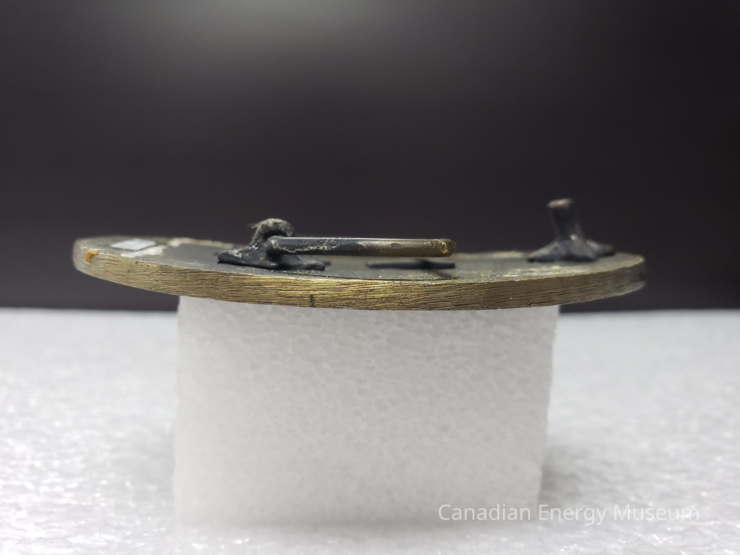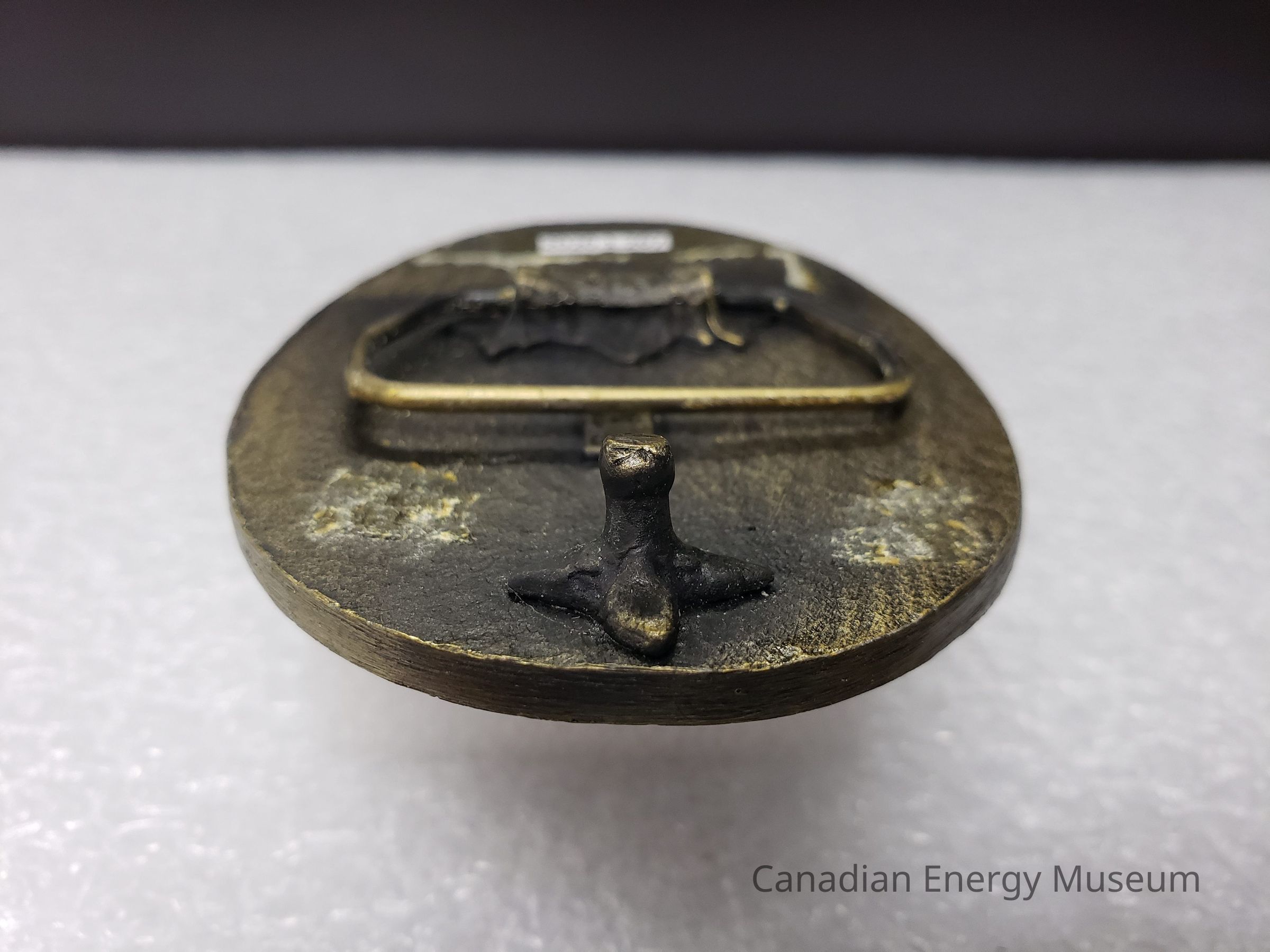 Back: Overall discolouration and fading across the back of the belt buckle. Along the left side of the buckle is a large line of adhesive residue. On the bottom right side and top right side of the buckle is two more patches of hardened adhesive residue.Mechanism