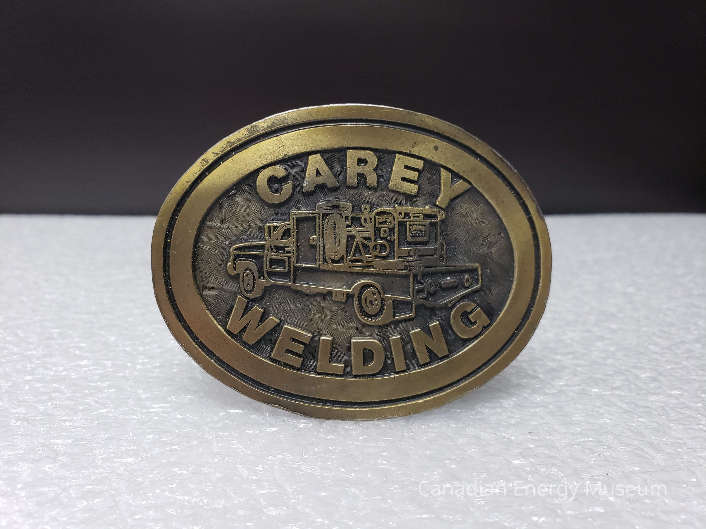 Old Description (Kelsey Dalrymple, 3 June 2020):Carey Welding. Brass oval belt buckle with truck in centre.Collection