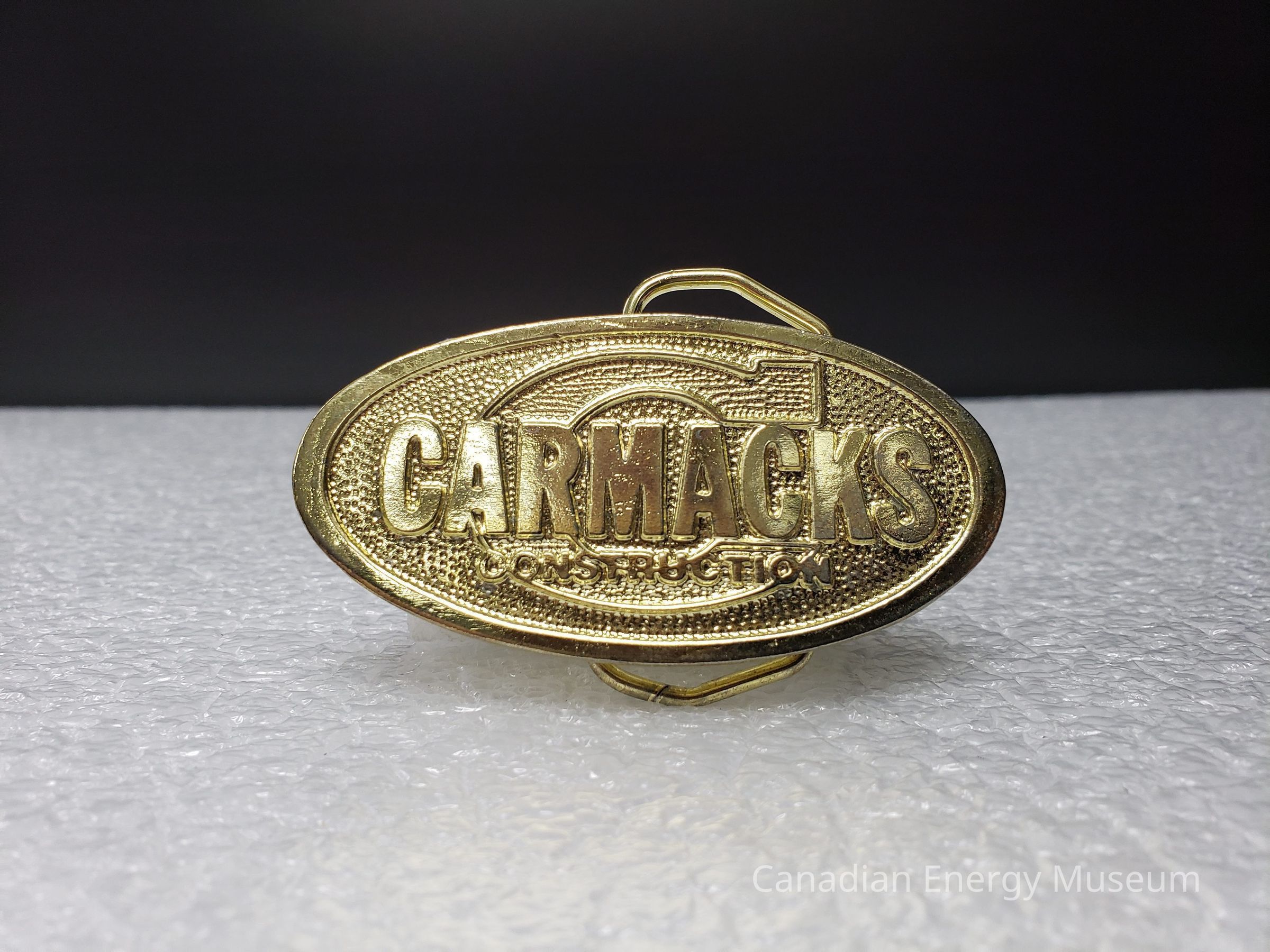 Old Description (Kelsey Dalrymple, 3 June 2020):Carmacks Construction. Oval brass belt buckle, gold-colored. C in center in behind text.Collection