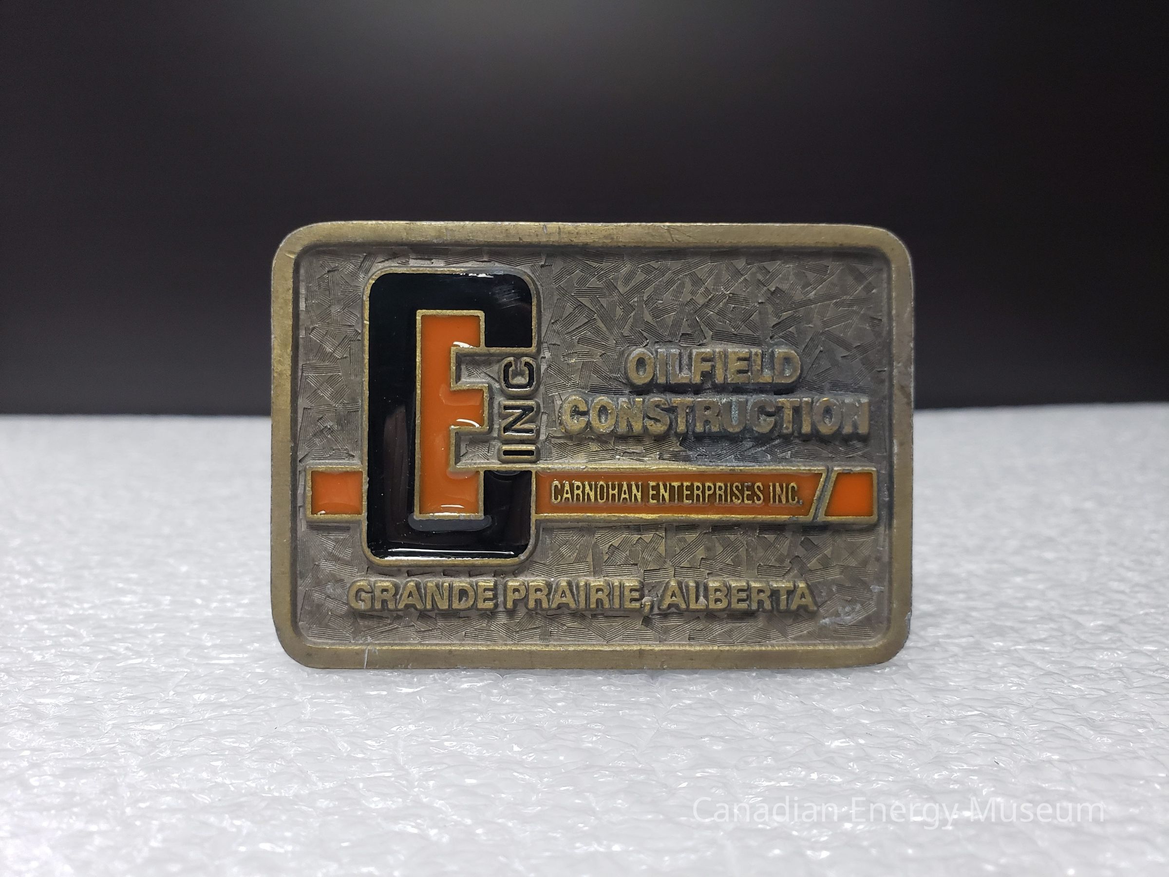 Old Description (Kelsey Dalrymple, 3 June 2020):Carnohan Enterprises Inc. OIlfield Construction. Grande Prairie, Alberta. Rectangular brass belt buckle with black and orange enamel.Collection