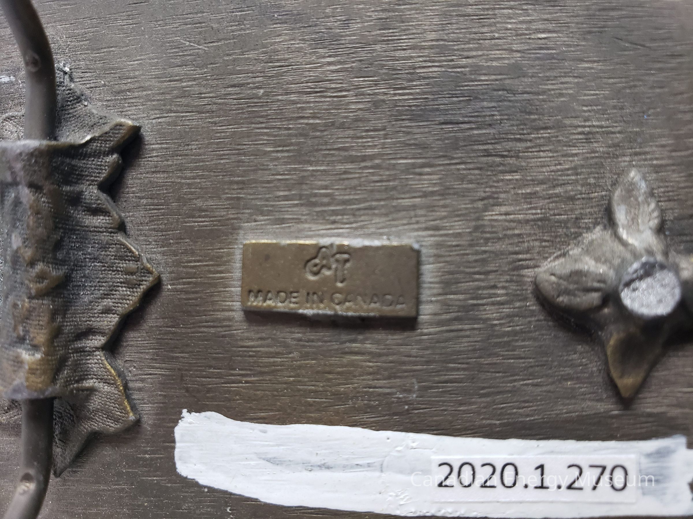 Back Elements: The back has a smooth flat texture, with a hinge attached at one point by a leafy/ floral texture. Beside the hinge is a raised rectangle with makers mark "AT" "MADE IN CANADA" engraved into the rectangle. To right of the buckle is where the hook used to be attached by 4 leafs. The hook is now broken off.