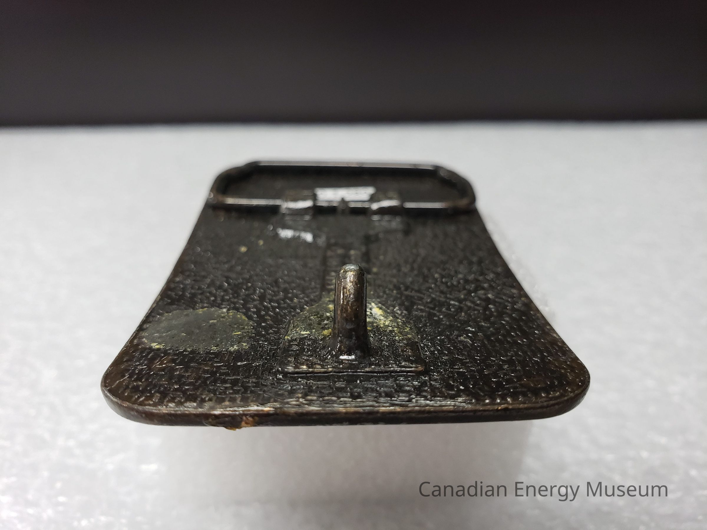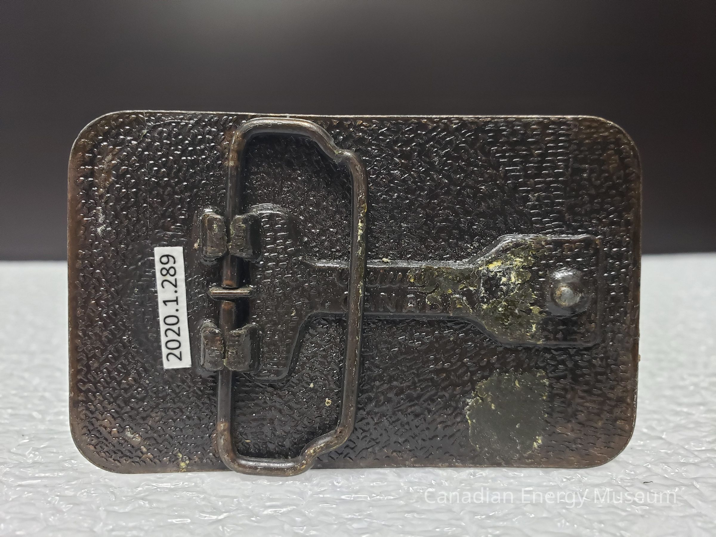Front: The front of the buckle has slight discolouration and fading. Small scratches and dents on the bold text. On the left side of the border is a small chunk of adhesive residue.