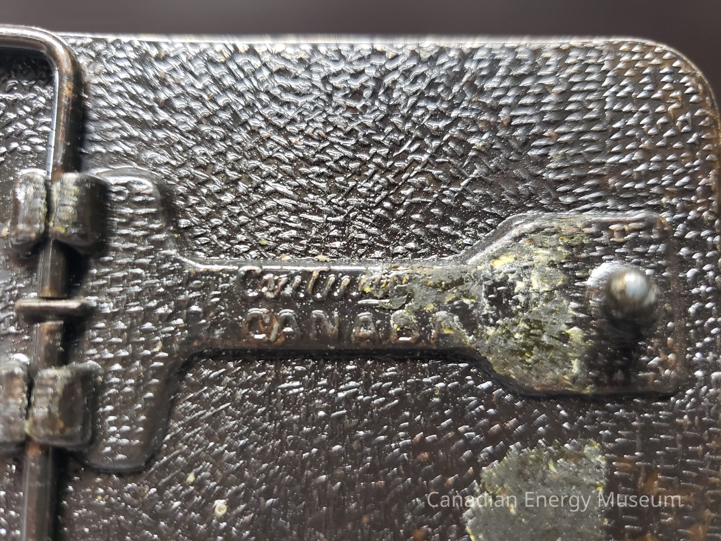 Back Elements: The back has a texture of raised, scattered dashes. The hook (curved) and the hinge (rectangular with indented outer corners) are connected with a raised section. On the raised section is the maker's mark "Century CANADA".