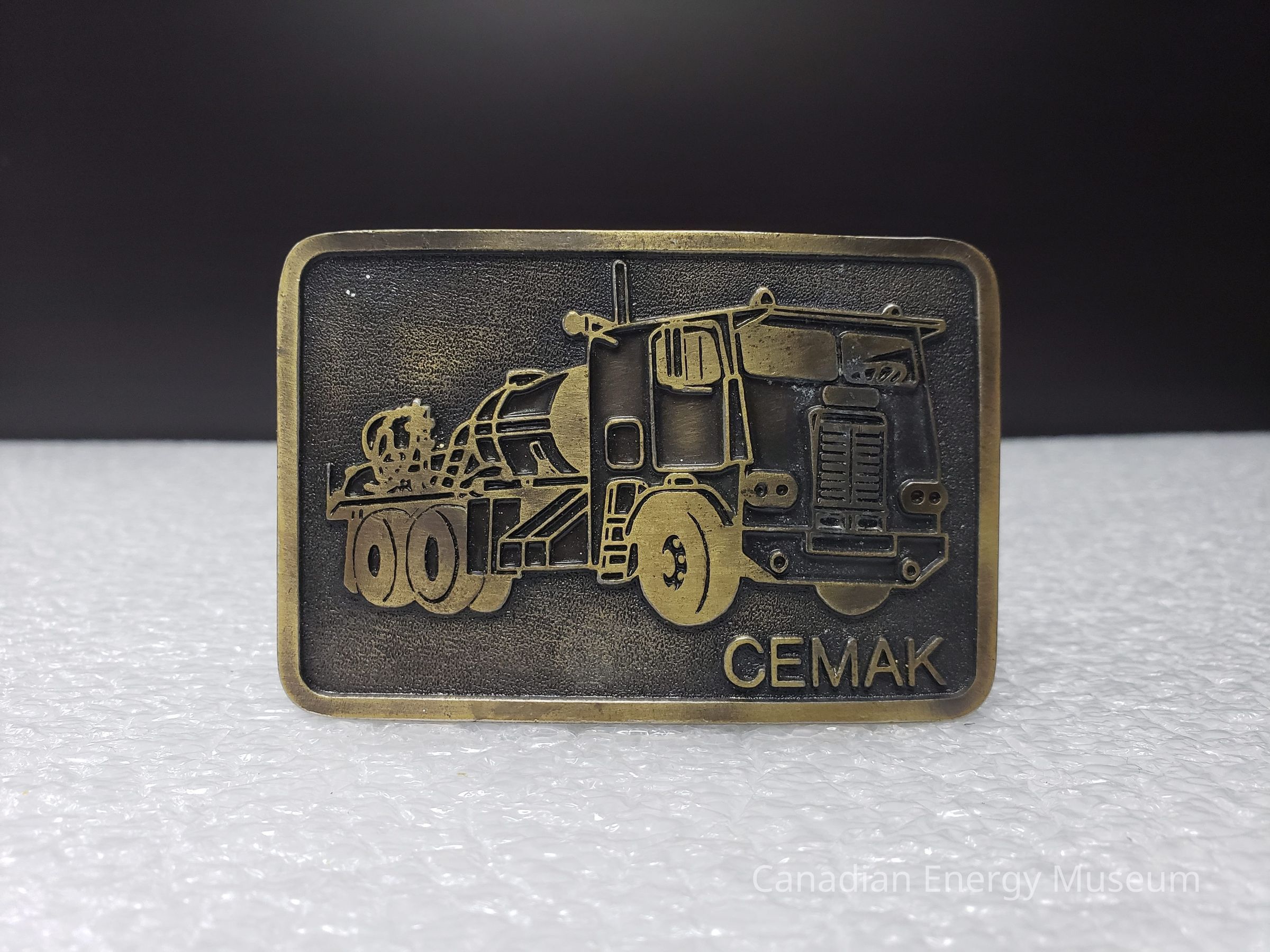 Old Description (Kelsey Dalrymple, 3 June 2020): Cemak Cementers. Rectangular brass belt buckle with truck in centre.Collection