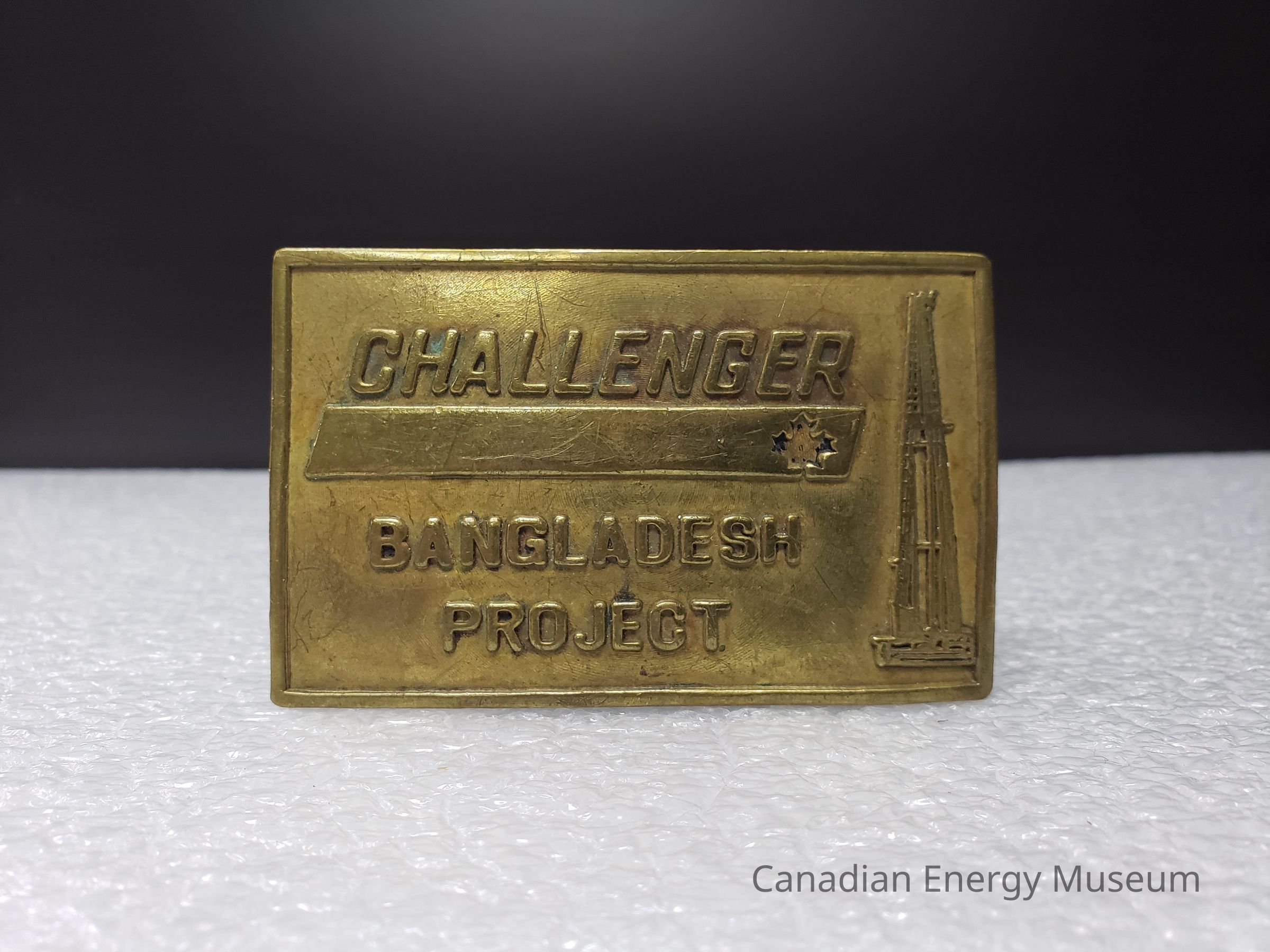 Front Design: A 2mm border around the edge and a recessed interior flat surface. At the top-centre of the buckle is large bold text straight across reading " CHALLENGER". Below the text is a large horizontal slightly raised rectangle with an engraved maple leaf on the right side. Below the rectangle at the bottom-centre of the buckle is large horizontal text reading " BANGLADESH PROJECT". To the right side of the buckle is a large vertical raised imagery of a derrick.