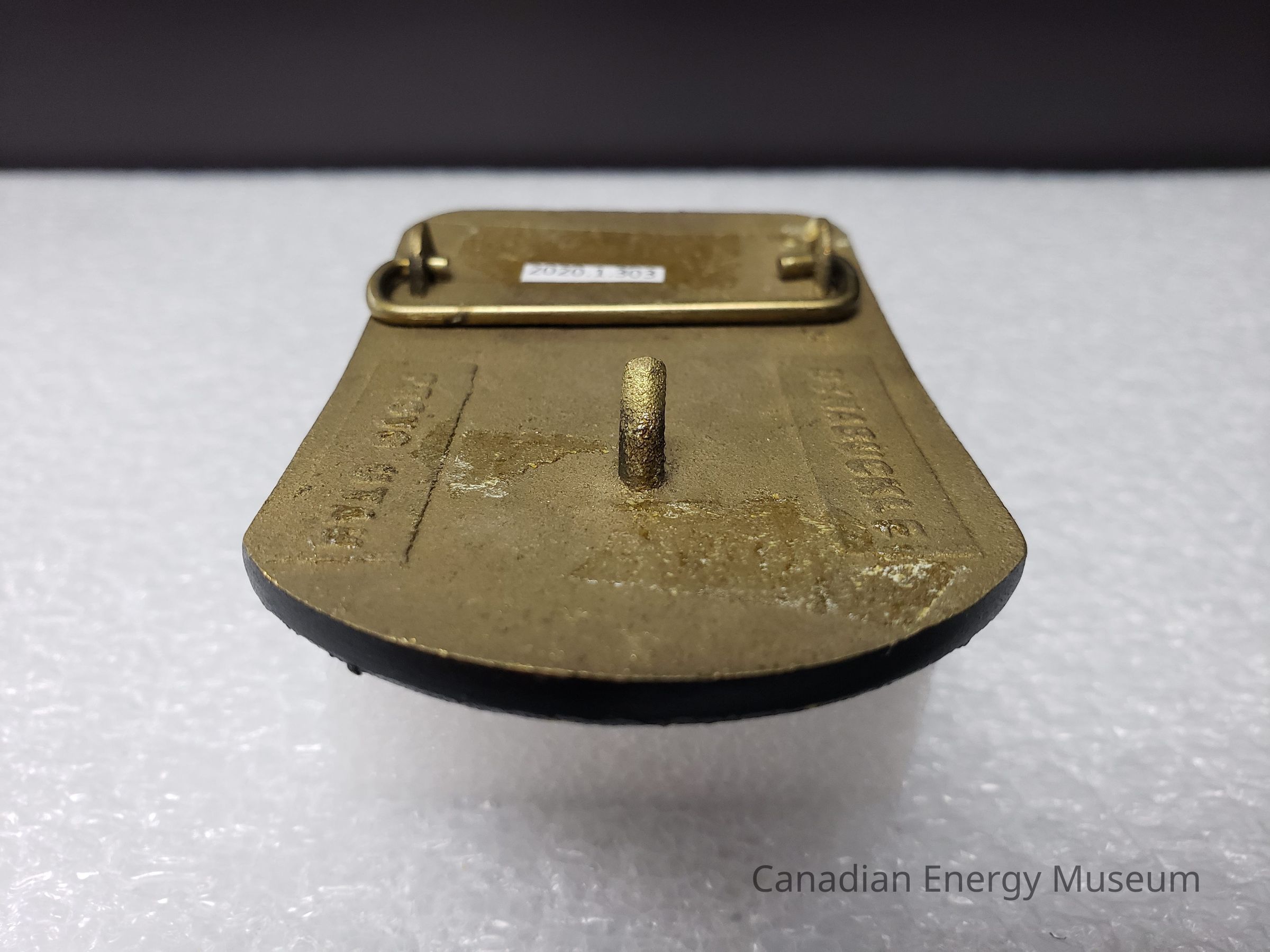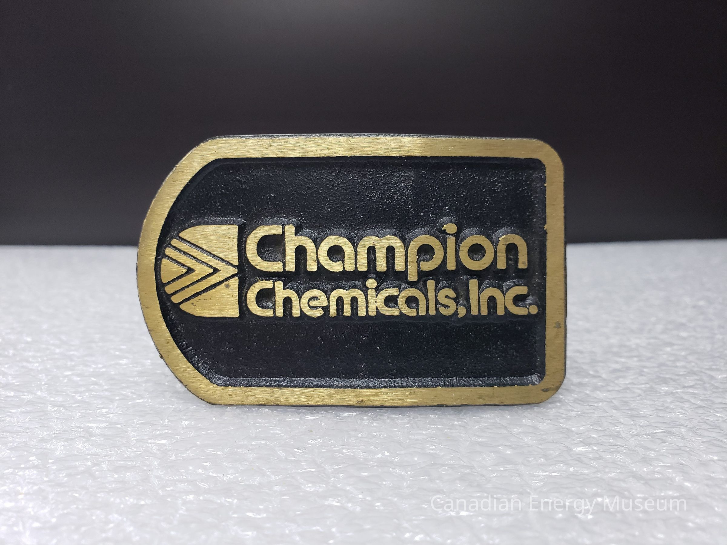 Old Description (Kelsey Dalrymple, 3 June 2020): Champion Chemicals, Ltd. Rectangular brass belt buckle with black face.Collection