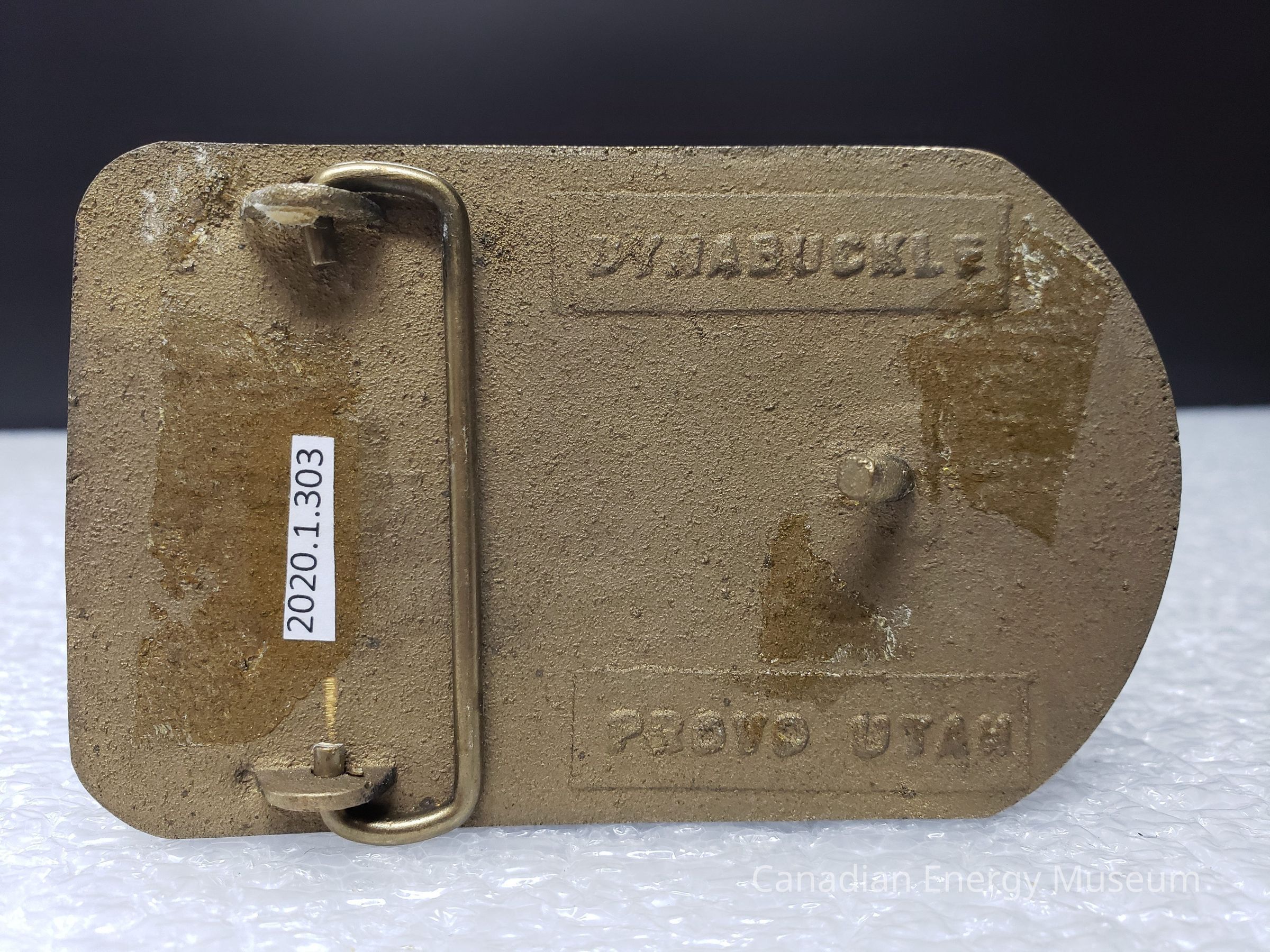 Back Elements: The back has a flat gold-brass coloured surface, with a rectangle shaped hinge attached at two points and a thin curved hook. Above the hook in a slightly raised rectangle is bold text "DYNABUCKLE", and below the hook on a slightly raised rectangle is bold text " PROVO UTAH".
