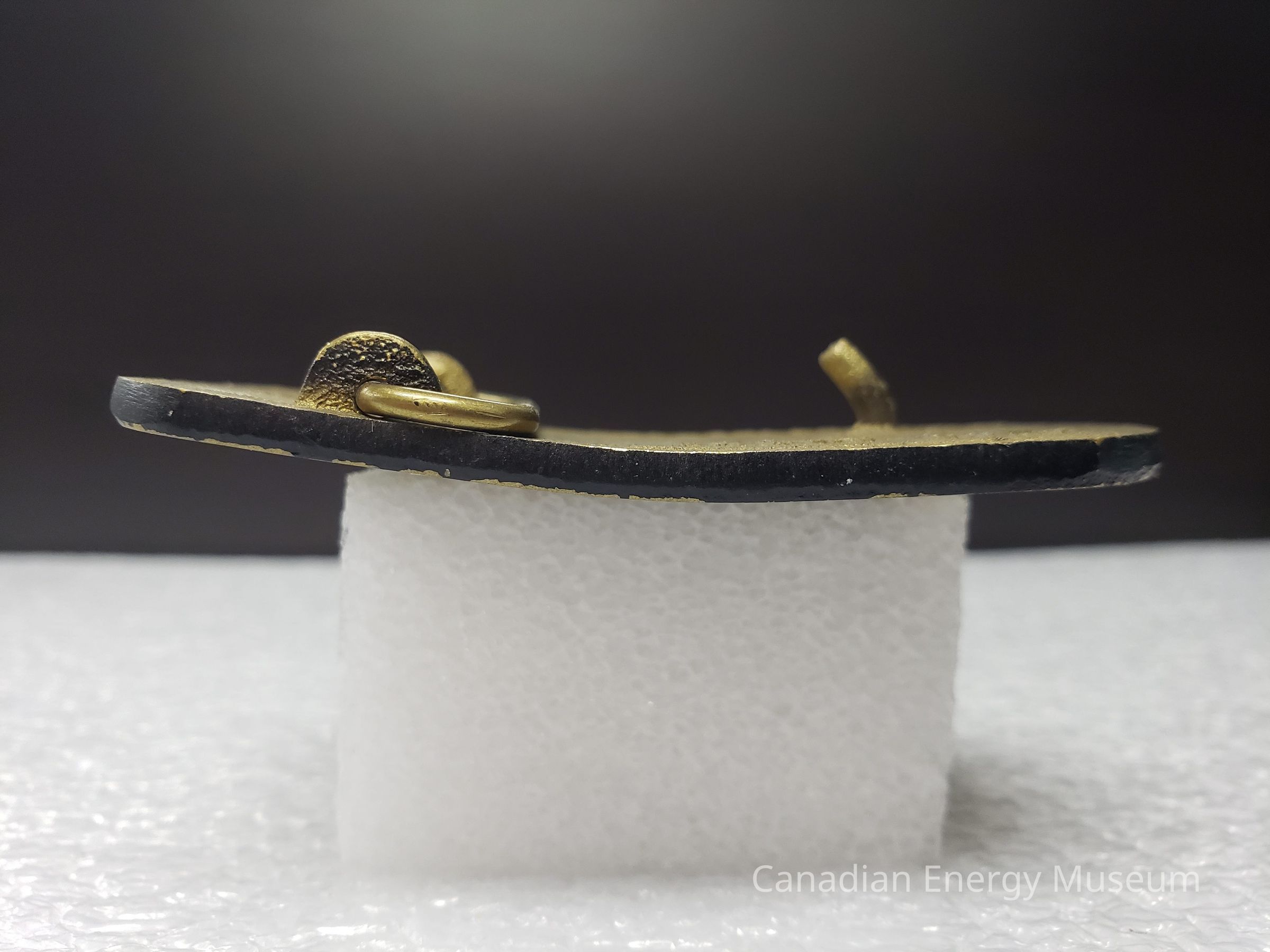 Features: A rectangle with a bulged edge, cast metal (likely brass) belt buckle, finished in a black and brass colour. The buckle is slightly curved.