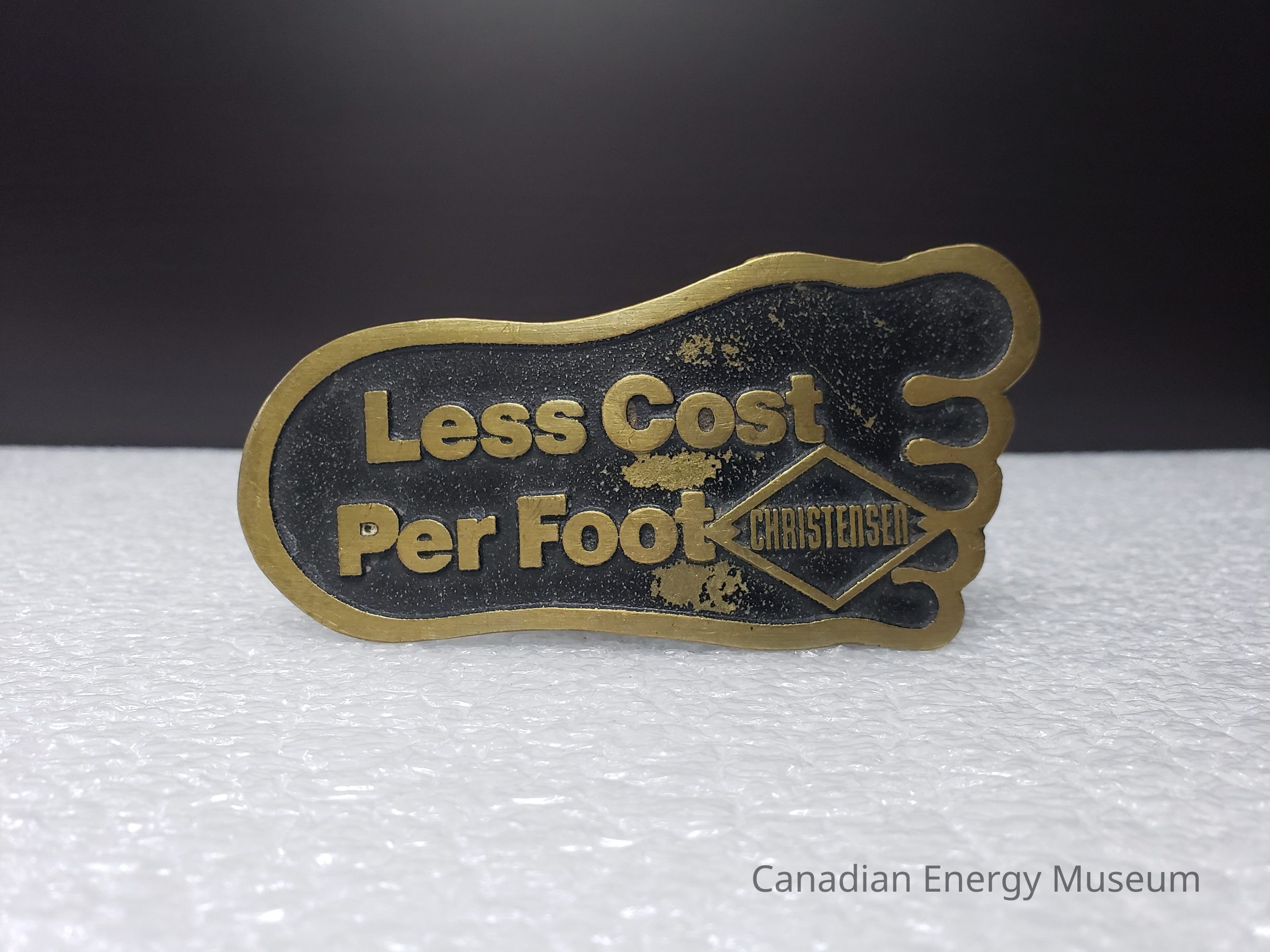 Foot-shaped belt buckle, branded to Christensen Drilling Products.