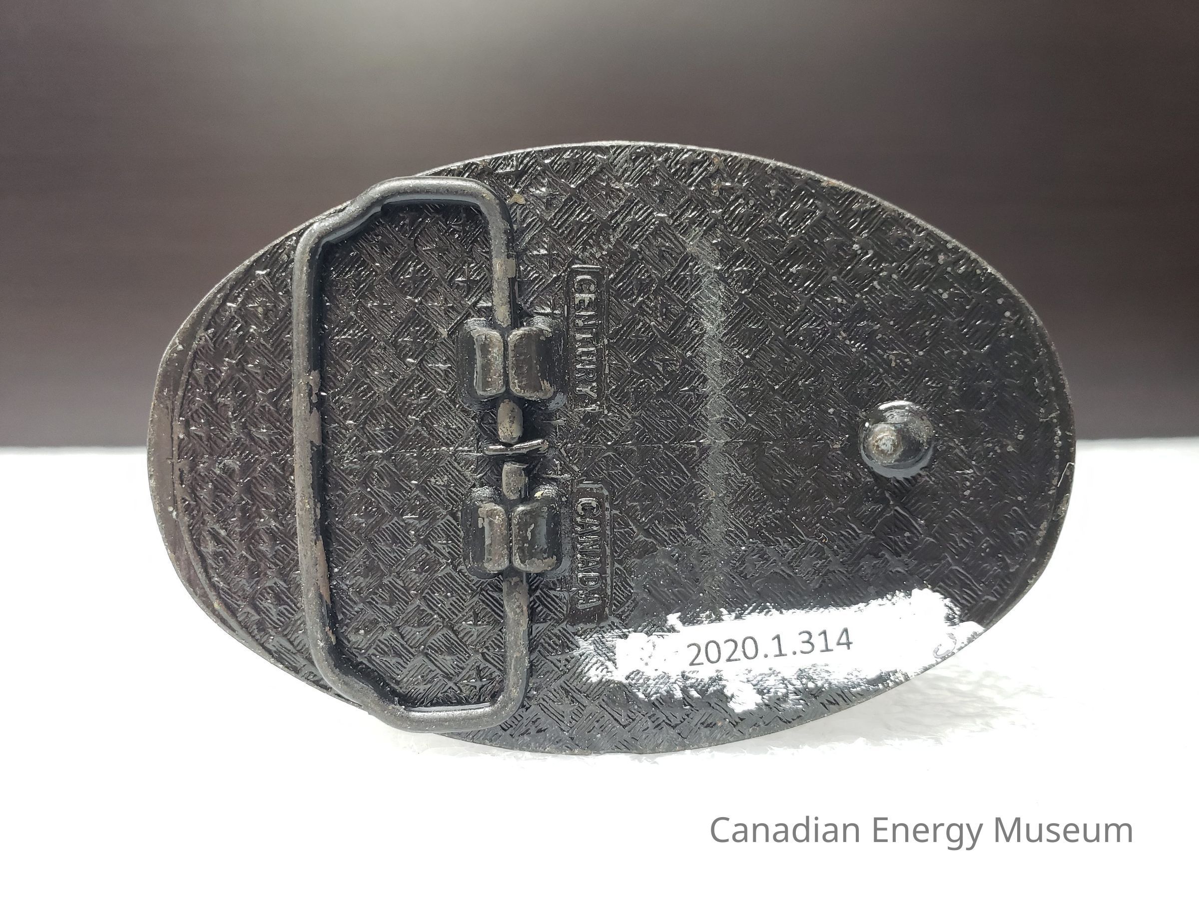 An oval belt buckle branded to CN Rail.