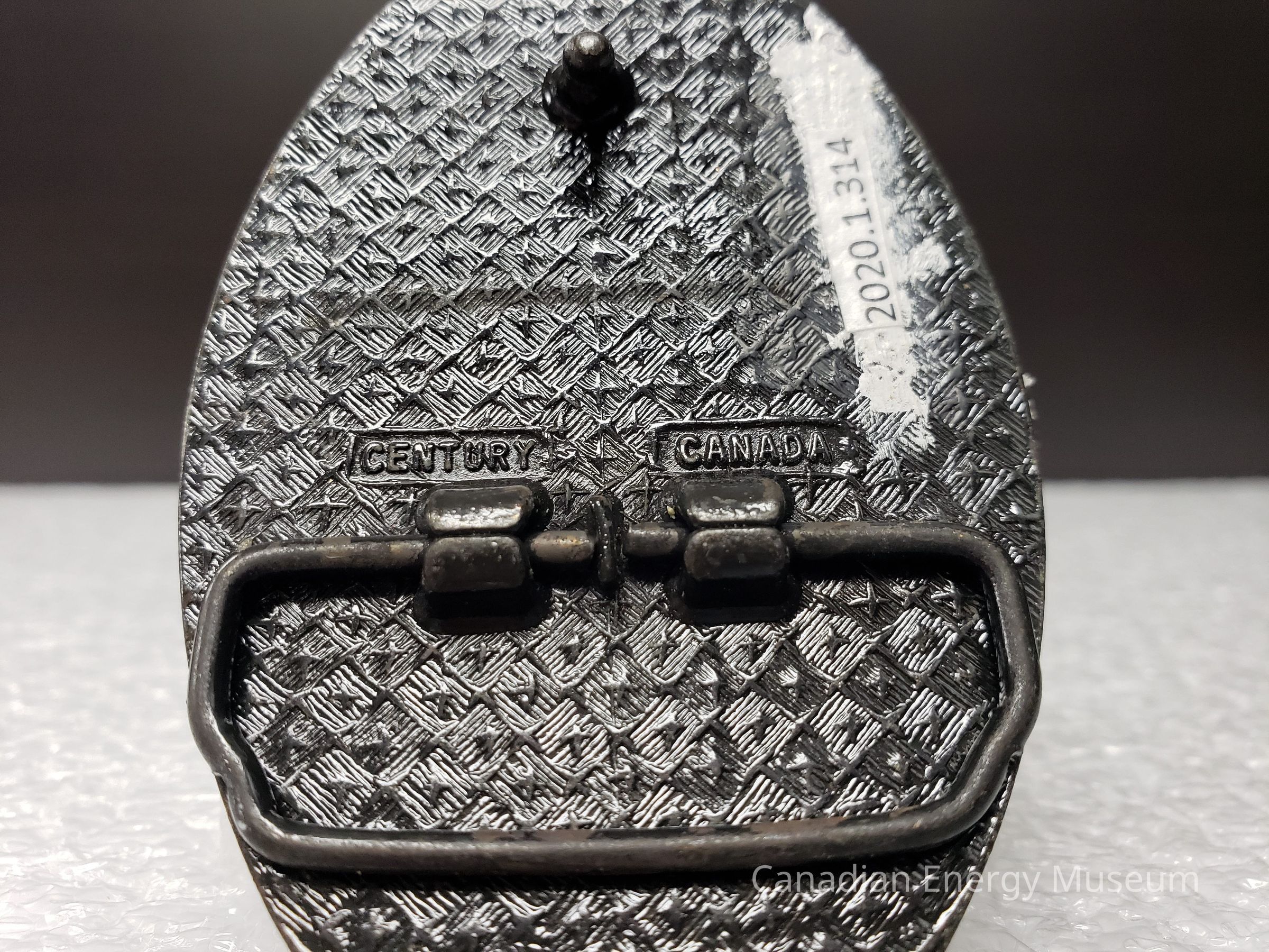 Back Elements: The back has a diagonal slash texture, with a thin curved hook. It has an irregular rectangle with incurved corners attached by two points. Beside the two attachment points is two small rectangles with small bold text inside. The text in one rectangle "CENTURY", and in the other rectangle "CANADA".