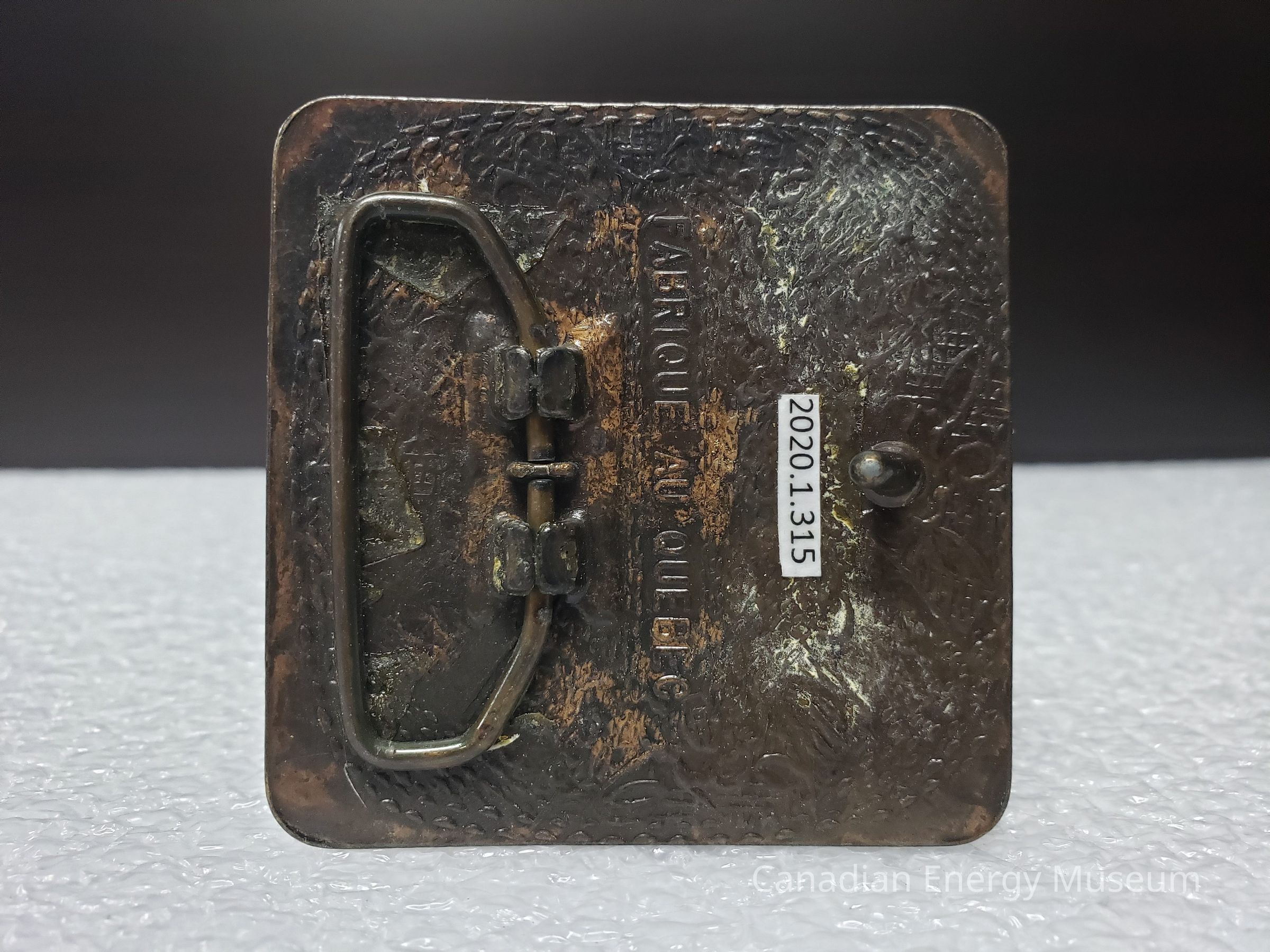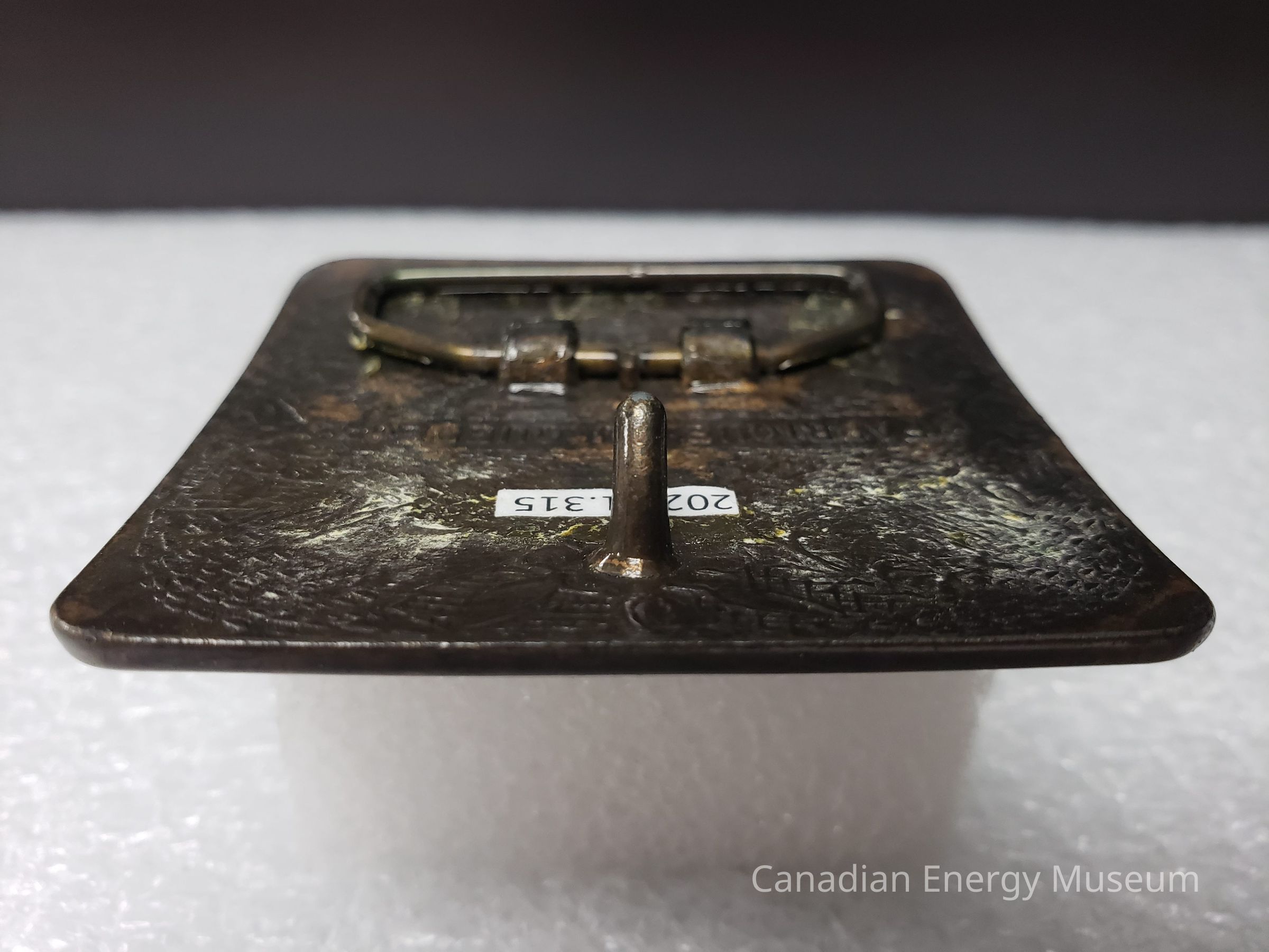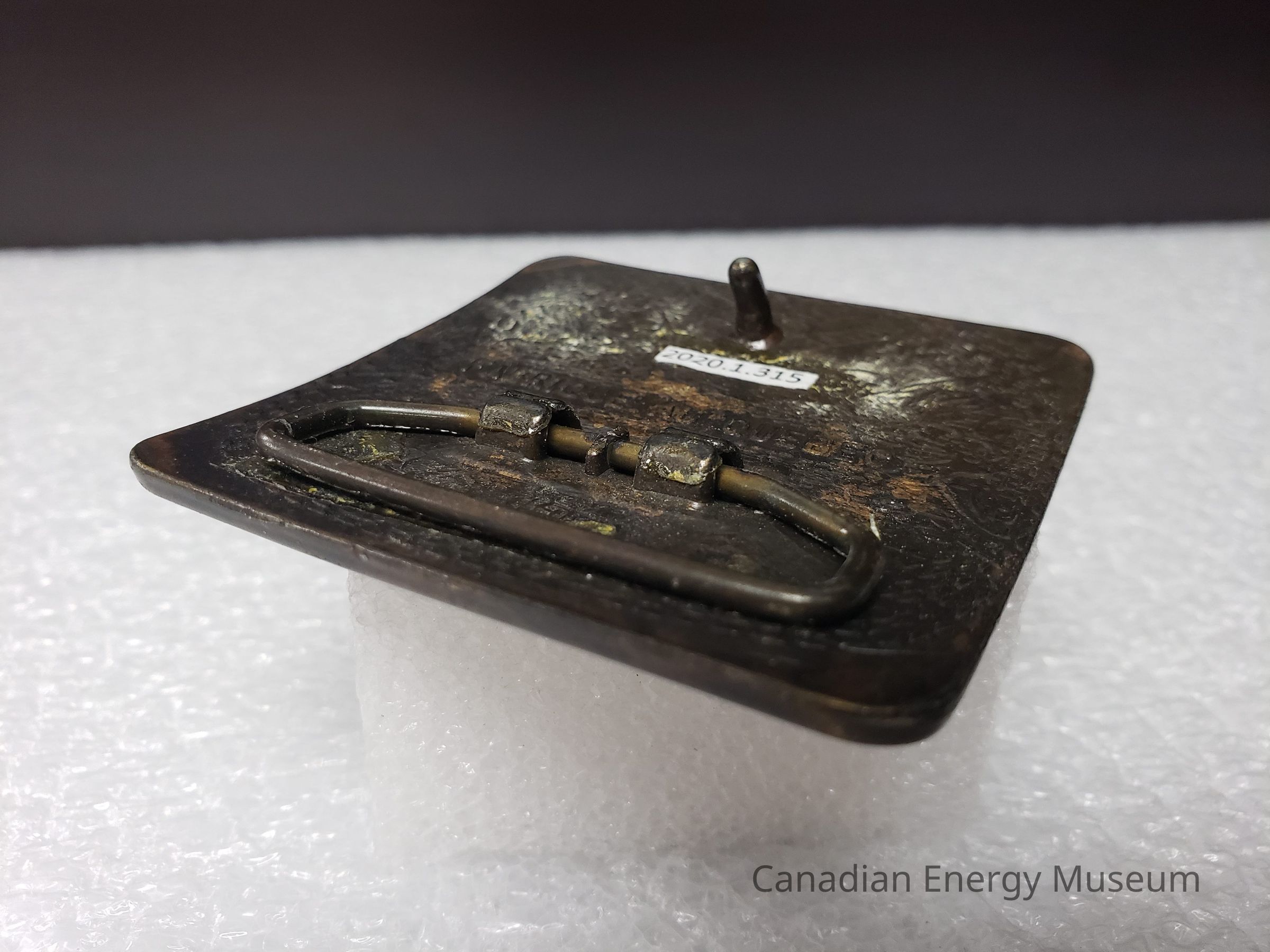 Back: The back of the belt buckle has discolouration and rust spots overall, mostly towards the centres and corners of the buckle. Adhesive residue patches on the right side beside the hook, and along the left side, where the hinge lies. Hinge has adhesive residue on it.Mechanism