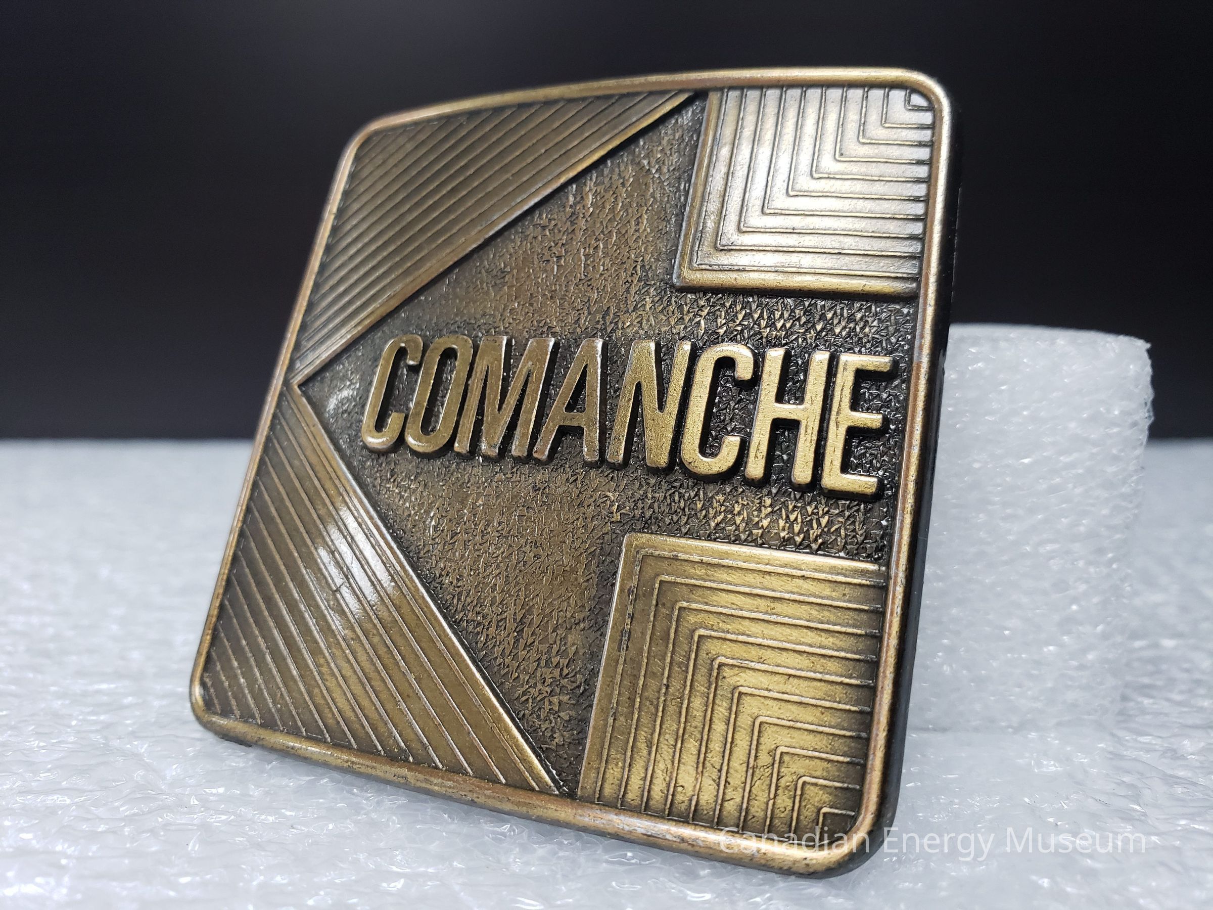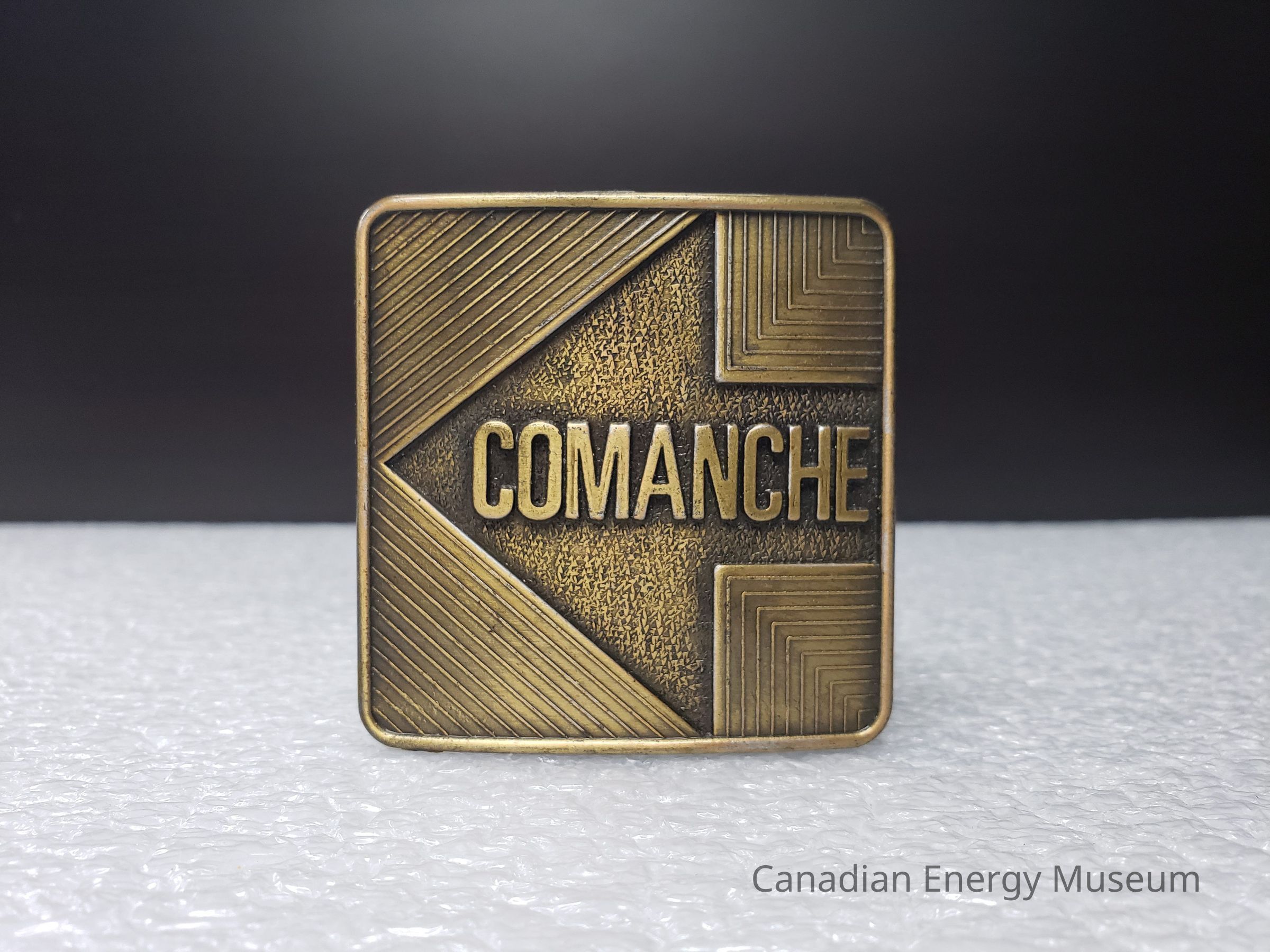Front Design: A square belt buckle with a solid 1.5-2mm border. Inside the border is a slightly recessed interior with raised diagonal lines. The centre of the buckle is carved out to design an arrow pointing towards the left. The background of the arrow is a small speckled texture. In the centre of the arrow is large raised bold text "COMANCHE".