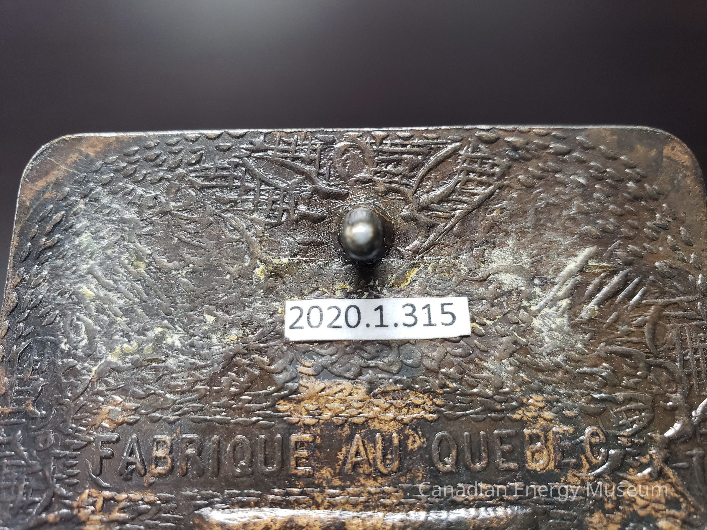 Back Elements: The background of the buckle is entirely filled with a slightly raised floral design, with a small flat area in the shape of a rectangle with small bold text "FABRIQUE AU QUEBEC". The back of the buckle has a thin curved hook and elongated hexagon hinge attached at two points.