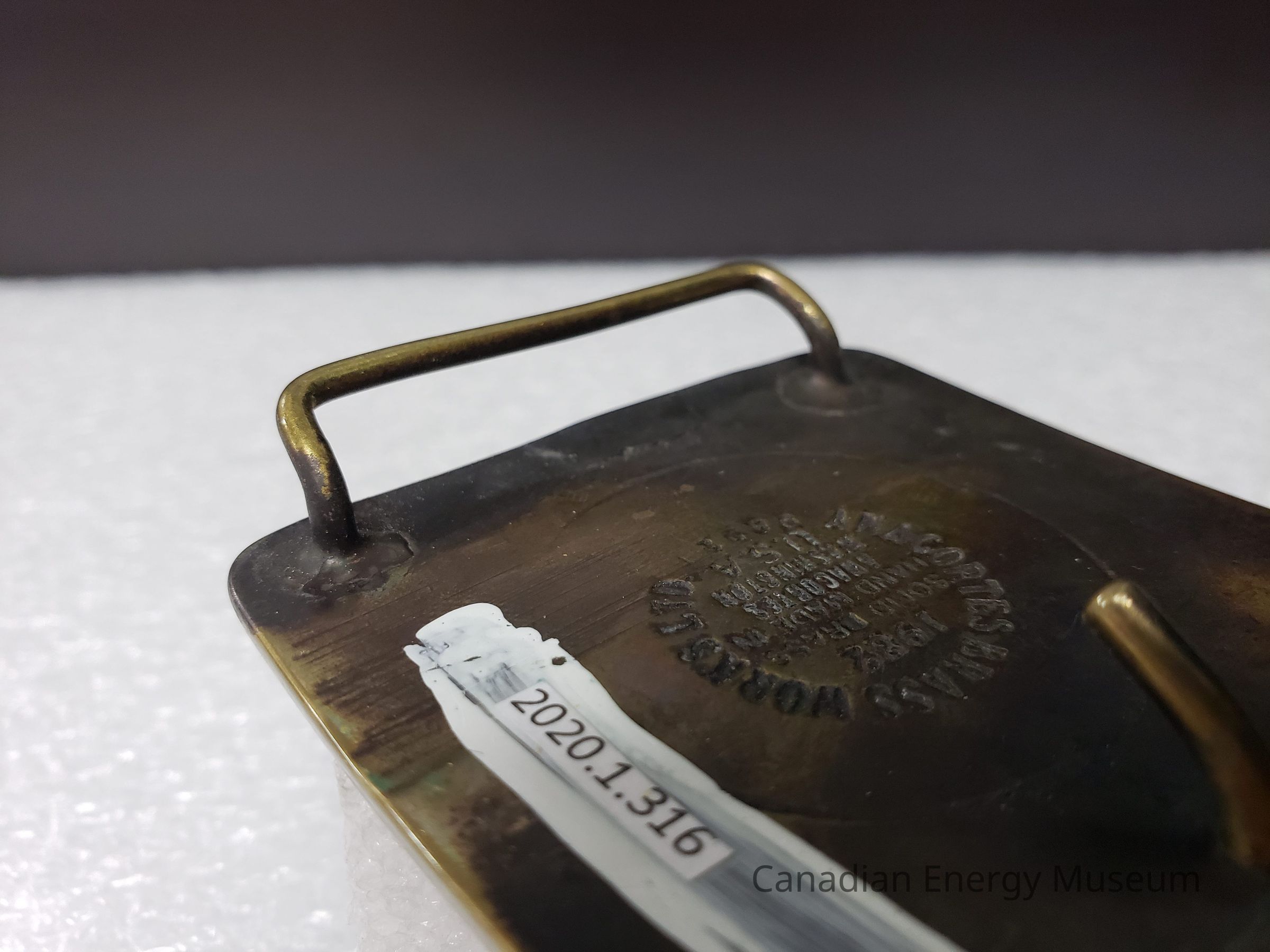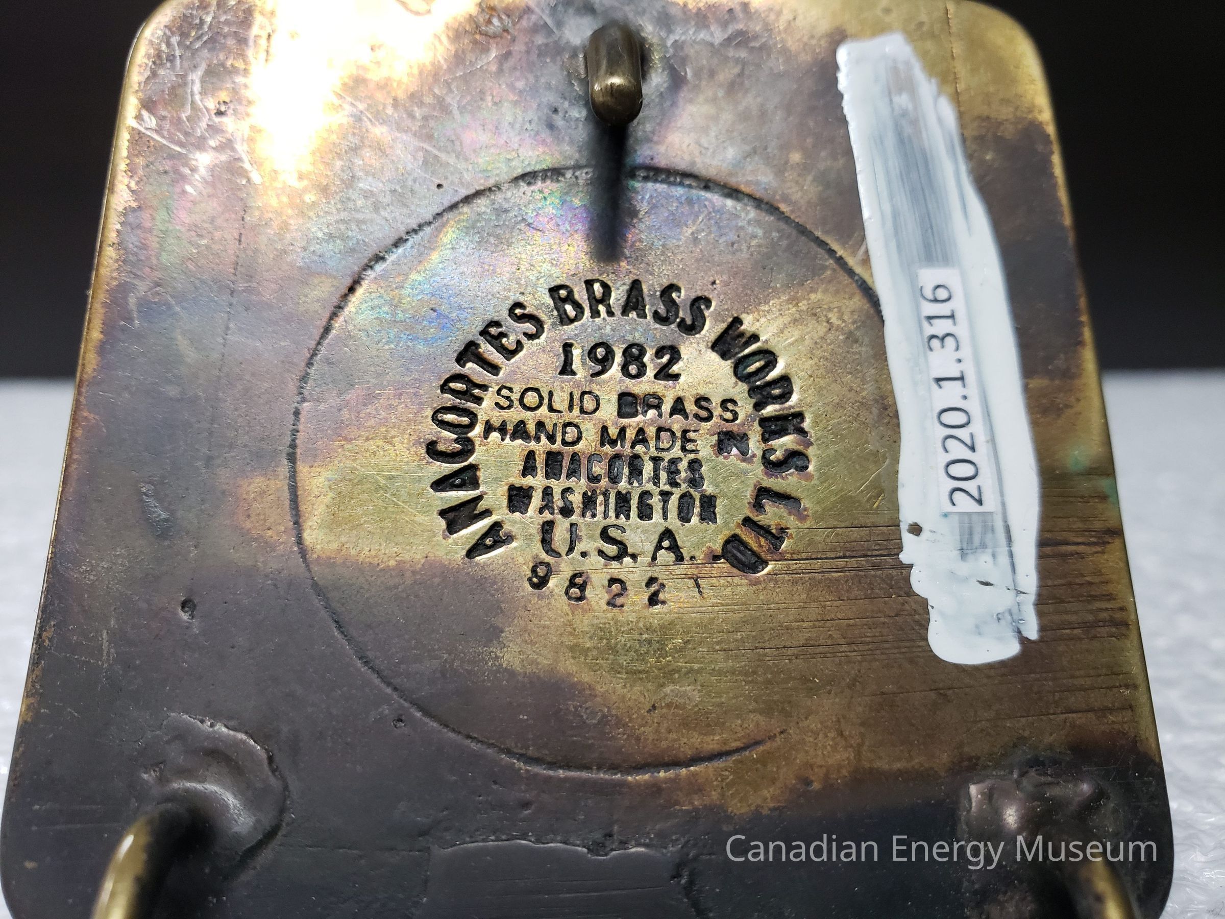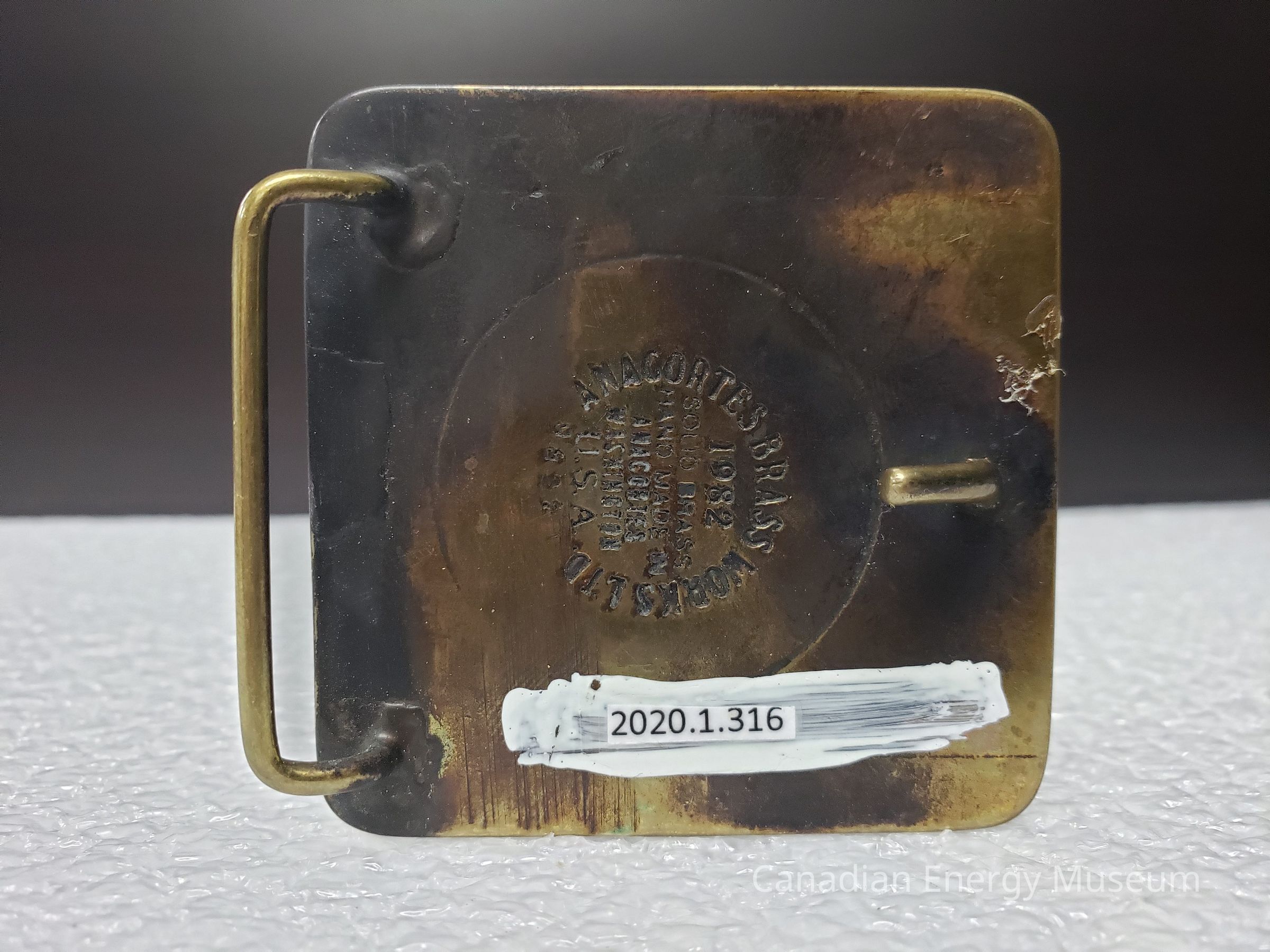 Back Elements: The back of the buckle has a smooth flat surface with a stationary rectangle shaped hinge attached at two points. On the other side the buckle is a thin curved hook. In the centre of the buckle is a slightly engraved circle. Inside the circle is text written in the shape of a circle "ANACORTES BRASS WORKS LTD. 9822". written inside the text in lines is engraved text " 1982 SOLID BRASS HAND MADE IN ANACORTES WASHINGTON U.S.A.".
