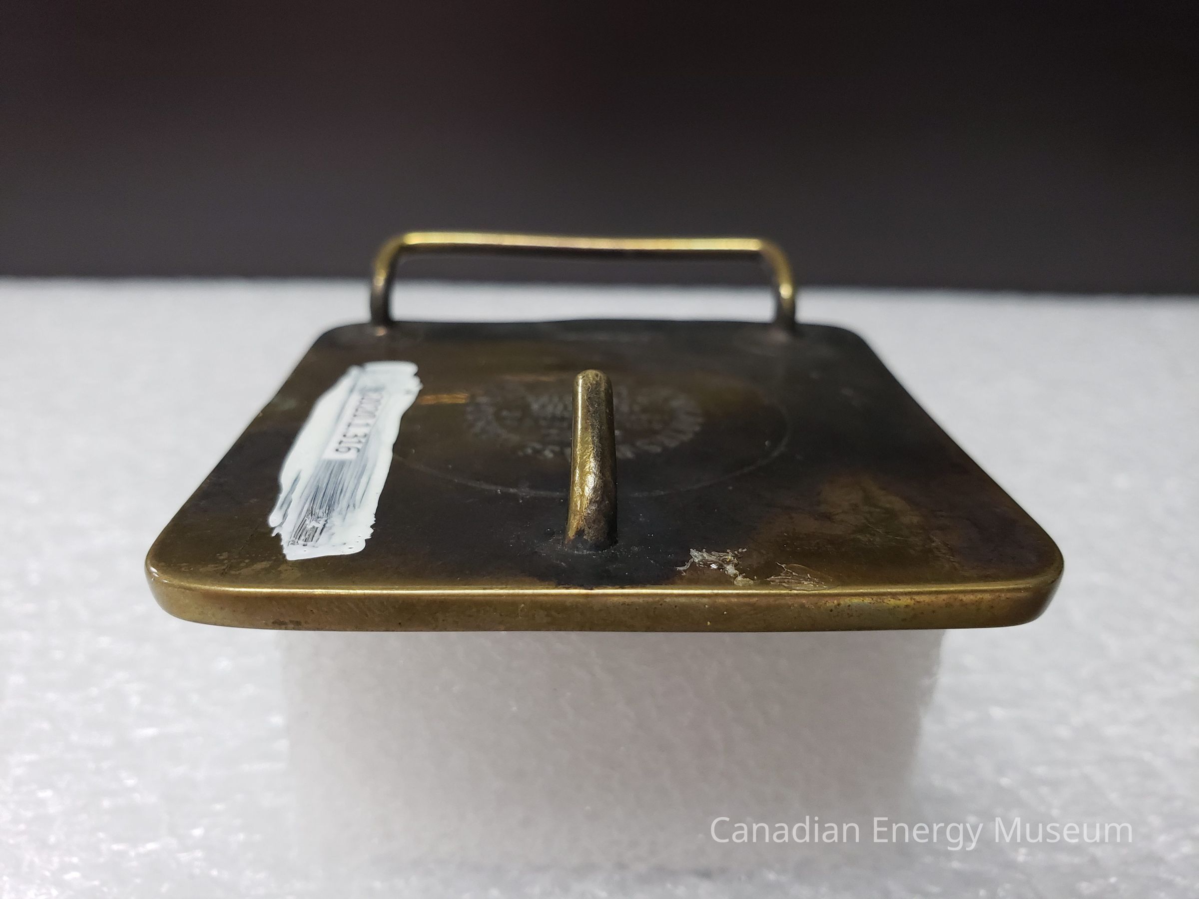 Old Description (Kelsey Dalrymple, 3 June 2020): Comanche. Square brass belt buckle with arrow pointing left.Collection