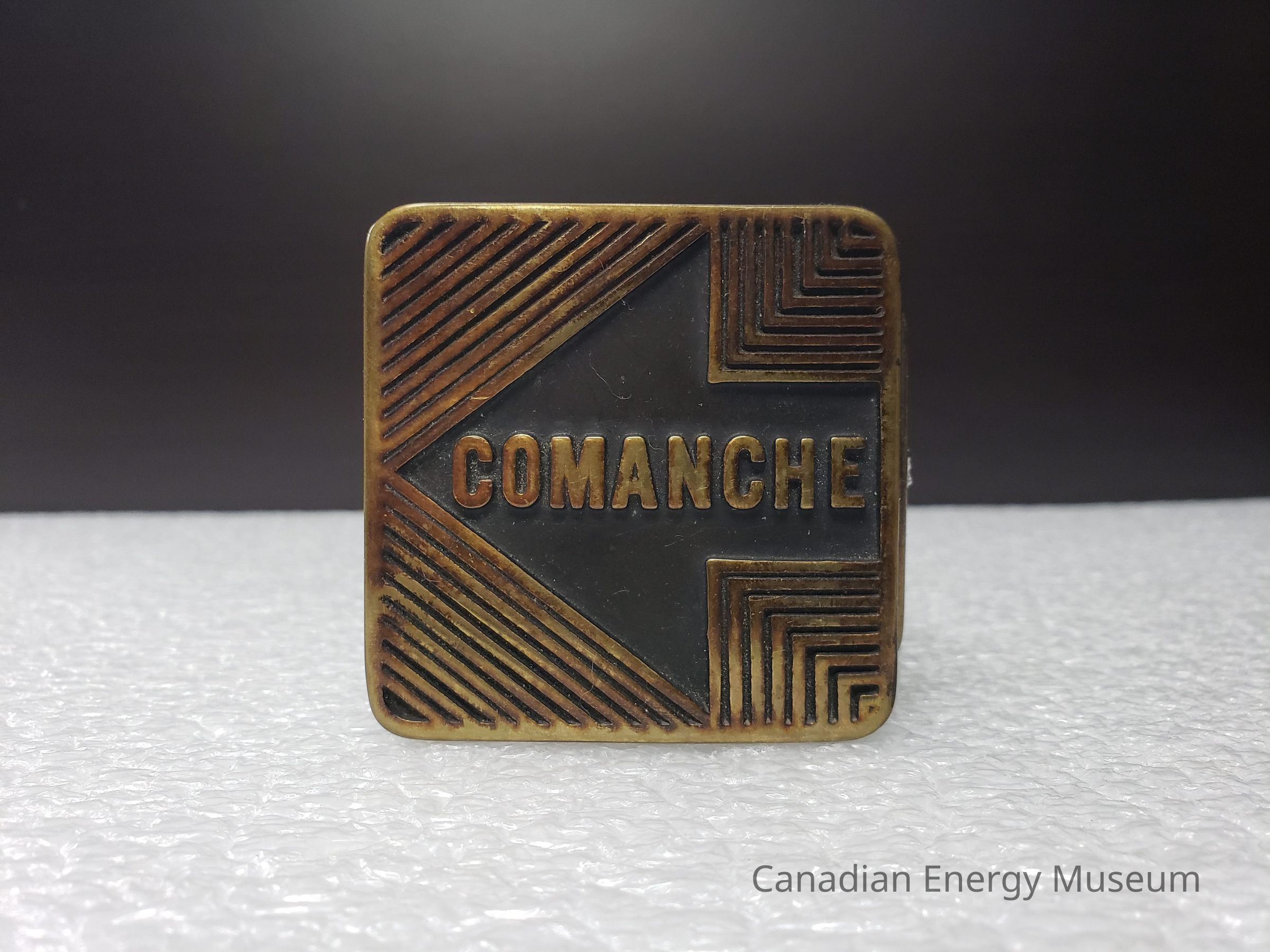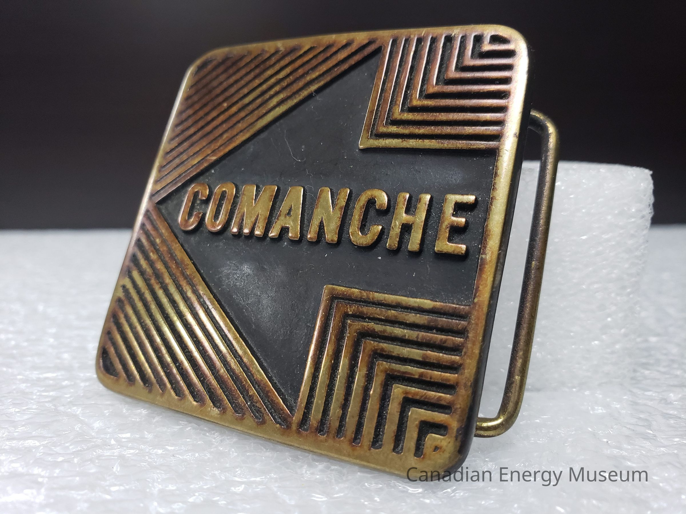 Front Design: A square belt buckle with a 2-1-2mm border. Inside the border is a slightly recessed interior with engraved diagonal lines. The centre of the buckle is carved out to design an arrow pointing towards the left. The background of the arrow is flat smooth texture painted brown. In the centre of the arrow is large raised bold text "COMANCHE".