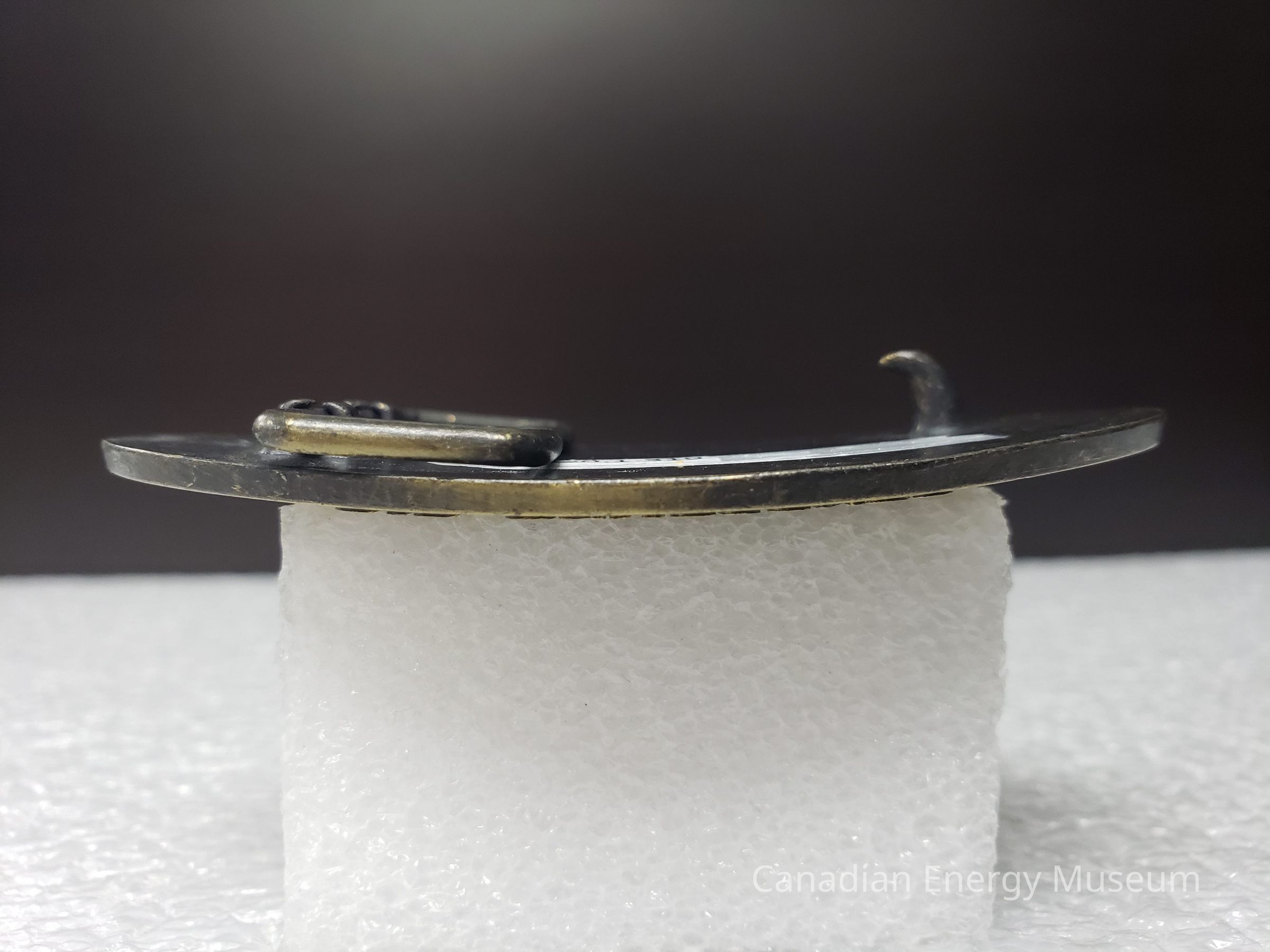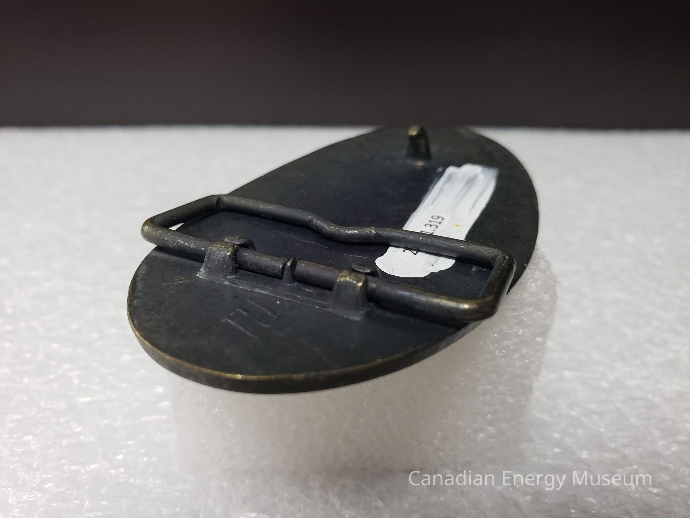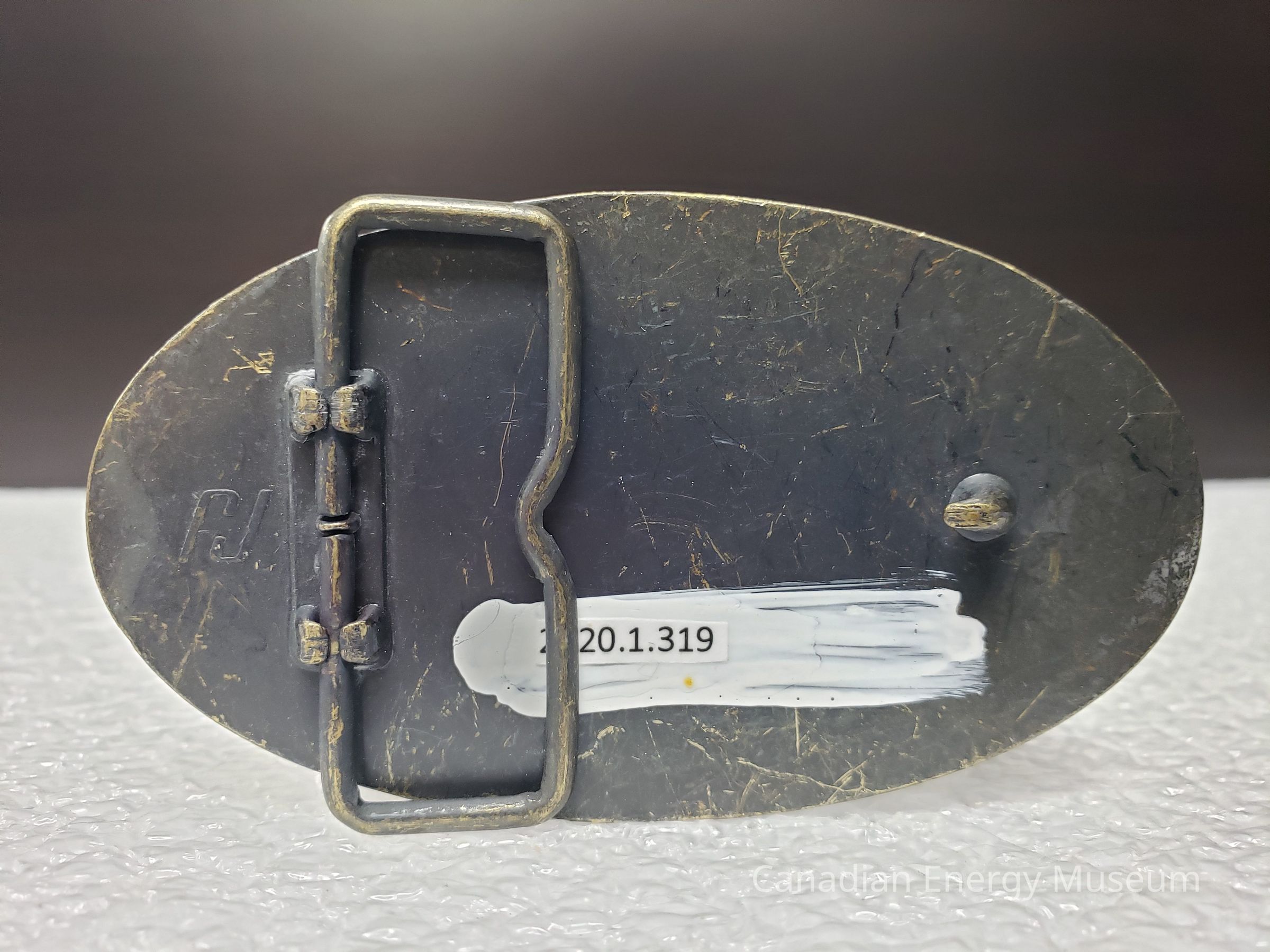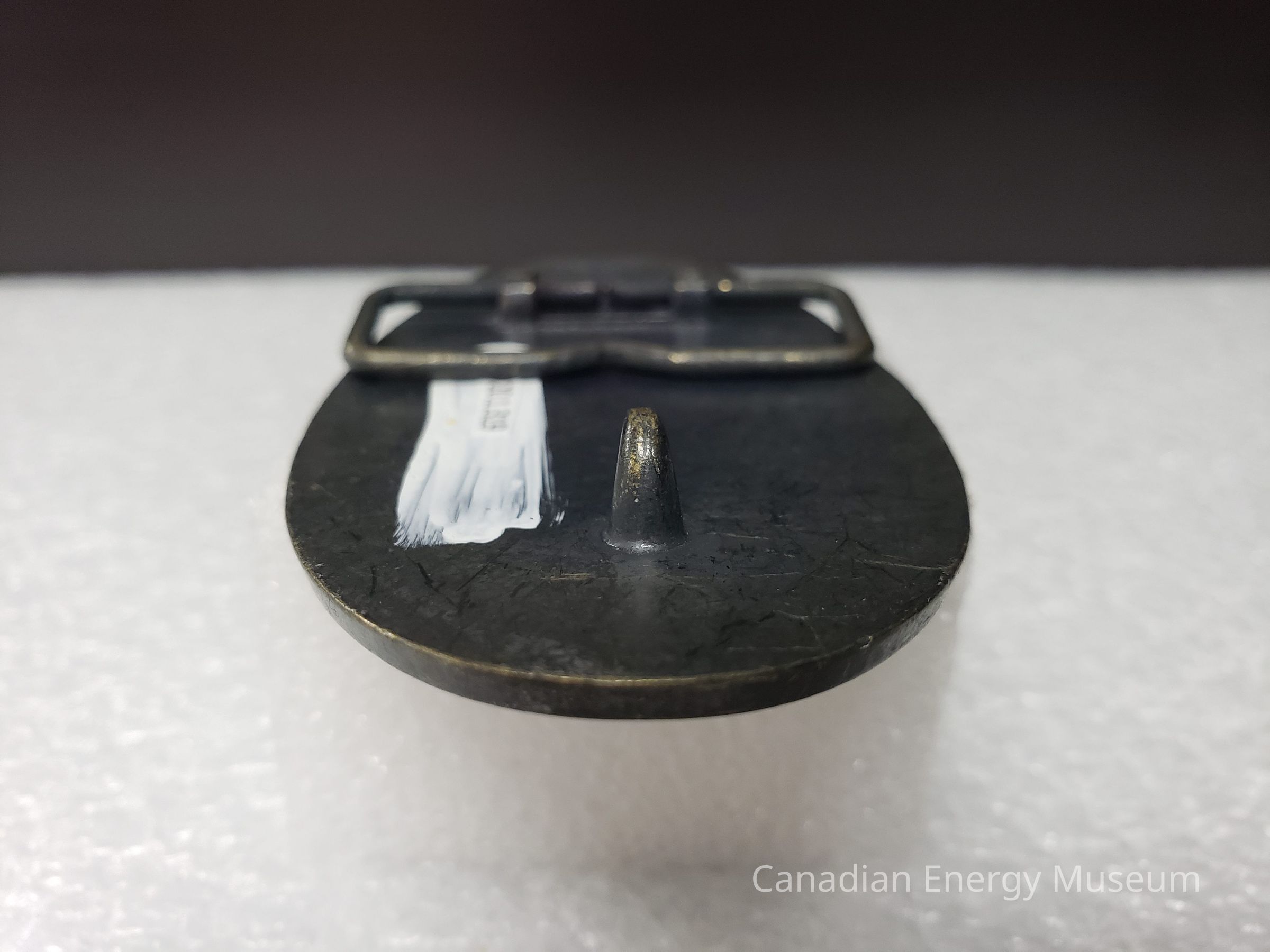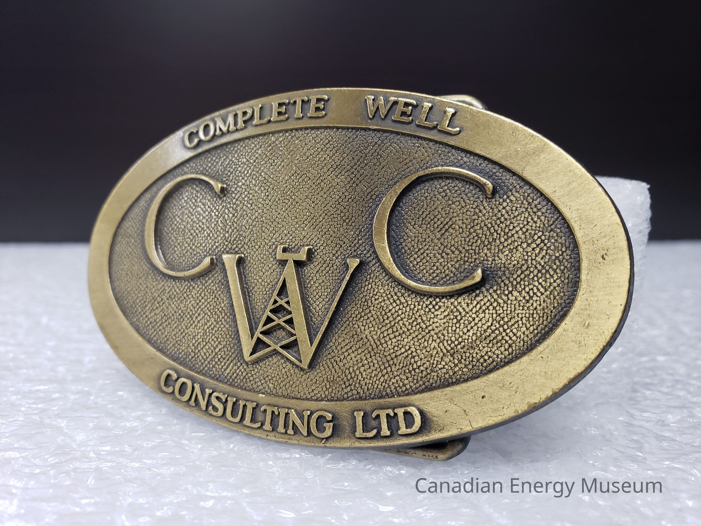 Old Description (Kelsey Dalrymple, 3 June 2020): Complete Well Consulting Ltd. Oval brass belt buckle. W is in the shape of a rig.Collection