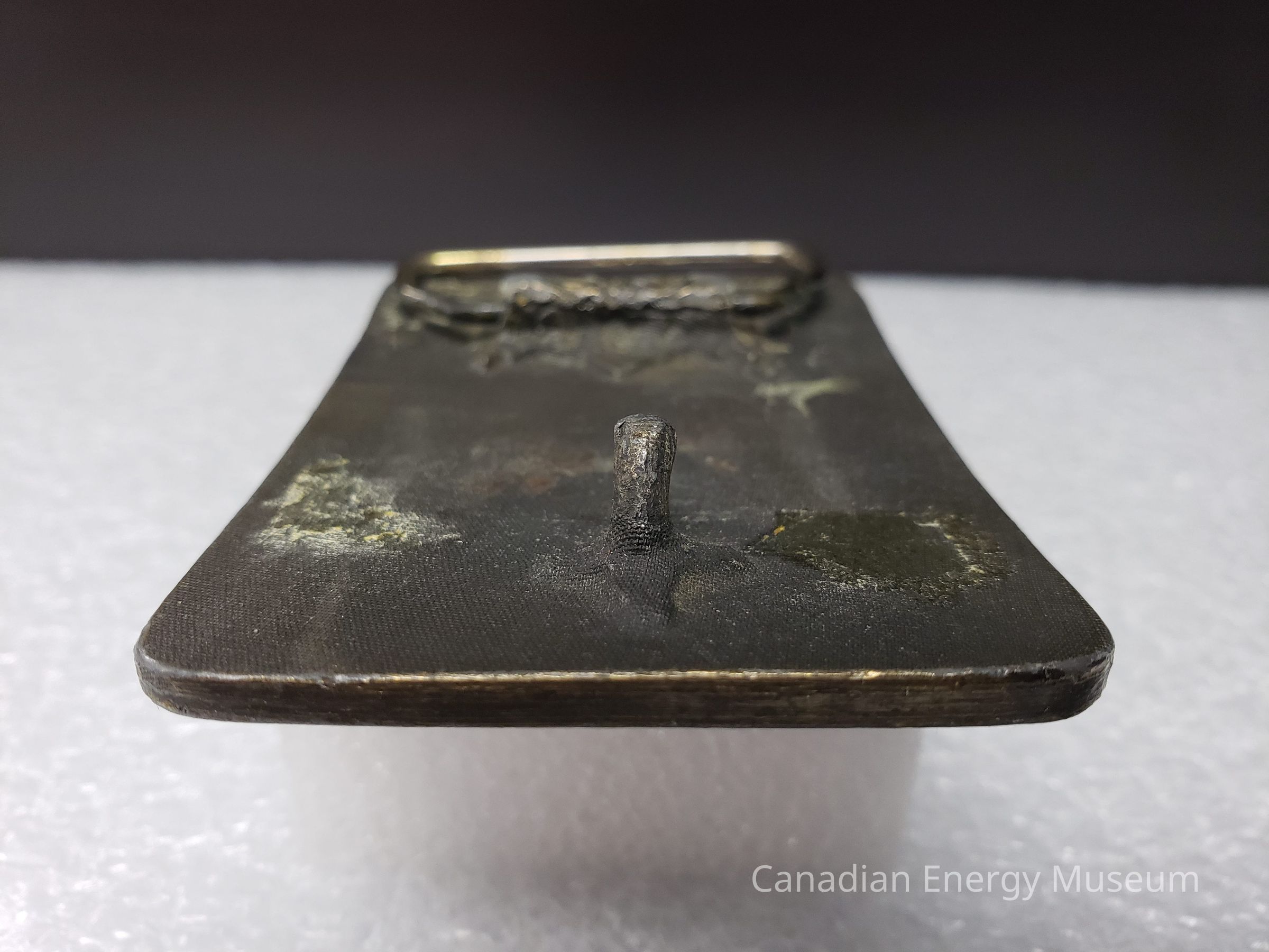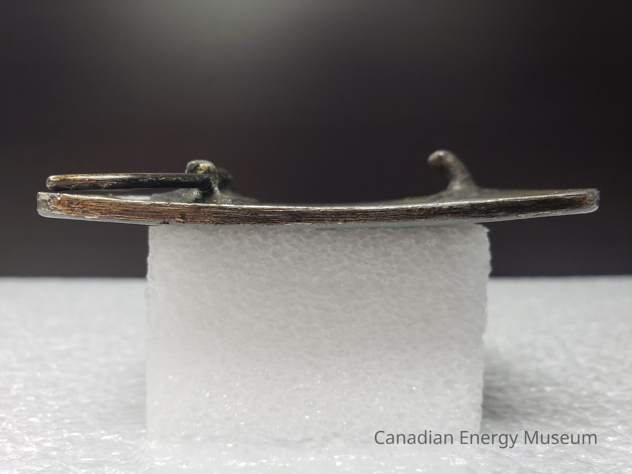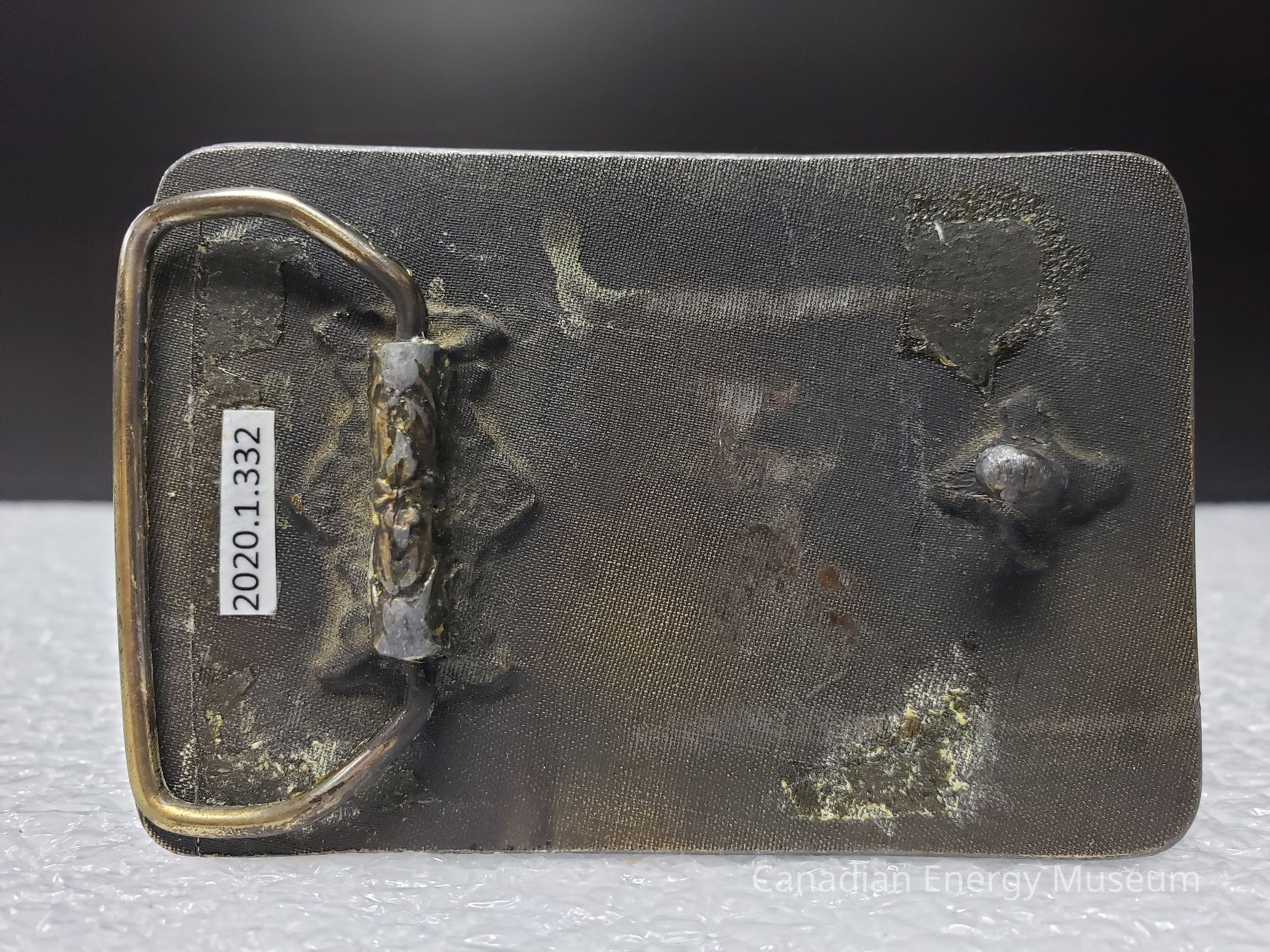 Front: The front of the buckle is worn and discoloured. the buckle used to be an antique bronze and is now a silver. Background is very faded and discoloured. Small scrapes and scratches over the front face of the buckle.