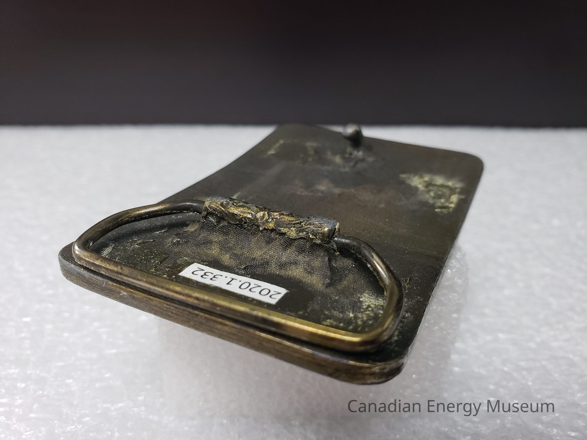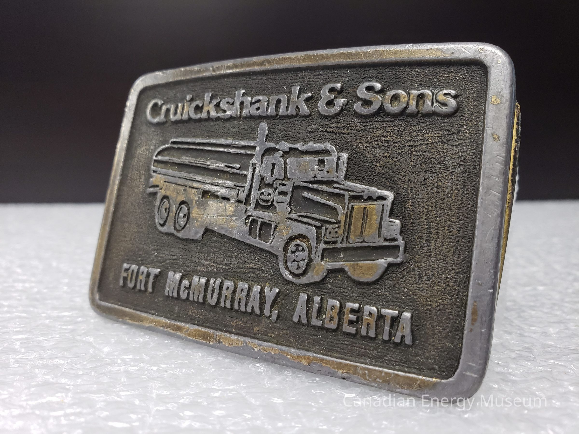 Old Description (Kelsey Dalrymple, 3 June 2020): Cruickshank & Sons. Fort McMurrary, Alberta. Rectangular brass belt buckle with truck on face.Collection