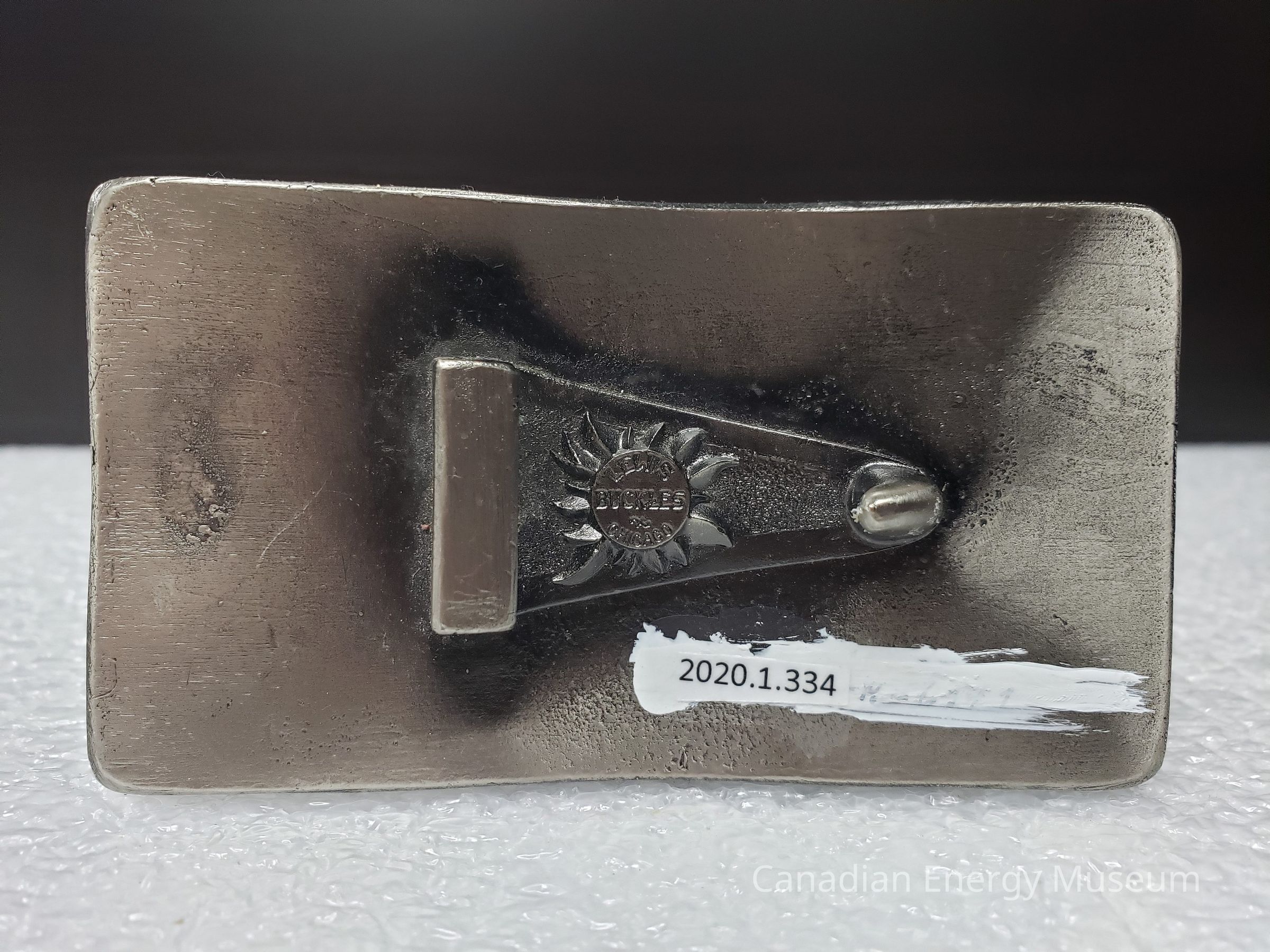 Back Elements: In the centre of the buckle is a raised triangle with curved hook on one point. At the other end of the triangle is a large rectangle block where the hinge used to be attached. In the centre of the triangle is a raised image of a sun. In the centre of the sun is small engraved text "LEWIS BUCKLES CHICAGO".