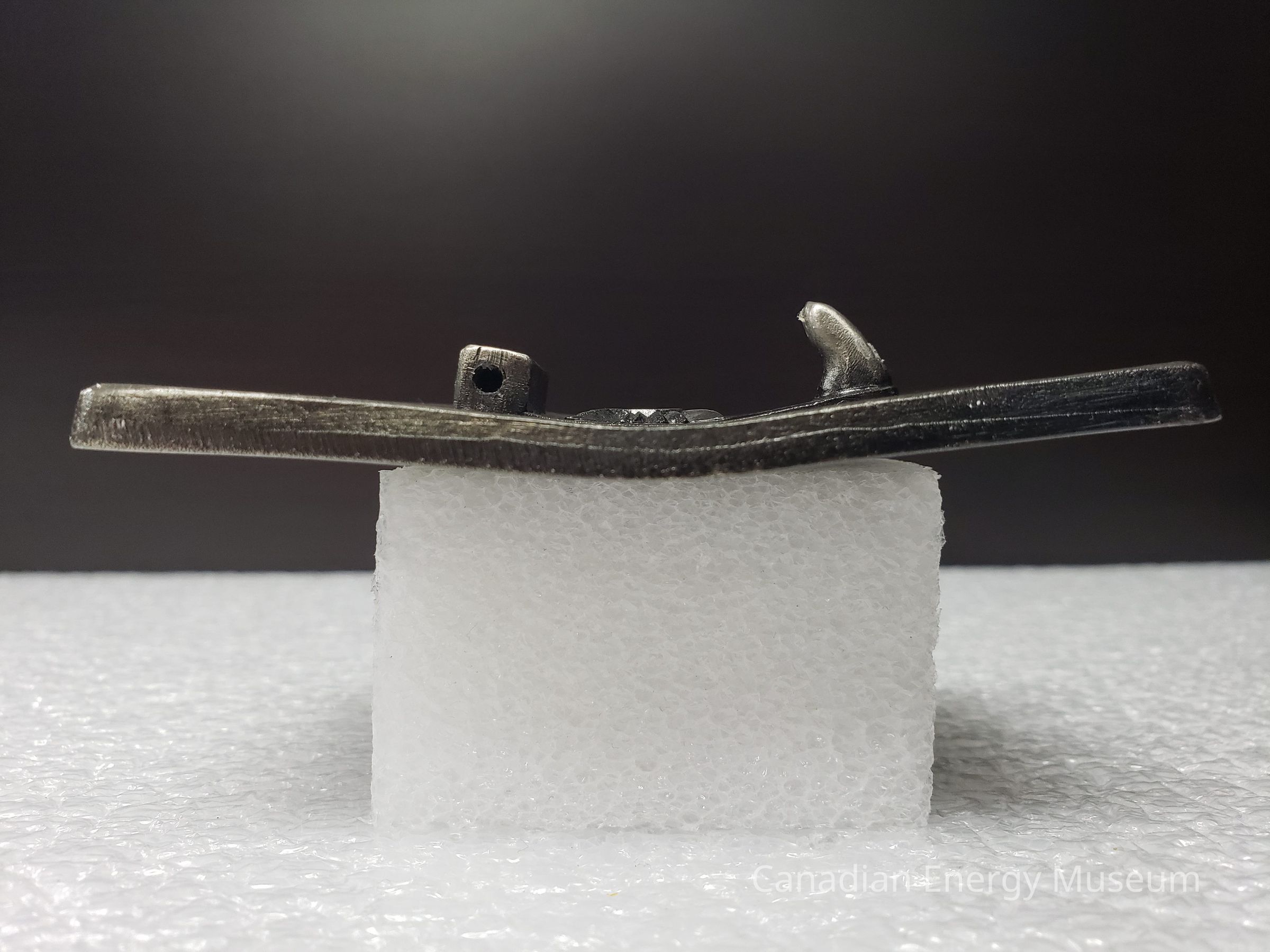 Back: Is discoloured towards the centre of the buckle. Corners of the back of the buckle are worn down. Small dent shaped like an oval on the left edge of the buckle. The hinge has been removed or broken off.Mechanism