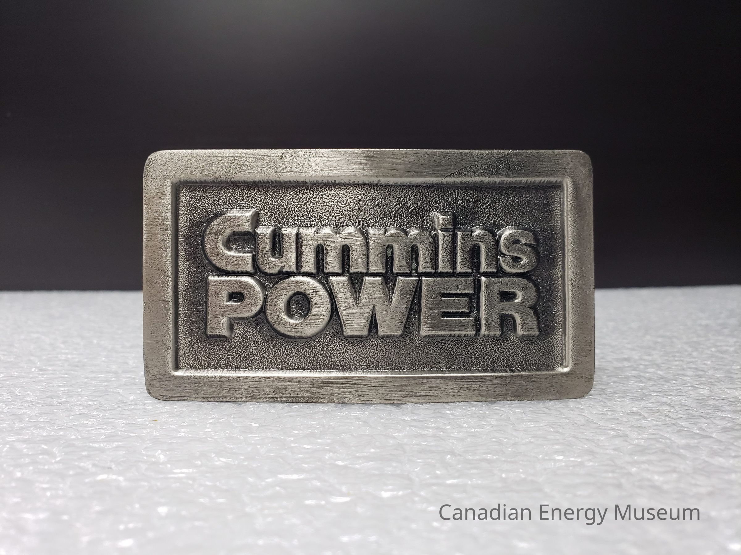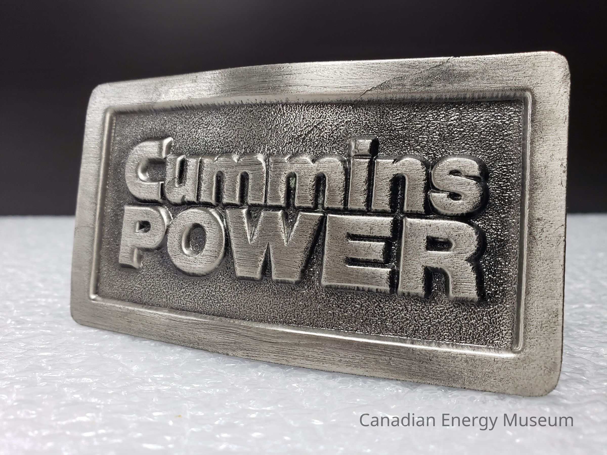 Old Description (Kelsey Dalrymple, 3 June 2020): Cummins Power. Rectangular pewter belt buckle.Collection