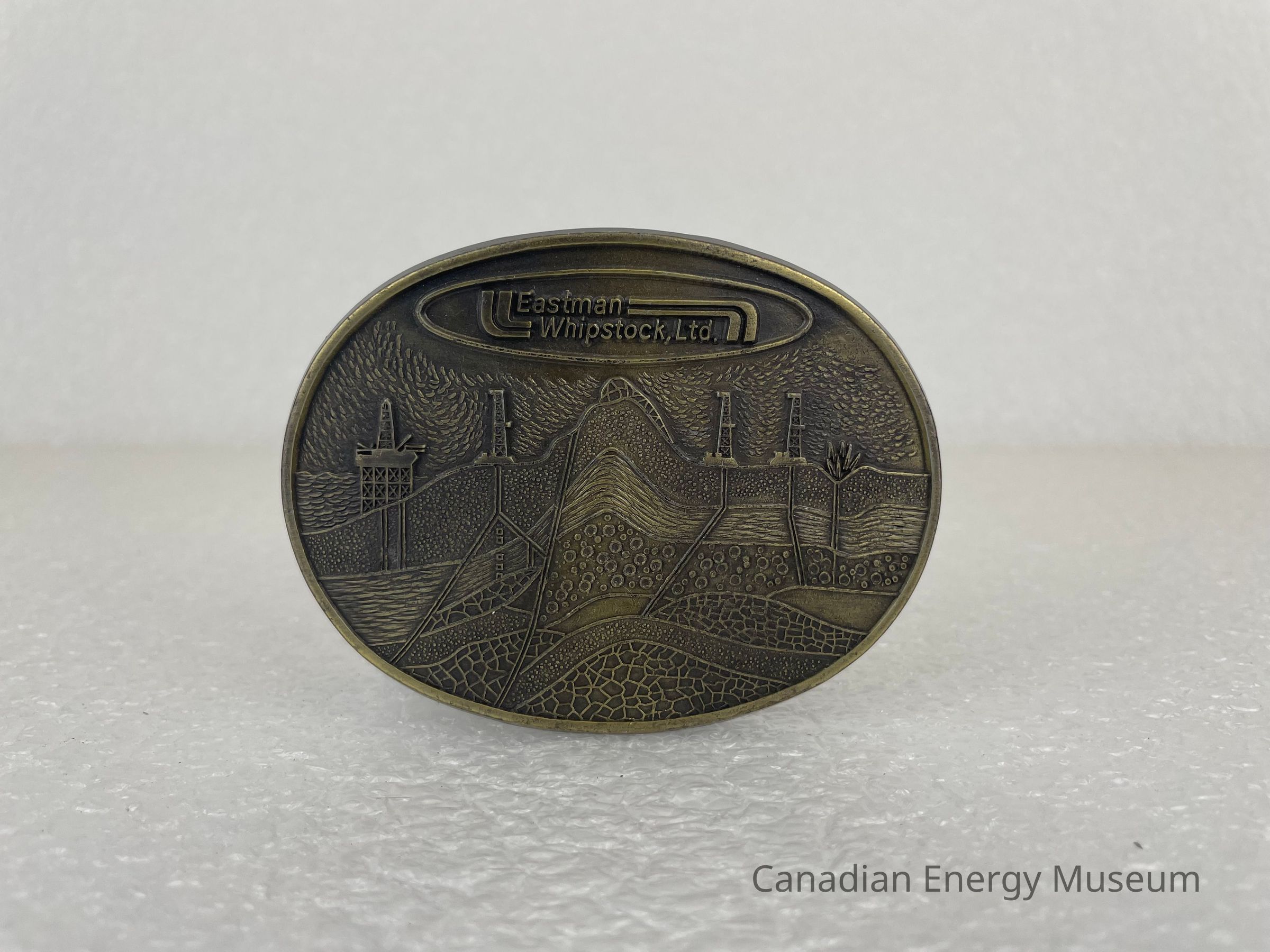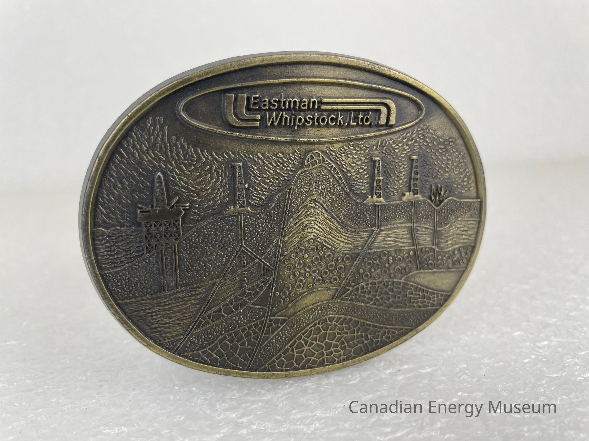 Front Design: A bronze border runs around the edge, with a recessed and textured interior surface. The buckle features a textured scene of an oil site with multiple derricks, and it leads to the underground. The top of the buckle features an oval with text reading, "Eastman Whipstock, Ltd."